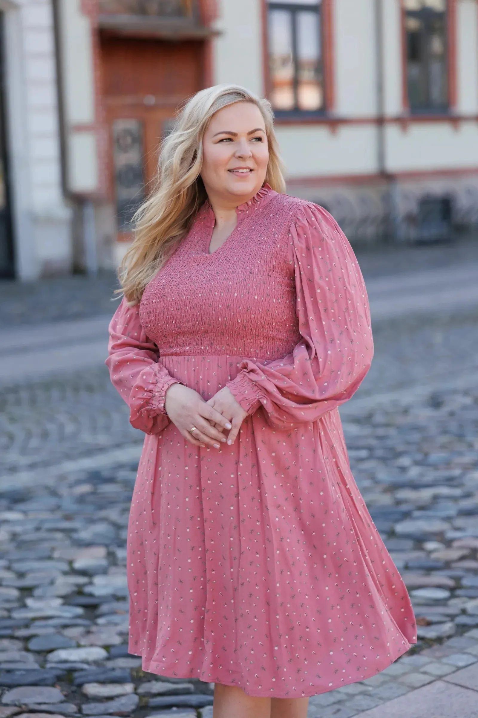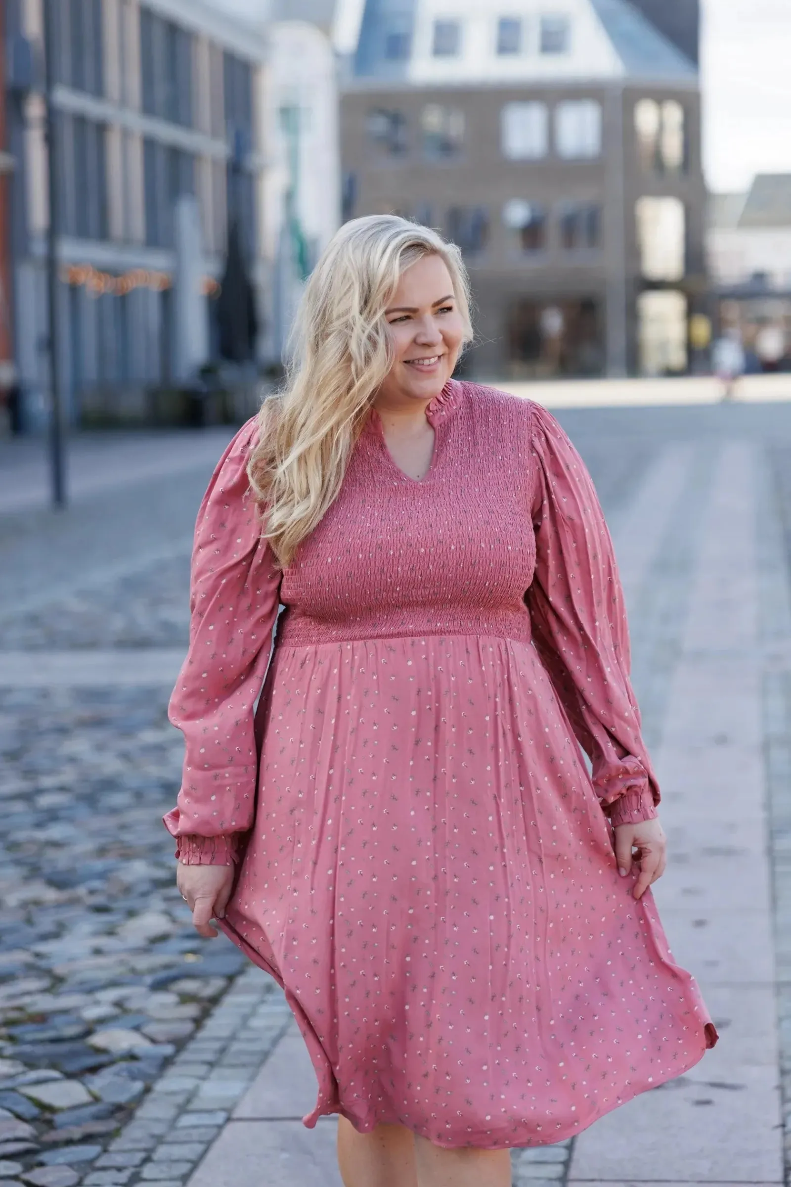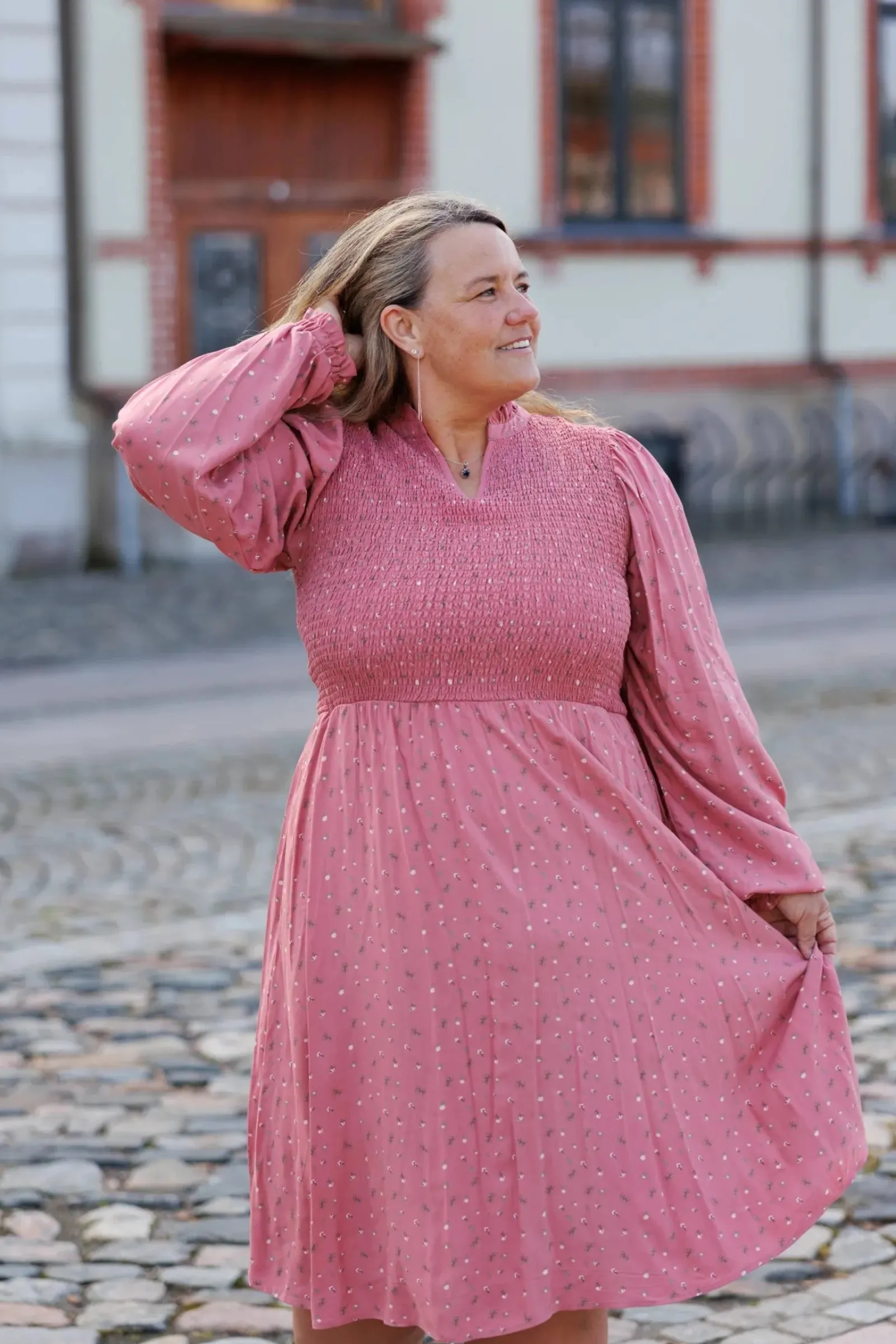 Ada er «lillesøsteren» til Anna med nydelige detaljer ved halsen. Den har volangkrage og en liten v-utringing.Smock rundt hele brystet og et lett og luftig skjørt som skaper en flatterende fasong. Praktiske lommer på begge sider.