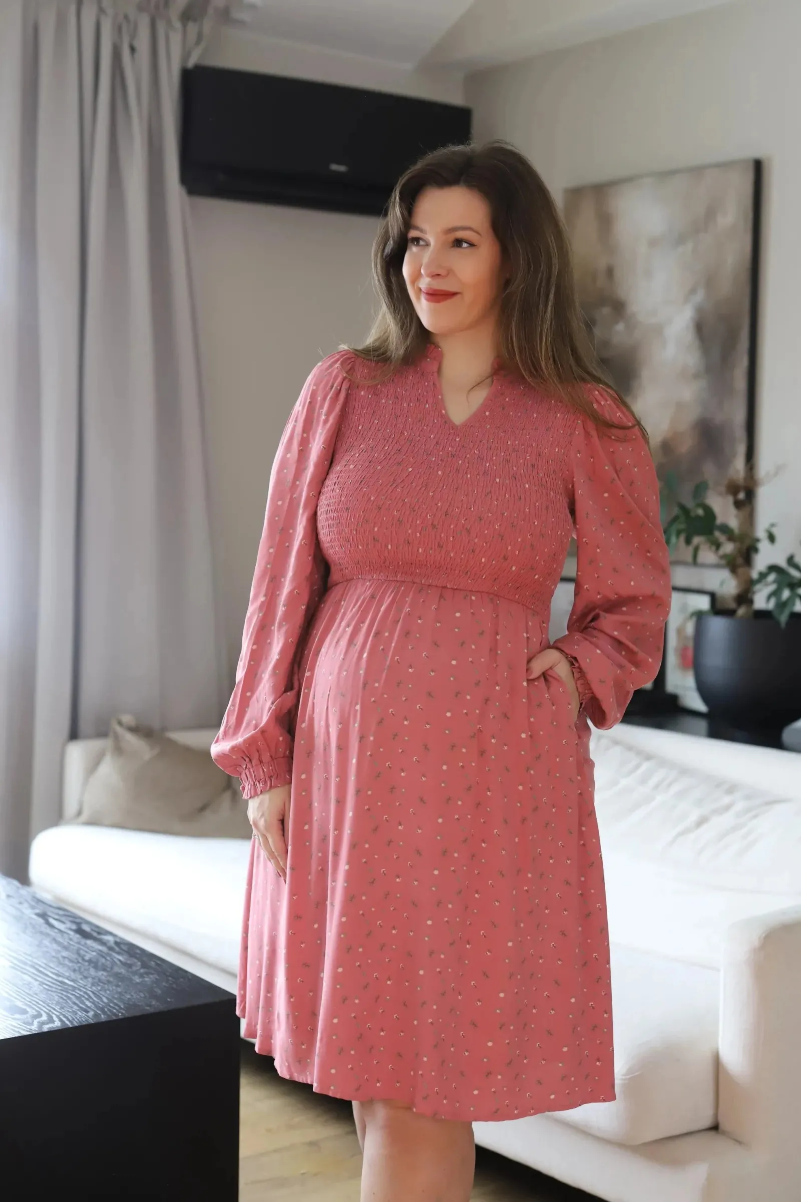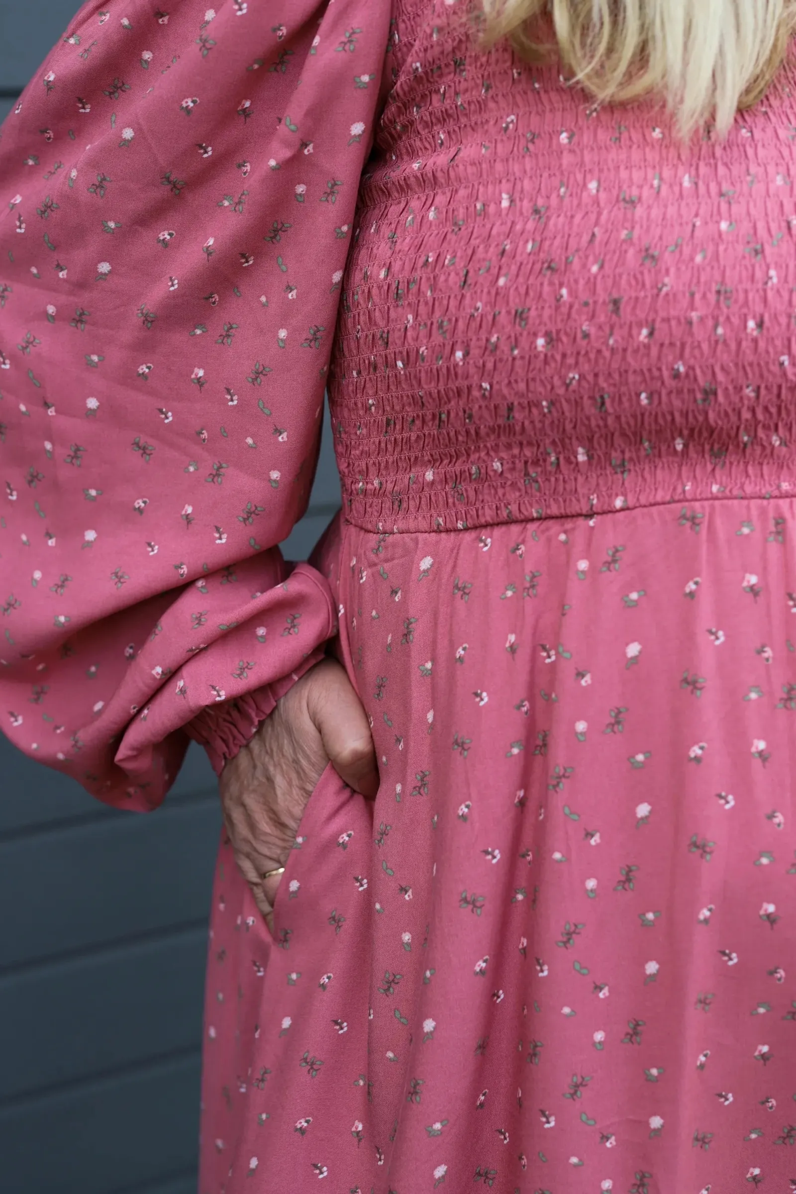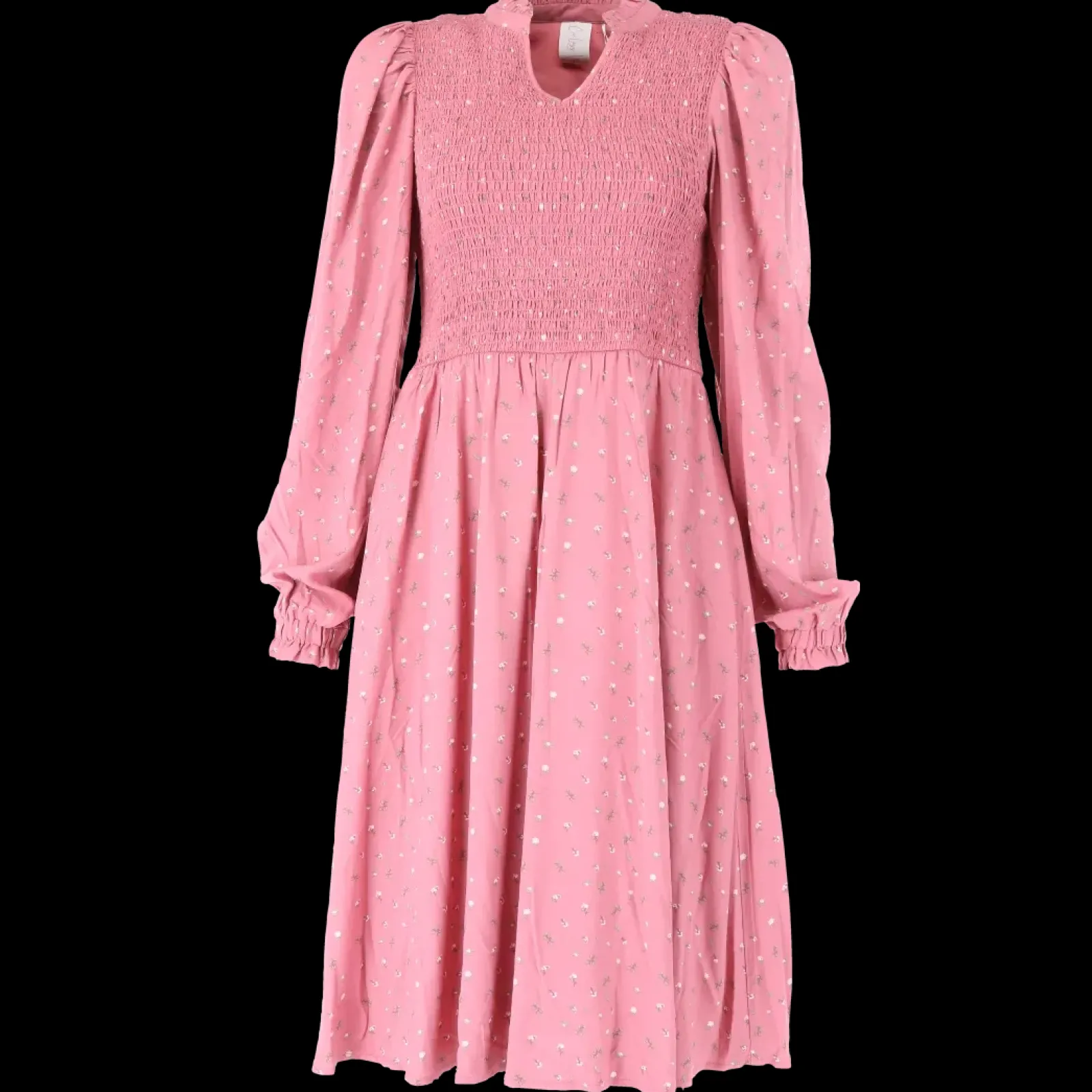 Ada er «lillesøsteren» til Anna med nydelige detaljer ved halsen. Den har volangkrage og en liten v-utringing.Smock rundt hele brystet og et lett og luftig skjørt som skaper en flatterende fasong. Praktiske lommer på begge sider.