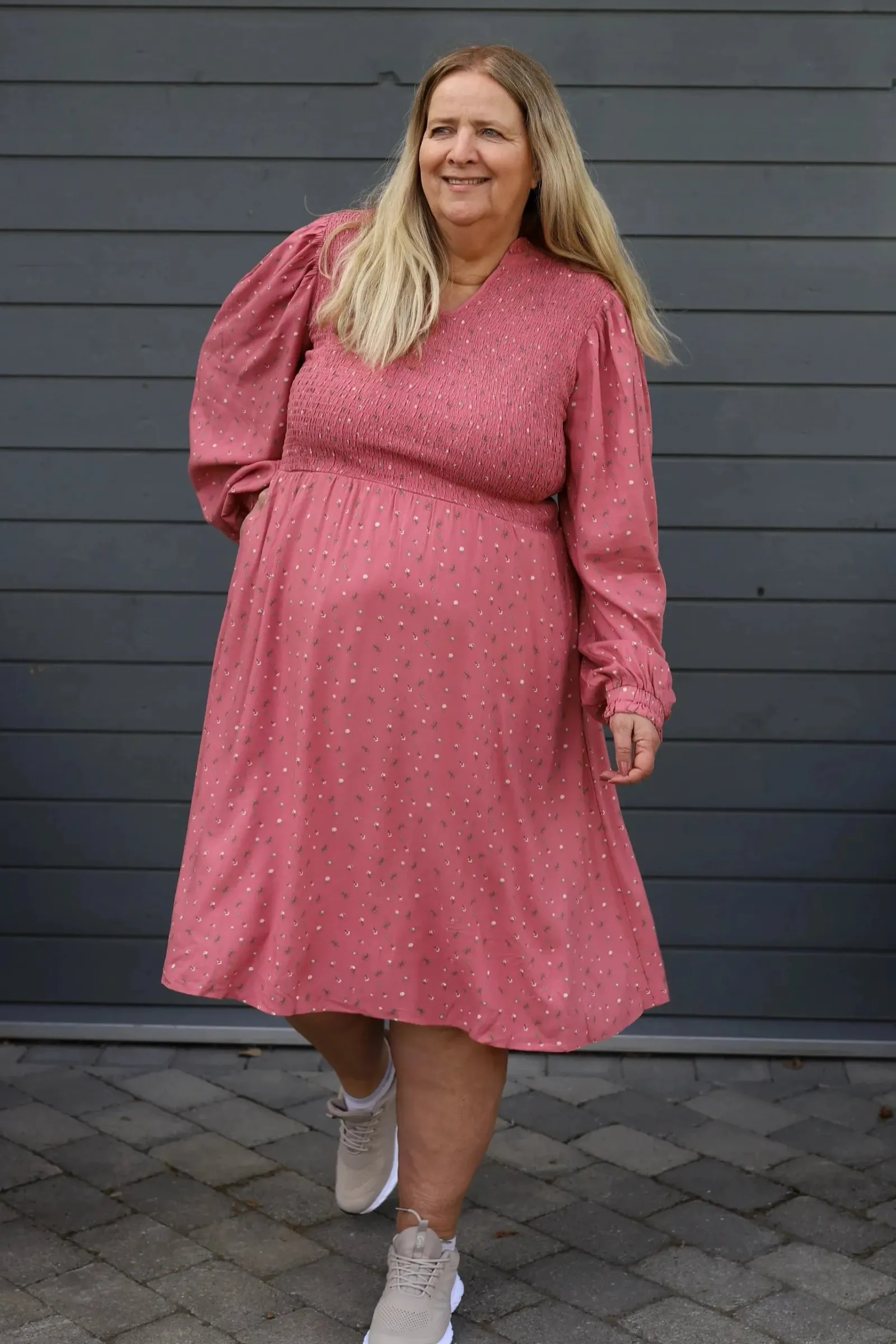 Den er litt lengre enn viskose Anna-kjole og har litt kortere smock. Kan sammelignes med Anna chiffon.
