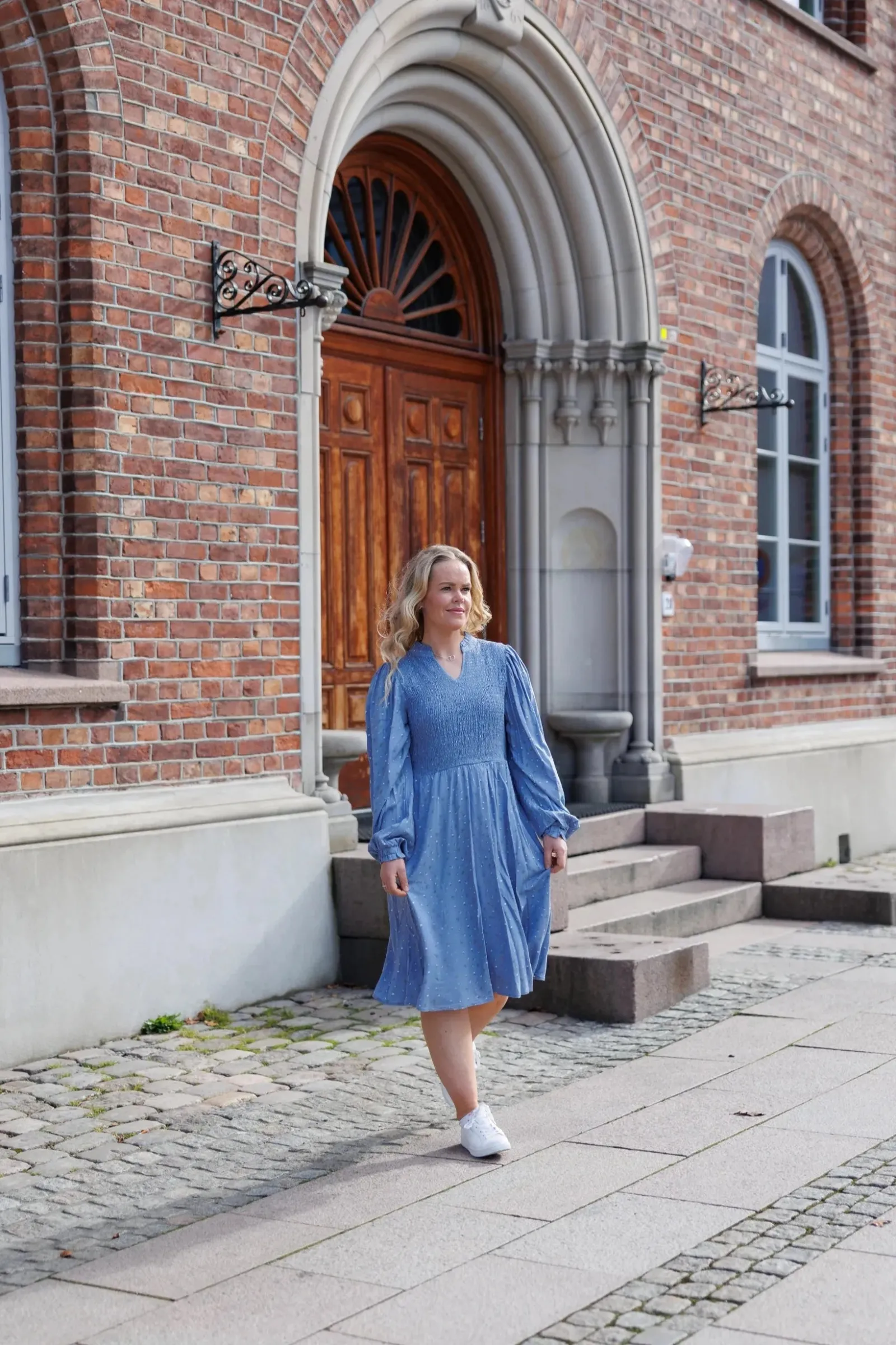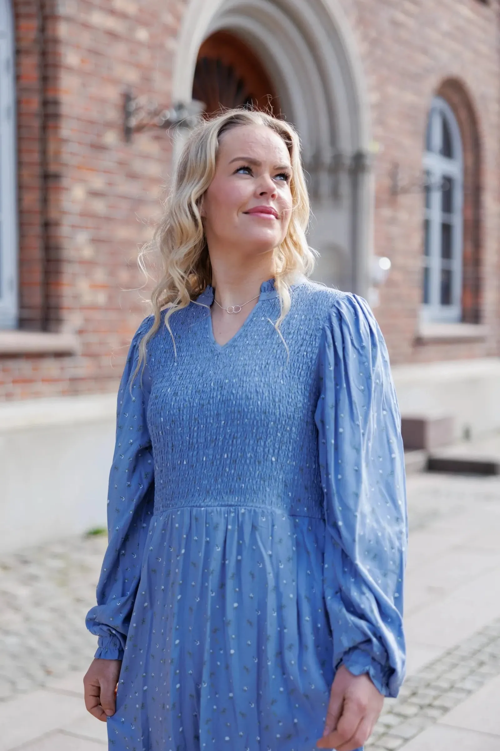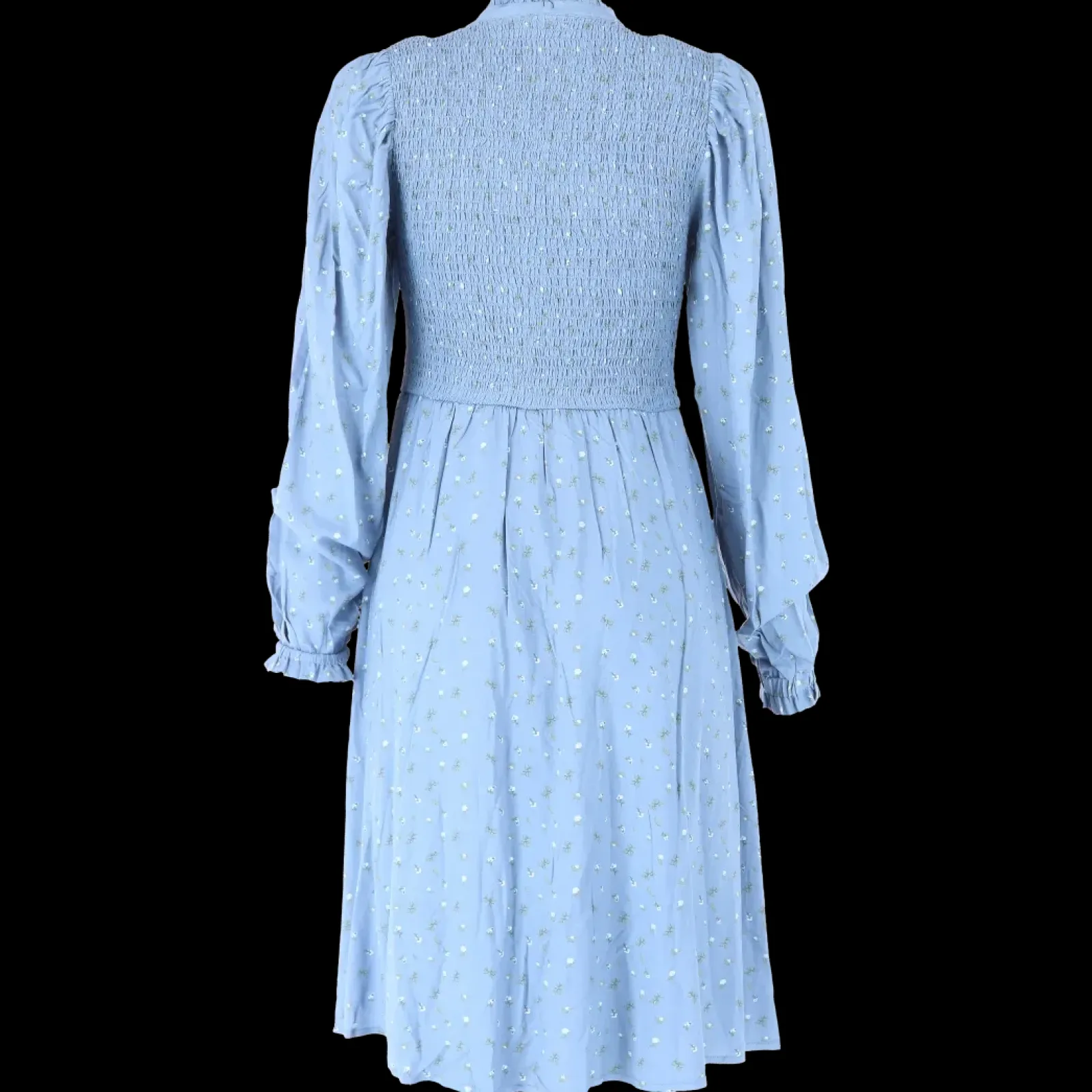 Ada er «lillesøsteren» til Anna med nydelige detaljer ved halsen. Den har volangkrage og en liten v-utringing.Smock rundt hele brystet og et lett og luftig skjørt som skaper en flatterende fasong. Praktiske lommer på begge sider.