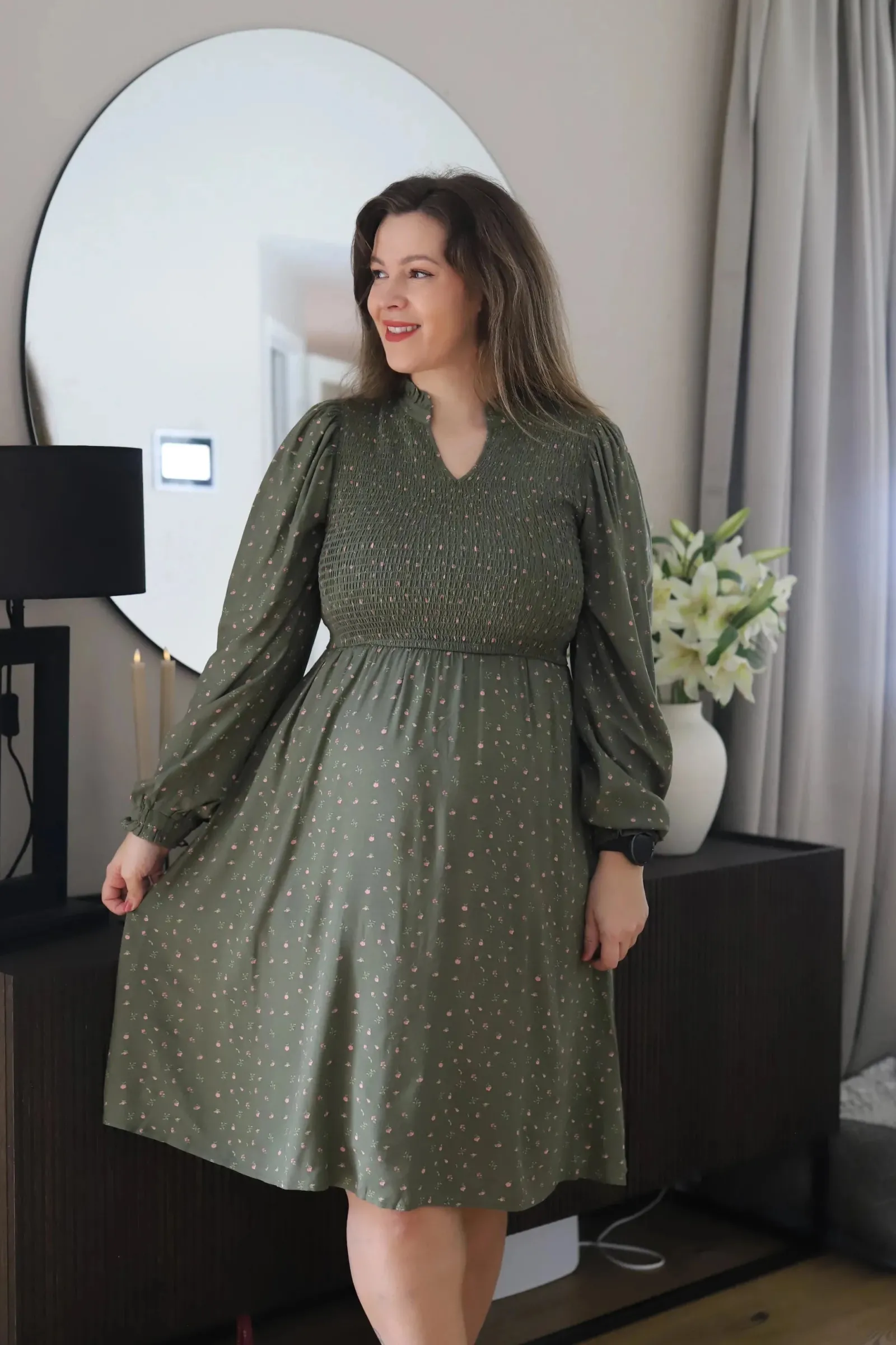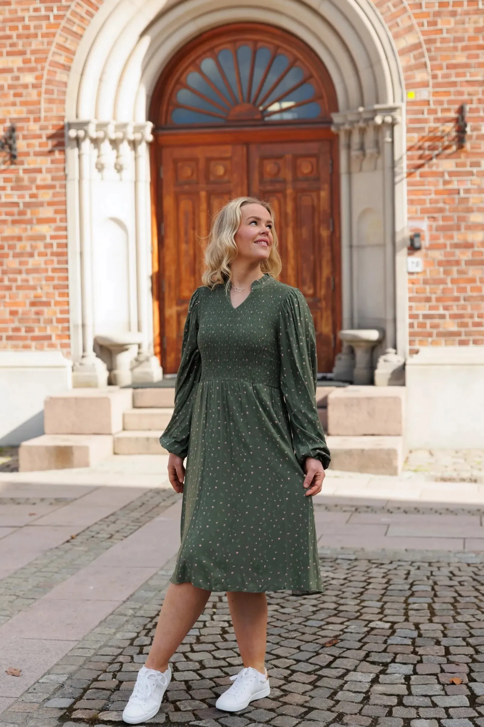 Ada er «lillesøsteren» til Anna med nydelige detaljer ved halsen. Den har volangkrage og en liten v-utringing.Smock rundt hele brystet og et lett og luftig skjørt som skaper en flatterende fasong. Praktiske lommer på begge sider.