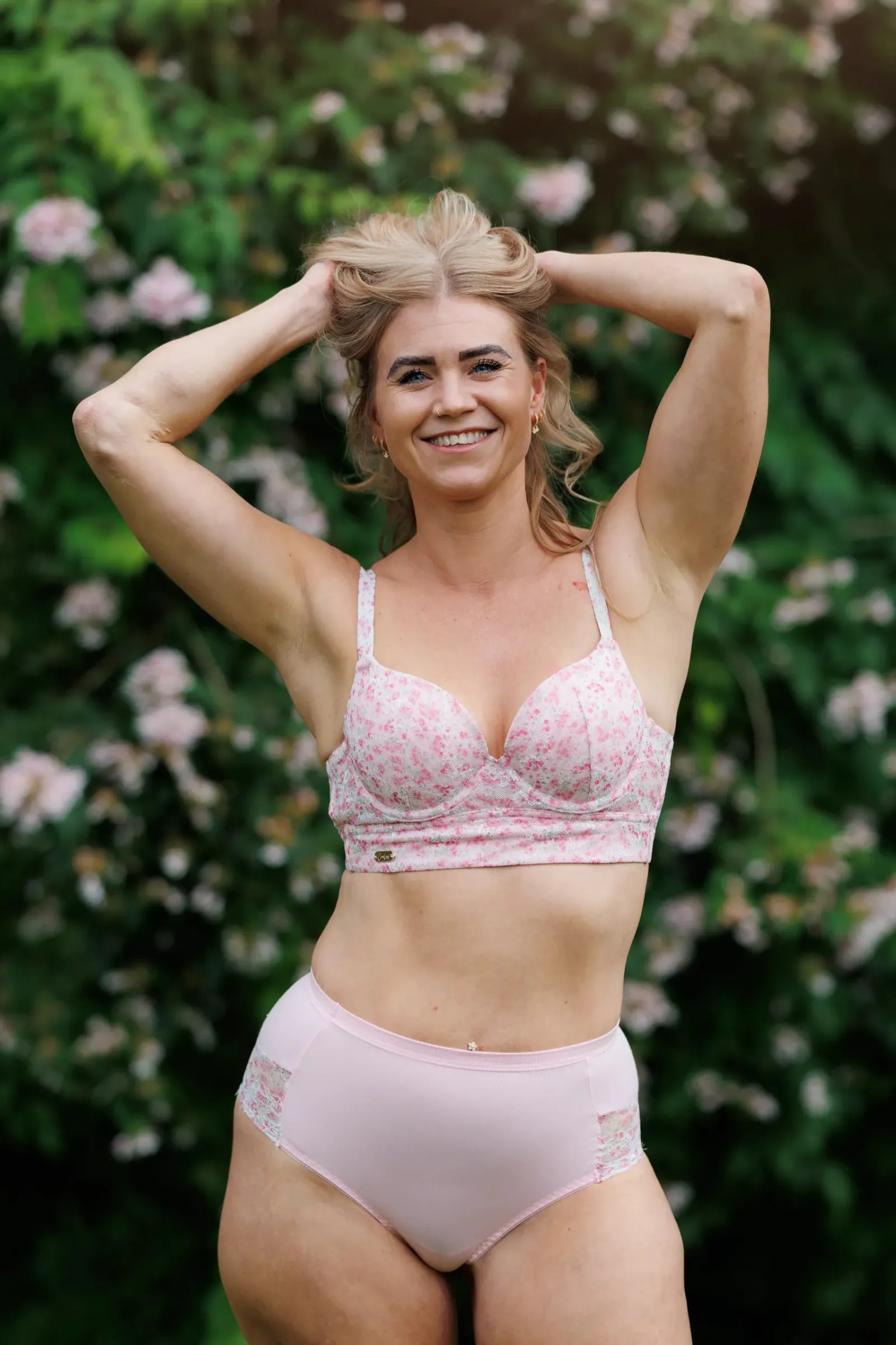 Afrodite Small cup i lyserosa er en BH med bøyle og mye push-up i innleggene. Den er i full blonde med et nydelig blomstermønster trykket i stoffet med flott fargespill. Ment som en mer sexy versjon av vårt undertøy. Det er ikke mulig å ta ut innleggene da de har fast padding.