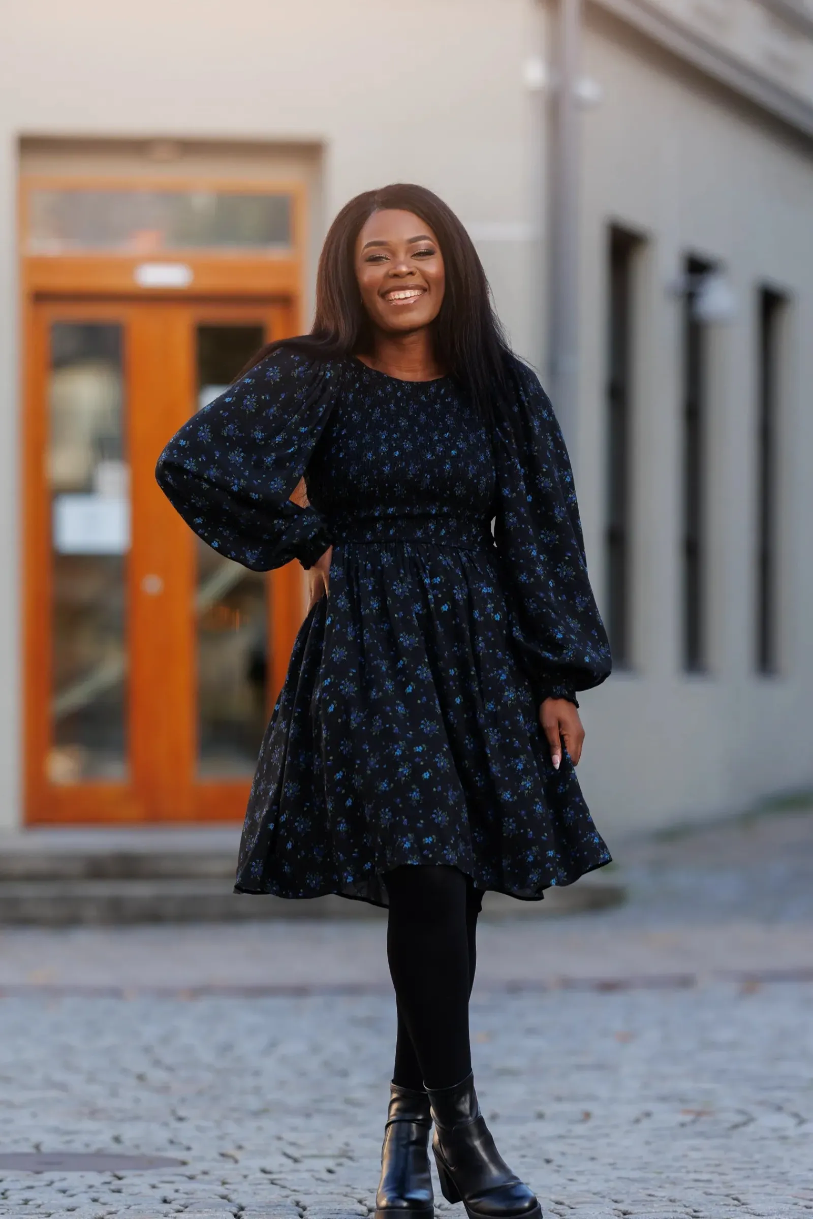 Anna kjole i mørk blå med nydelig blomstermønster som virkelig fanger blikket!