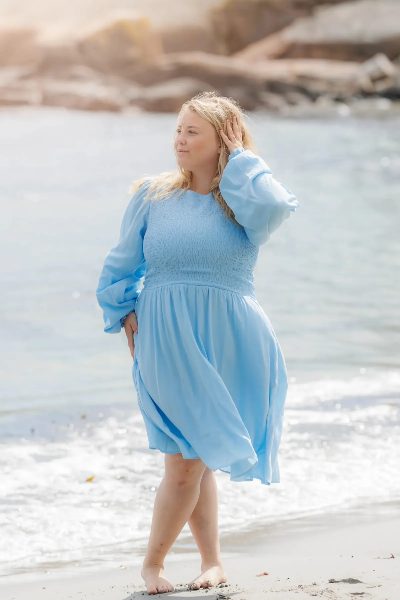 Anna avsluttes med strikk ved håndleddet og i livet. Den har også smock rundt hele front og rygg for en god tilpasningsevne. Lommer på begge sider.