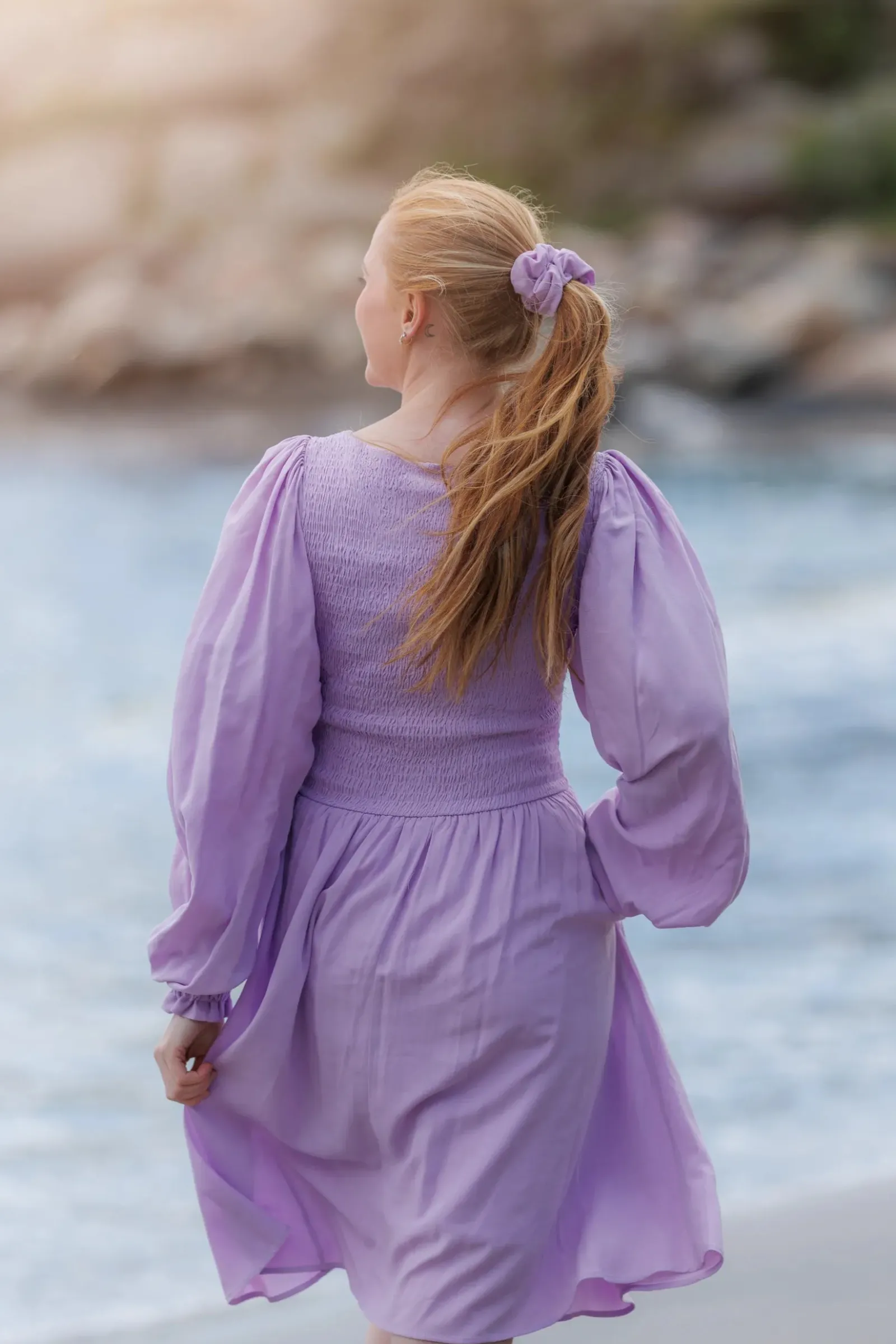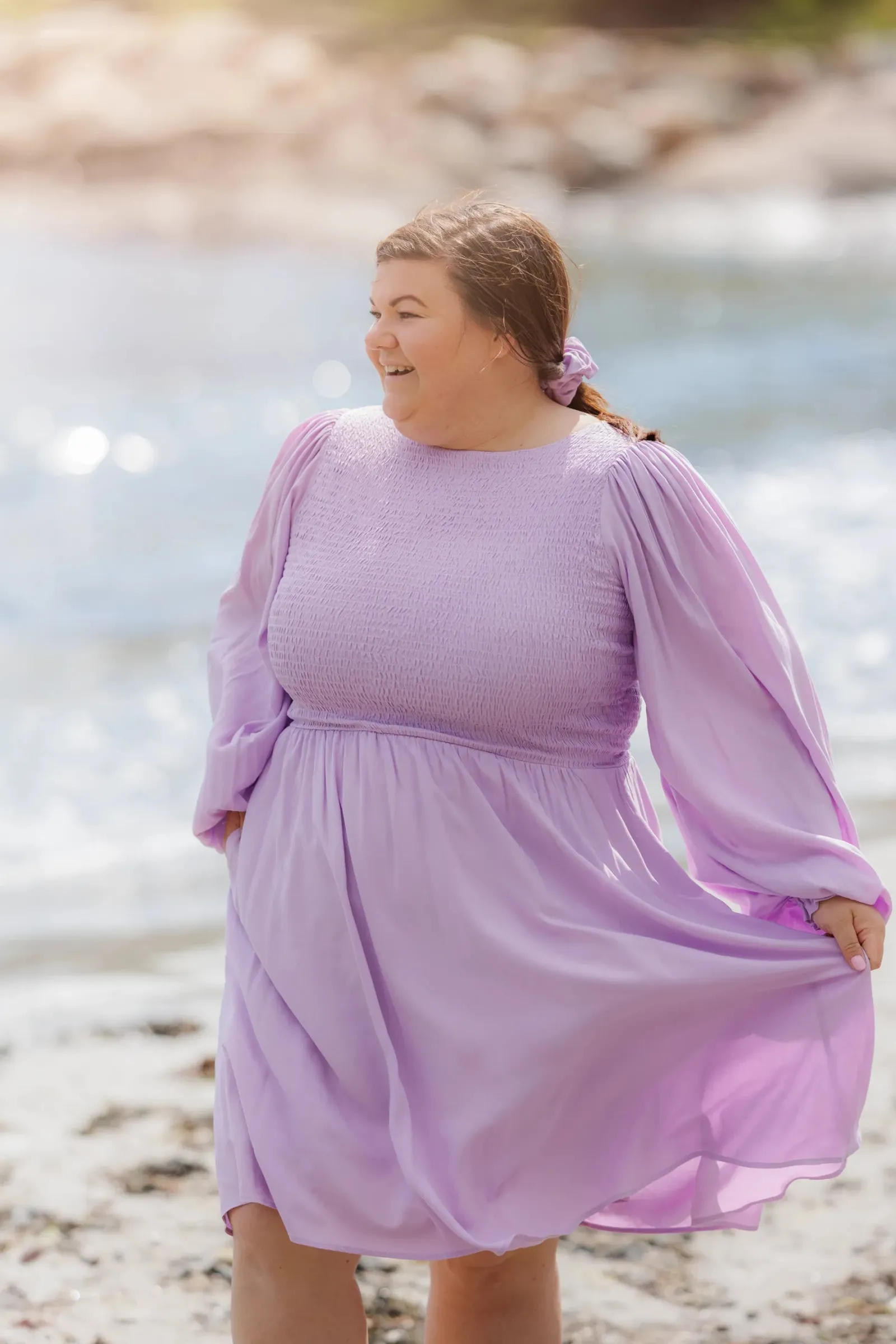 Ensfarget Anna kjole i lilla med nydelige snitt og lekre ballongermer kan den brukes både til hverdager og festdager.
