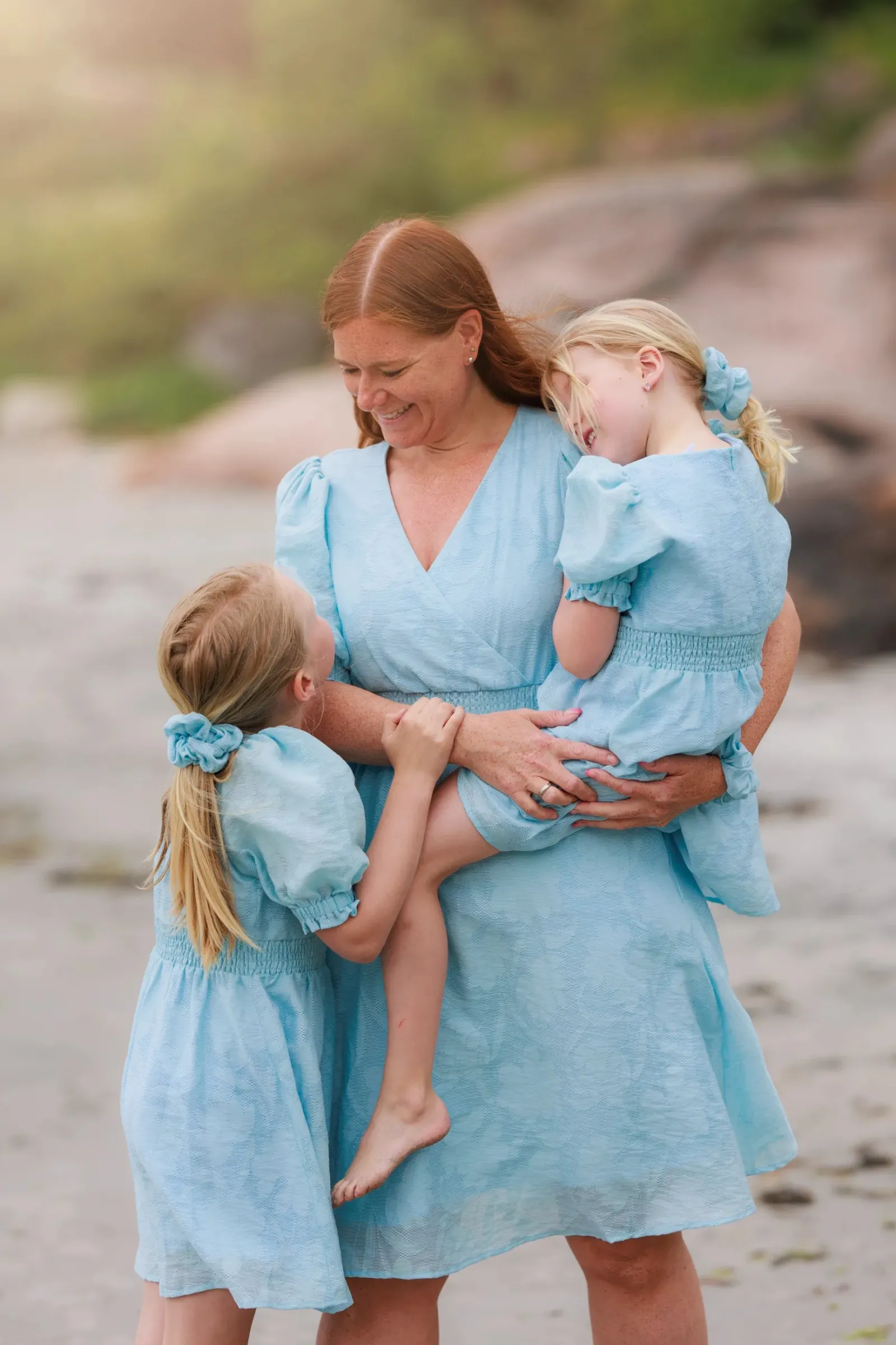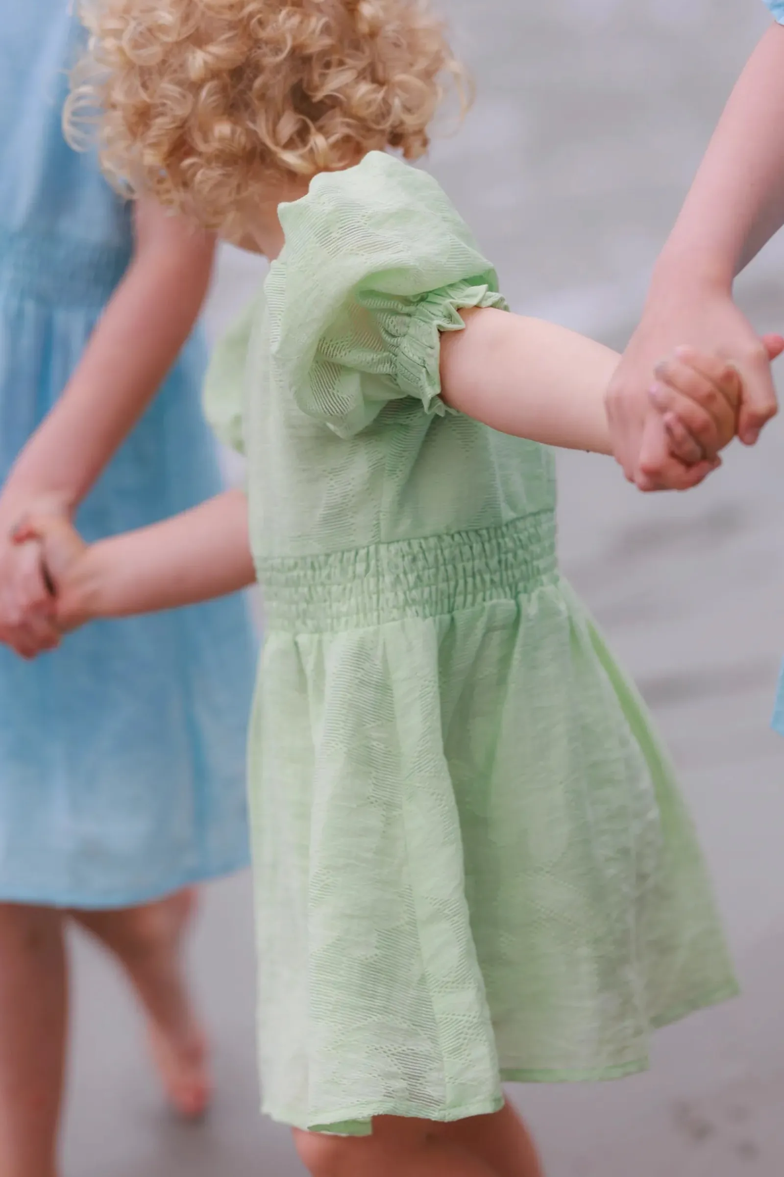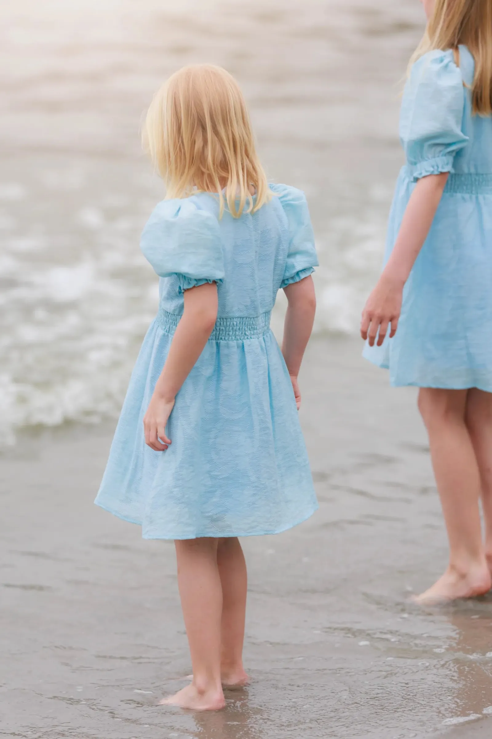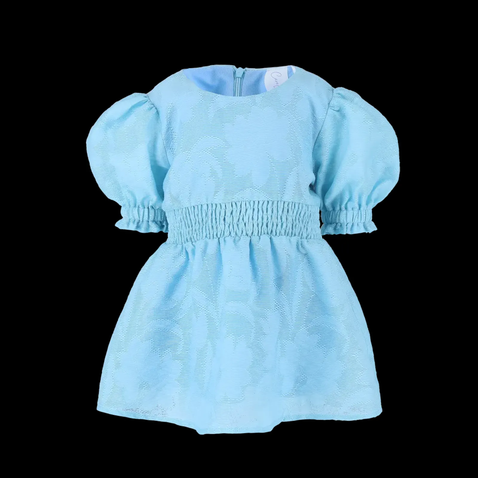 Belle Flower barnekjole i lyseblå er en nydelig, kort sommerkjole. Stoffet har tekstur av blomster og oppleves luftig. Den har korte armer med puff og strikk. I midjen er det et behagelig strikk og på hver side av hoftene er det praktiske lommer. Passer like godt til hverdagen som til finere anledninger.