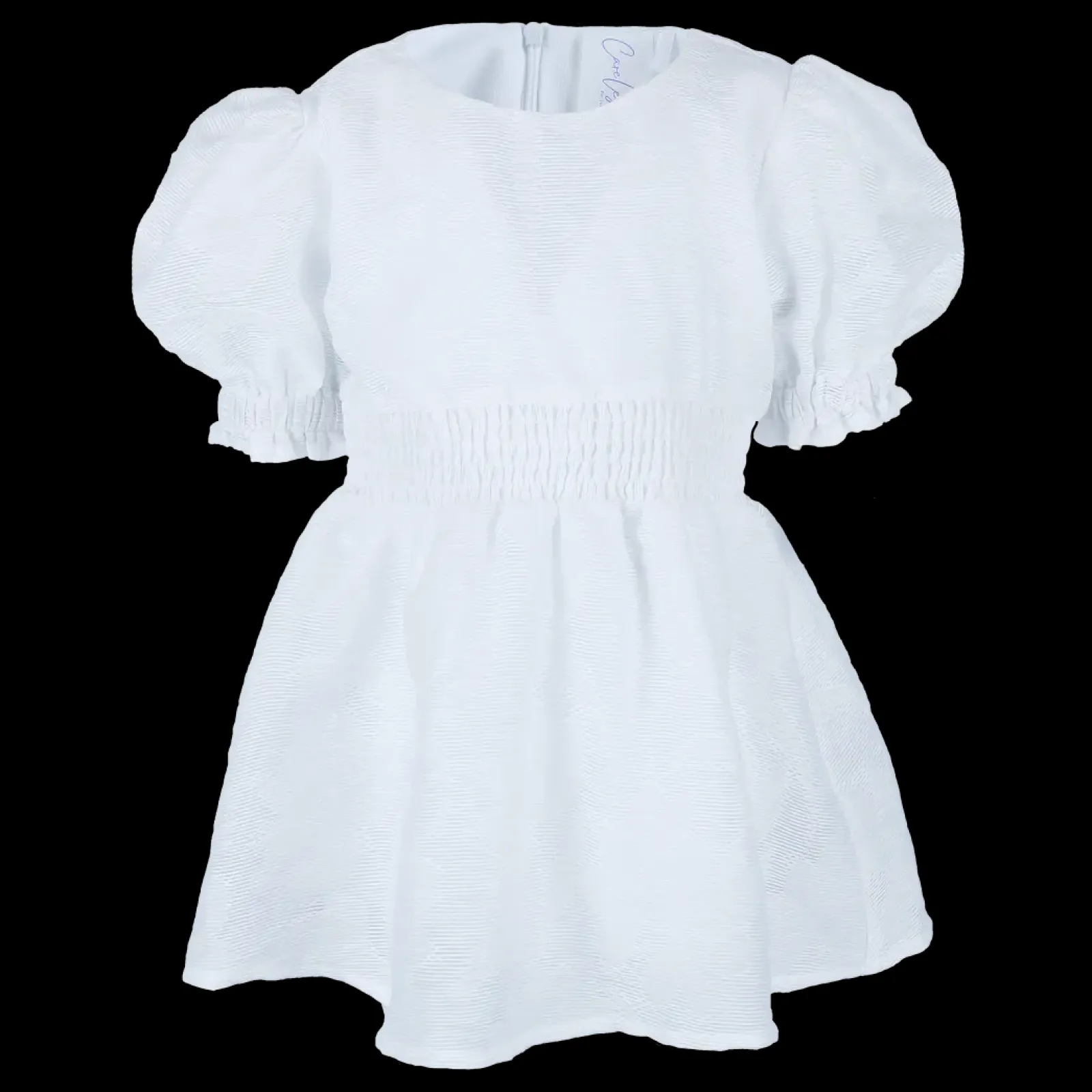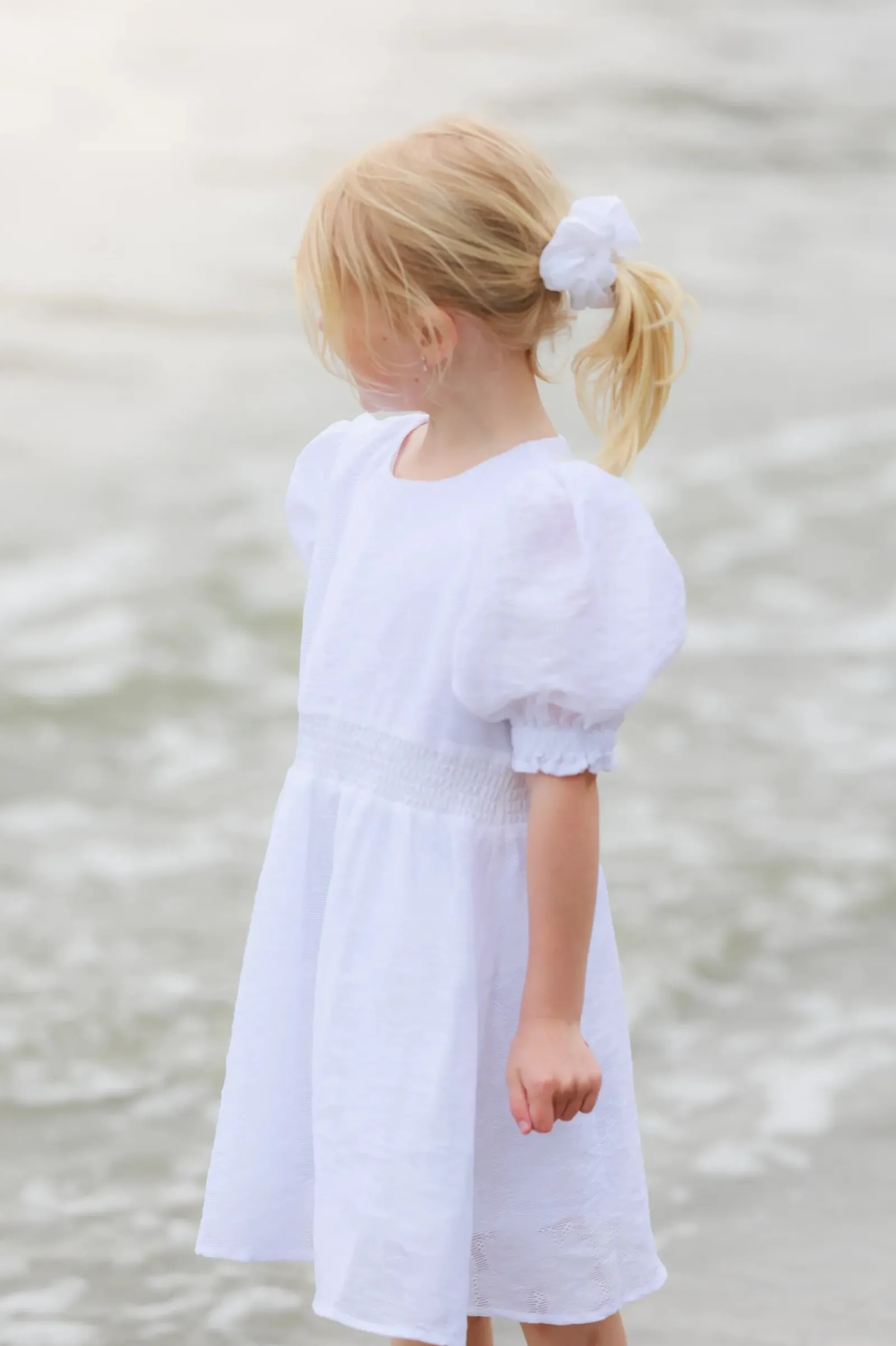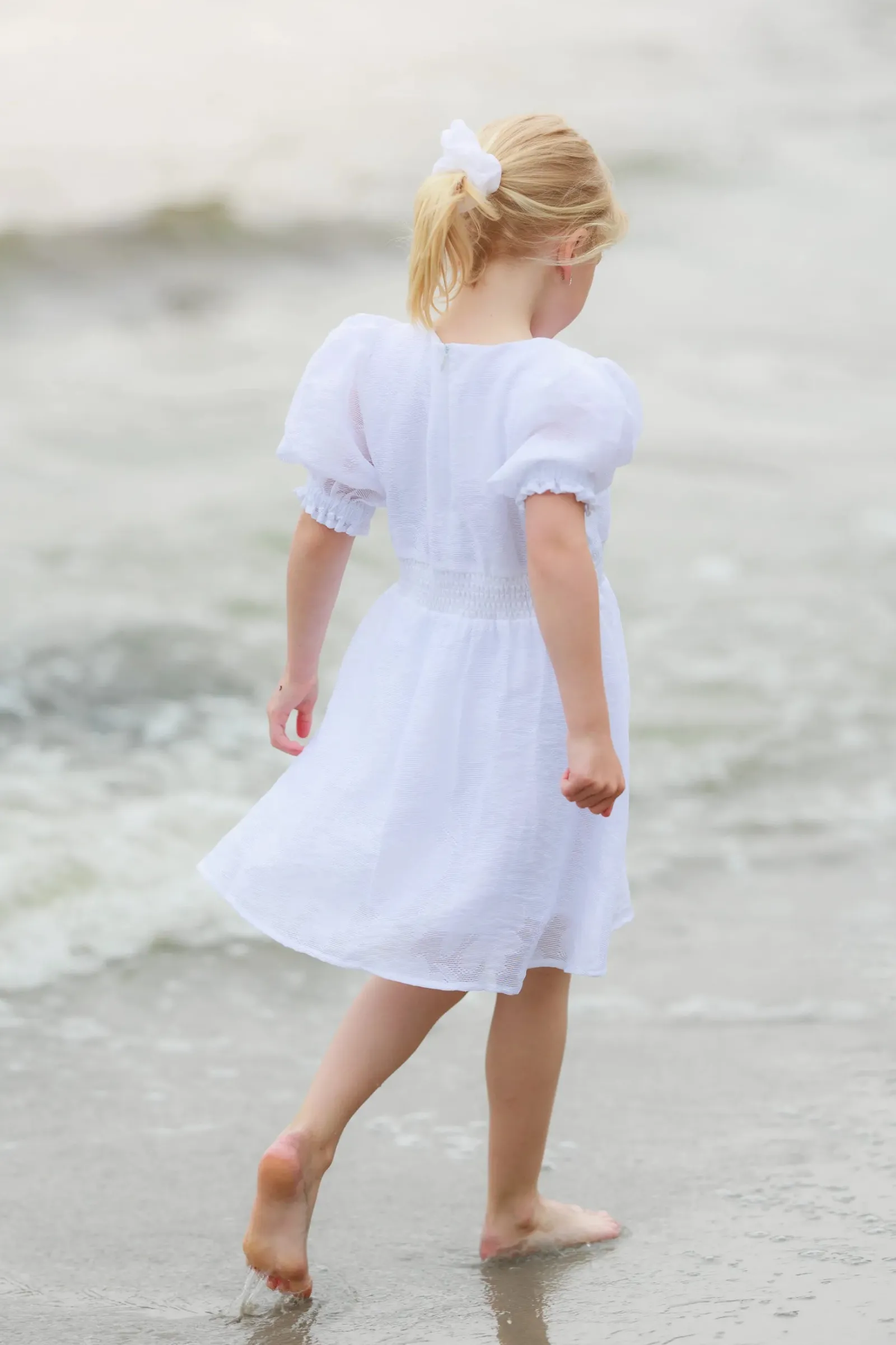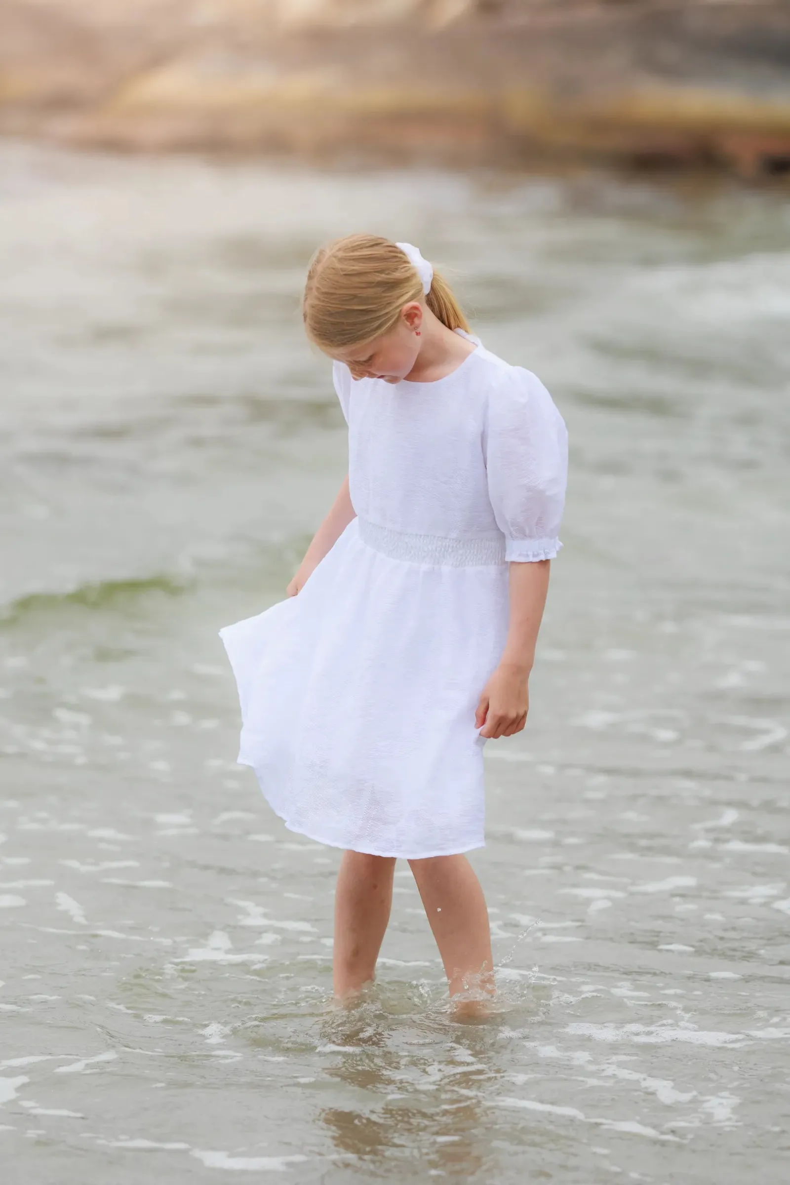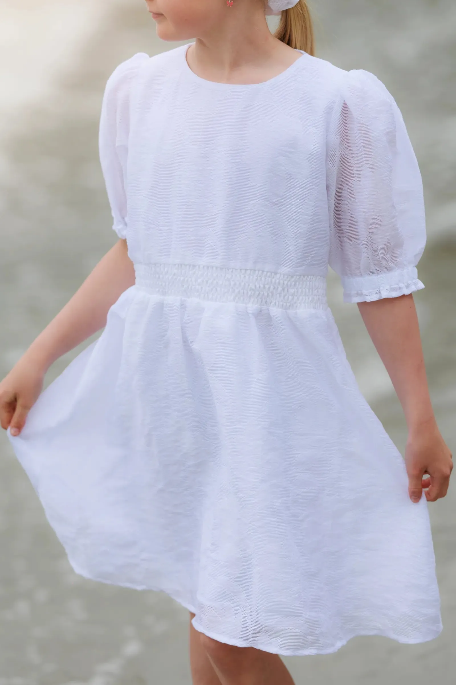 Belle Flower barnekjole i hvit er en nydelig, kort sommerkjole. Stoffet har tekstur av blomster og oppleves luftig. Den har korte armer med puff og strikk. I midjen er det et behagelig strikk og på hver side av hoftene er det praktiske lommer. Passer like godt til hverdagen som til finere anledninger.