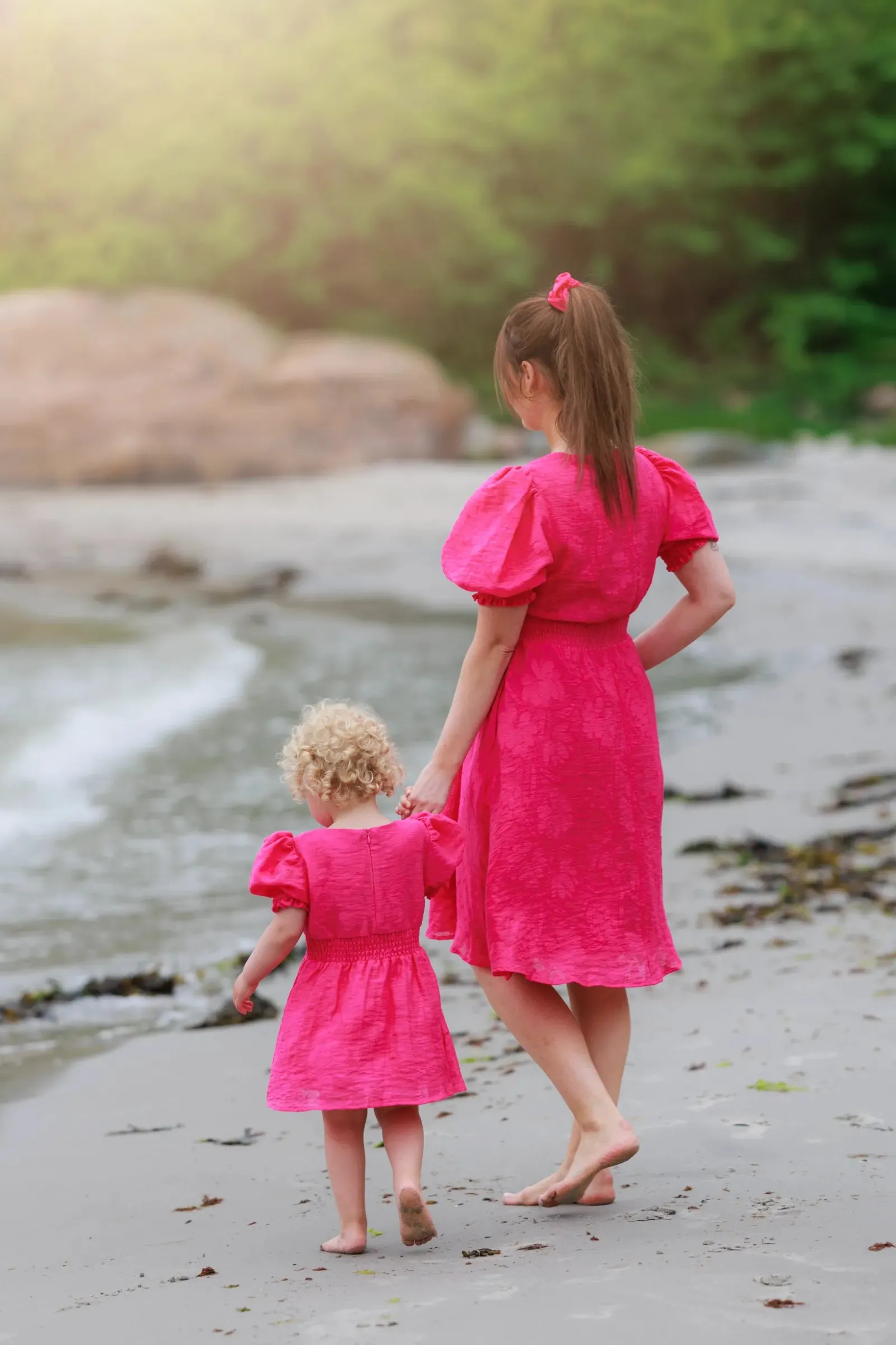 Belle Flower barnekjole i rosa er en nydelig, kort sommerkjole. Stoffet har tekstur av blomster og oppleves luftig. Den har korte armer med puff og strikk. I midjen er det et behagelig strikk og på hver side av hoftene er det praktiske lommer. Passer like godt til hverdagen som til finere anledninger.