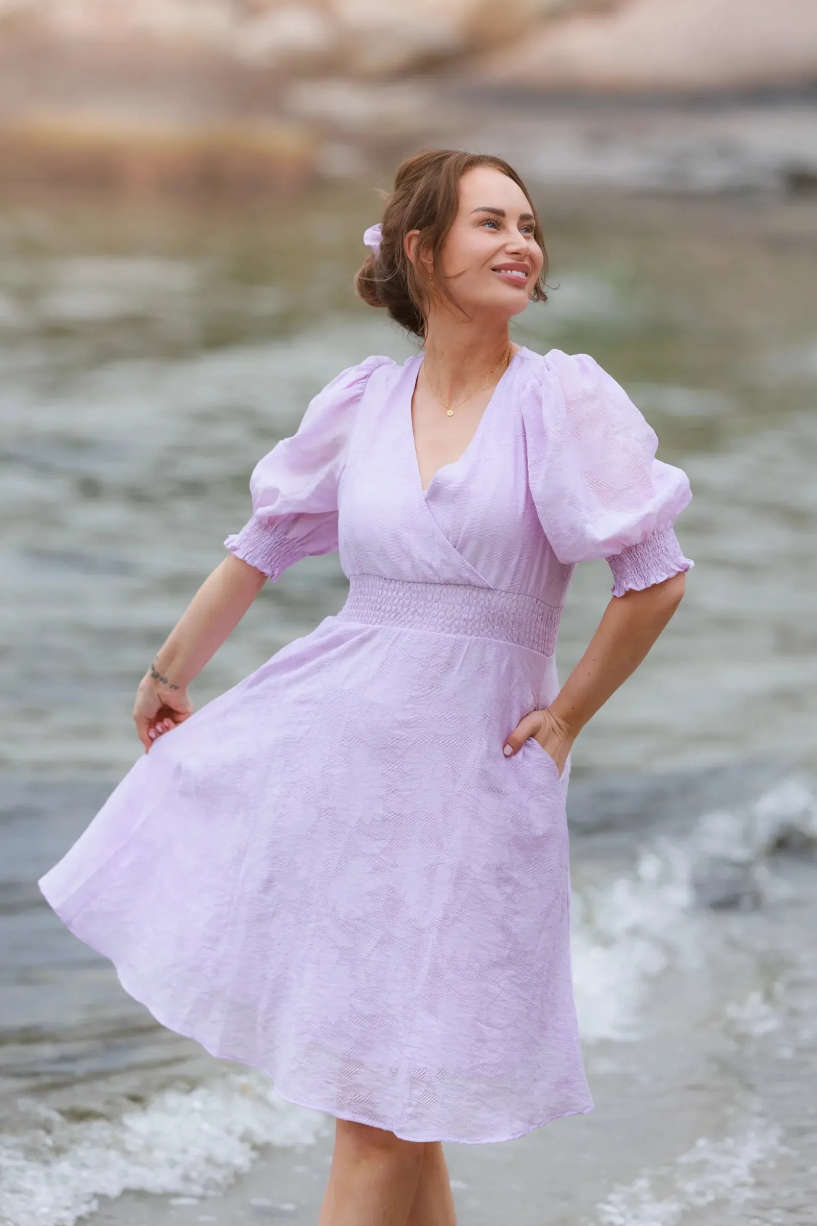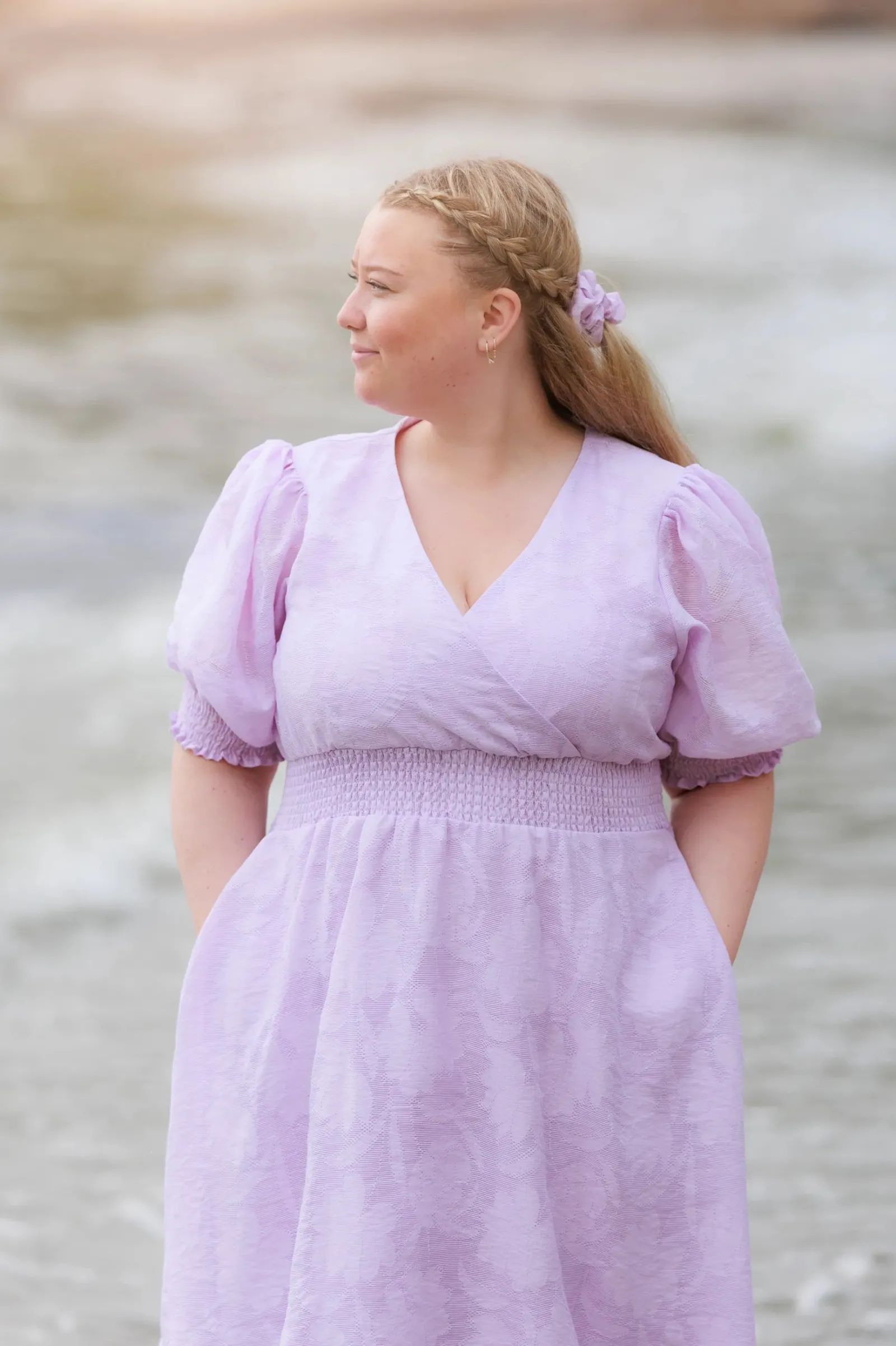 Belle Flower kjole i lilla er en nydelig, kort sommerkjole. Stoffet har tekstur av blomster og oppleves luftig. Den har korte armer med puff og strikk. I midjen er det et behagelig strikk som gir en flatterende passform. På hver side av hoftene er det praktiske lommer. Passer like godt til hverdagen som til finere anledninger.