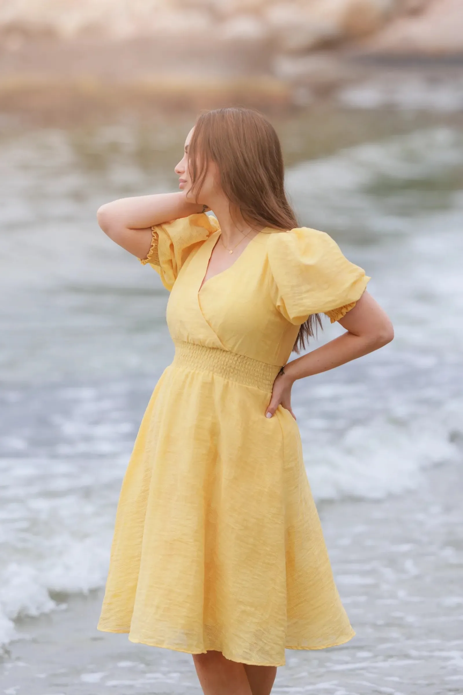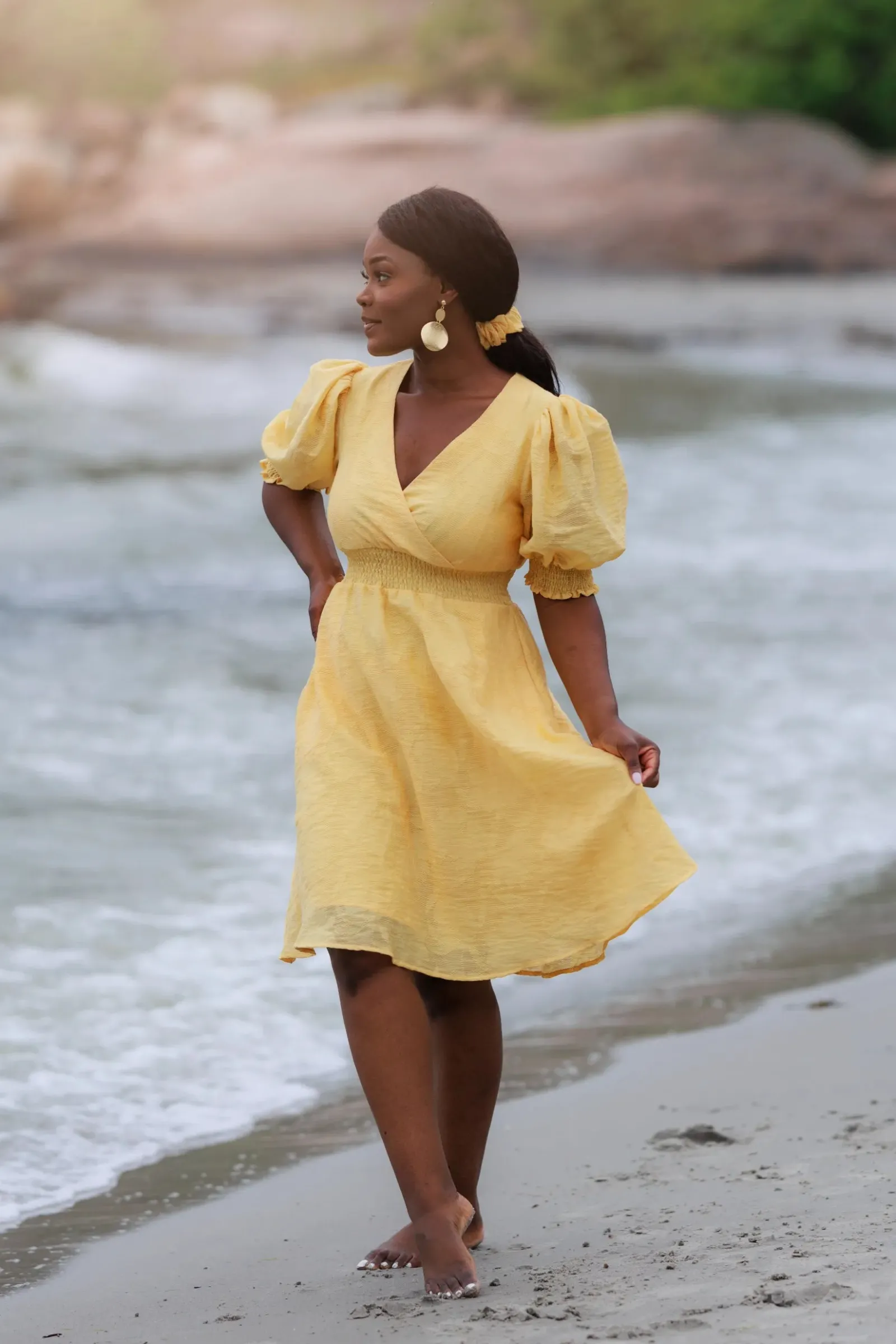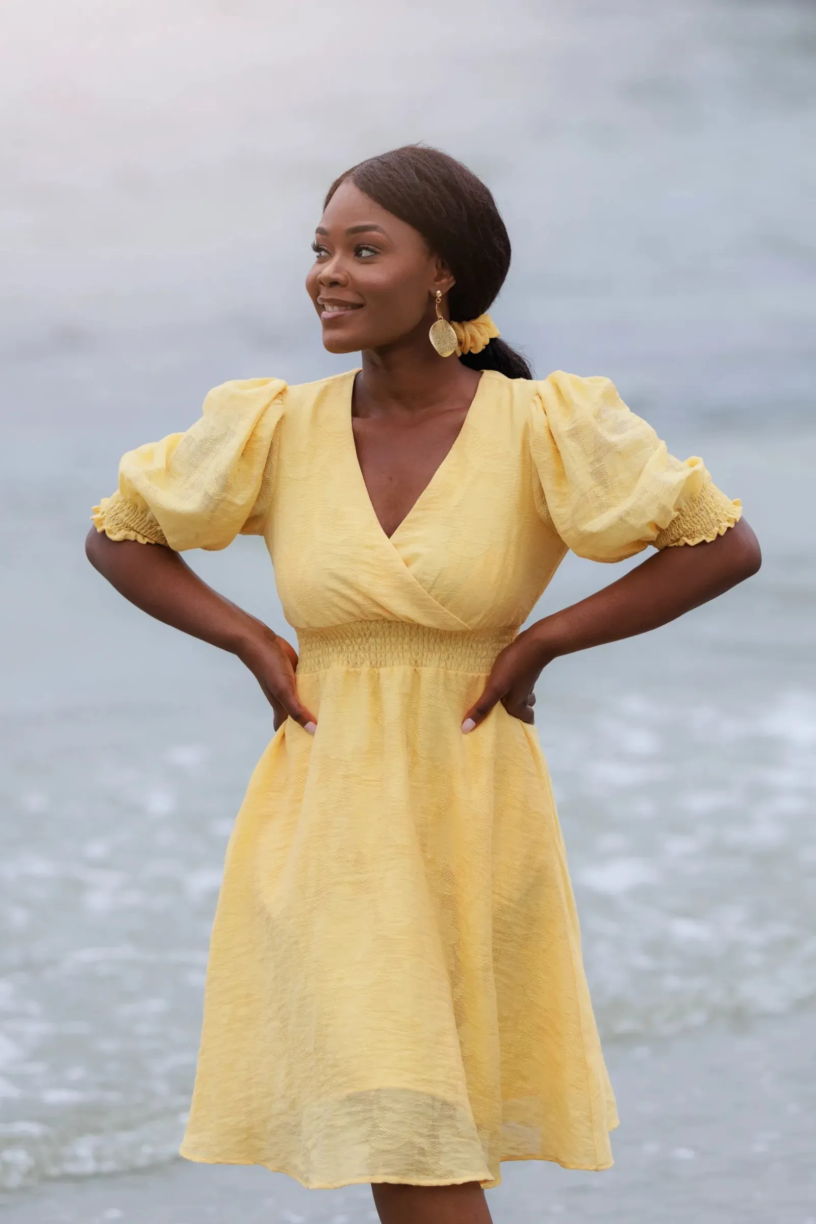 Belle Flower kjole i gul er en nydelig, kort sommerkjole. Stoffet har tekstur av blomster og oppleves luftig. Den har korte armer med puff og strikk. I midjen er det et behagelig strikk som gir en flatterende passform. På hver side av hoftene er det praktiske lommer. Passer like godt til hverdagen som til finere anledninger.
