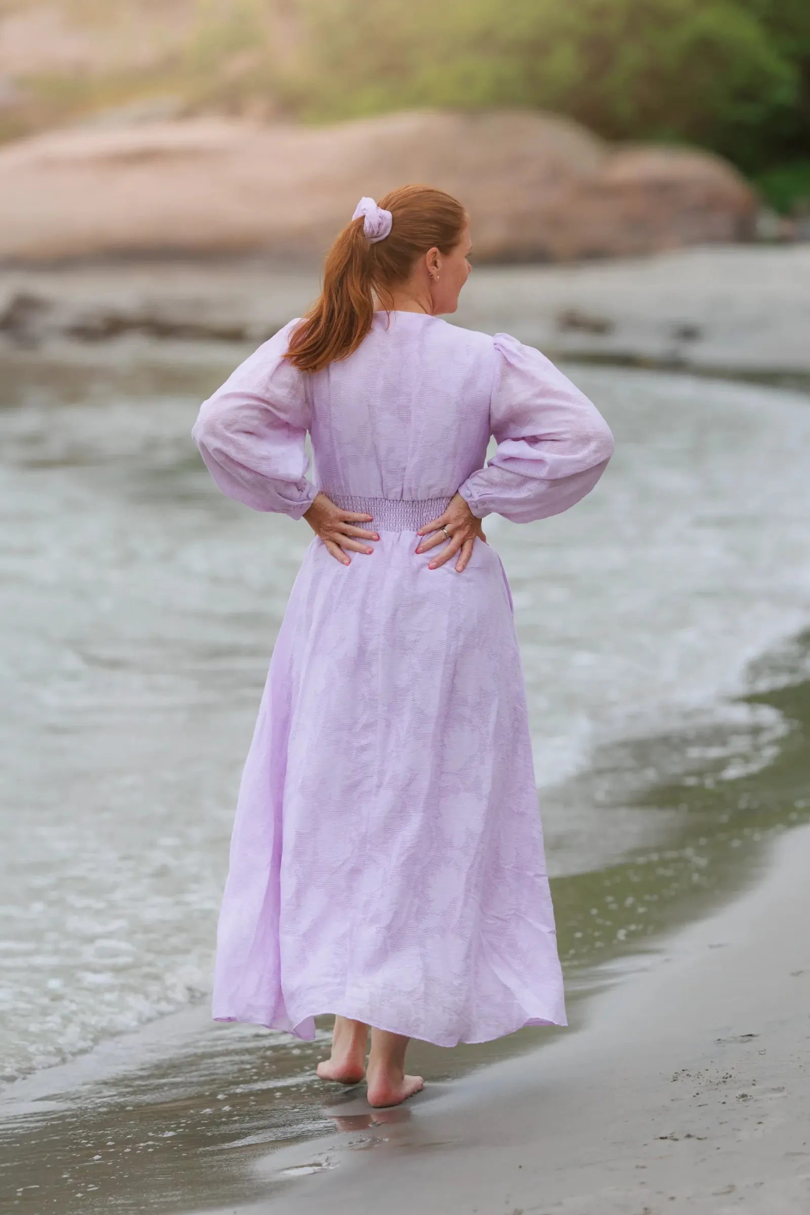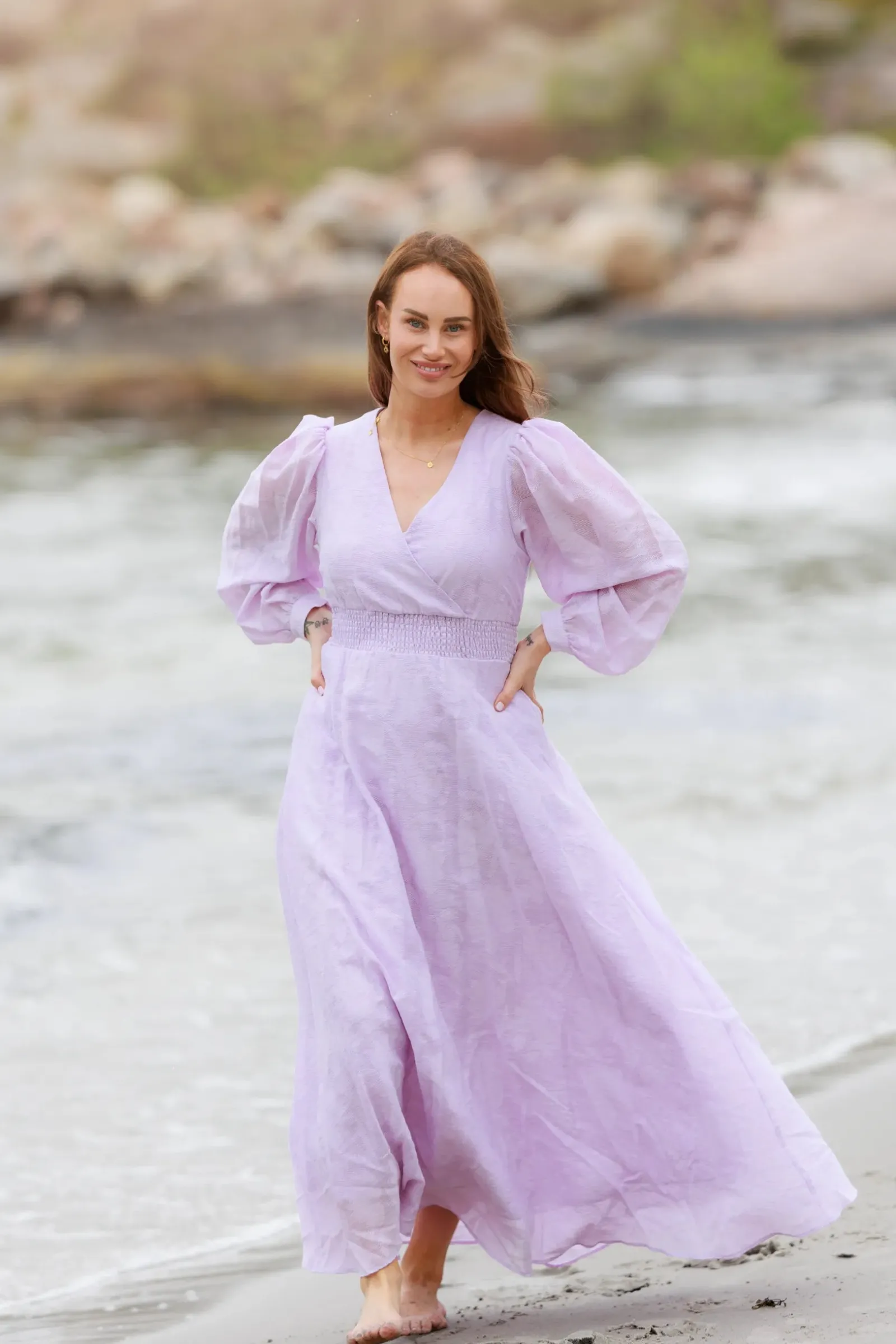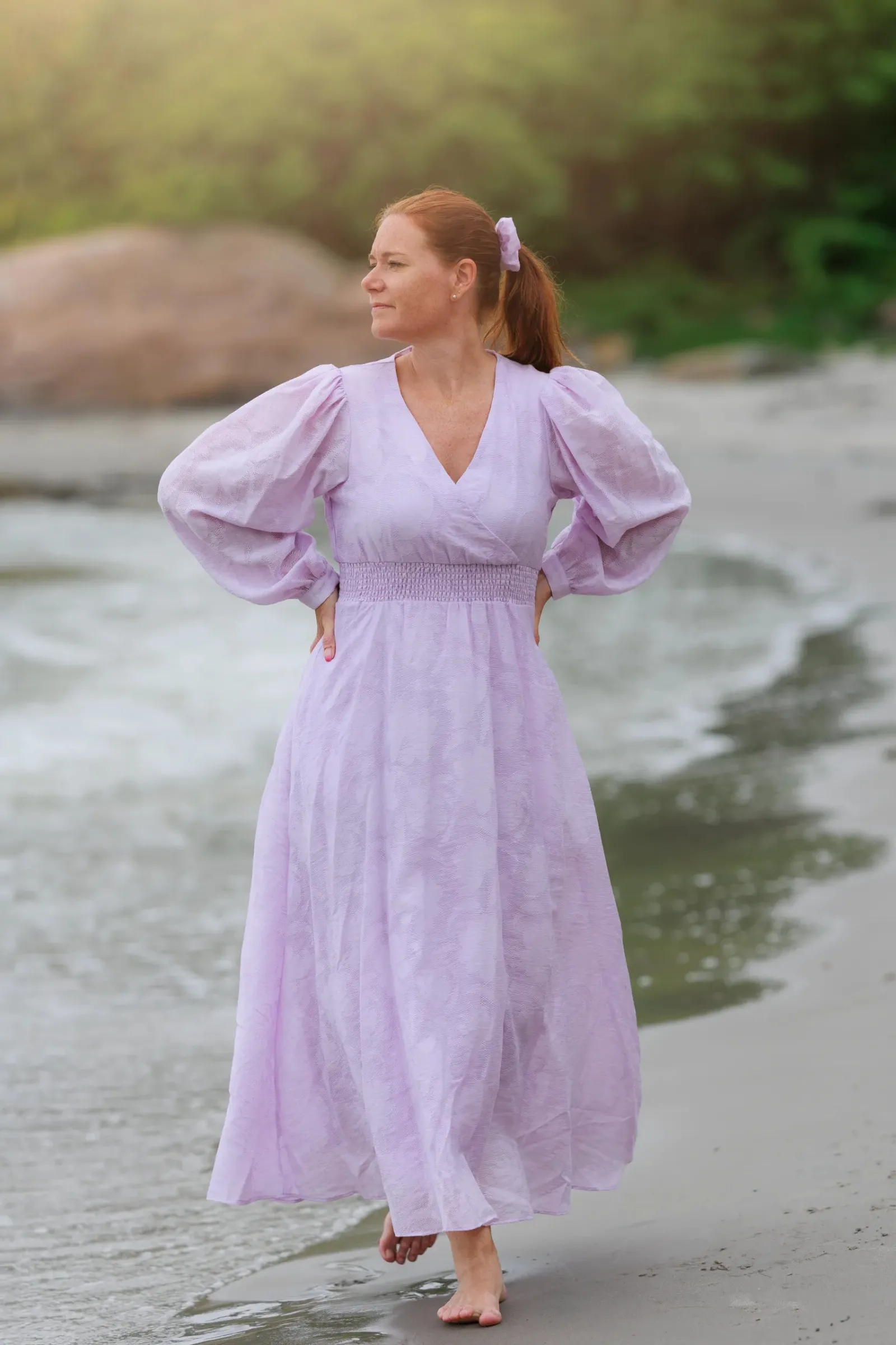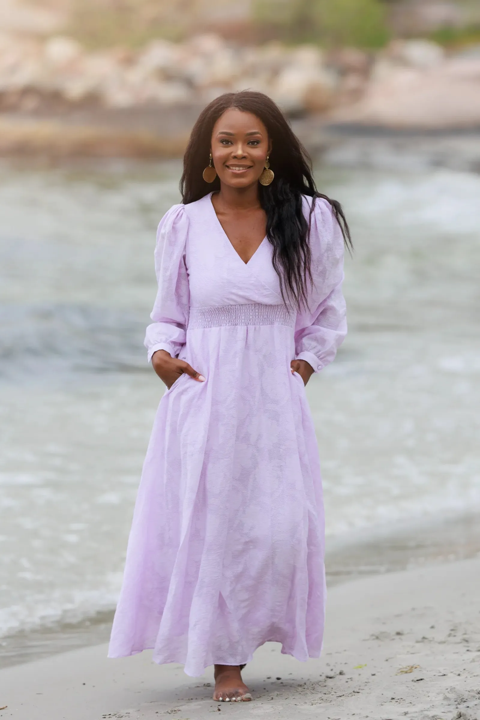 Belle Flower maxikjole i lilla er en nydelig, lang sommerkjole. Stoffet har tekstur av blomster og oppleves luftig. Den har lange armer med puff og strikk. I midjen er det et behagelig strikk som gir en flatterende passform. På hver side av hoftene er det praktiske lommer. Passer like godt til hverdagen som til finere anledninger.