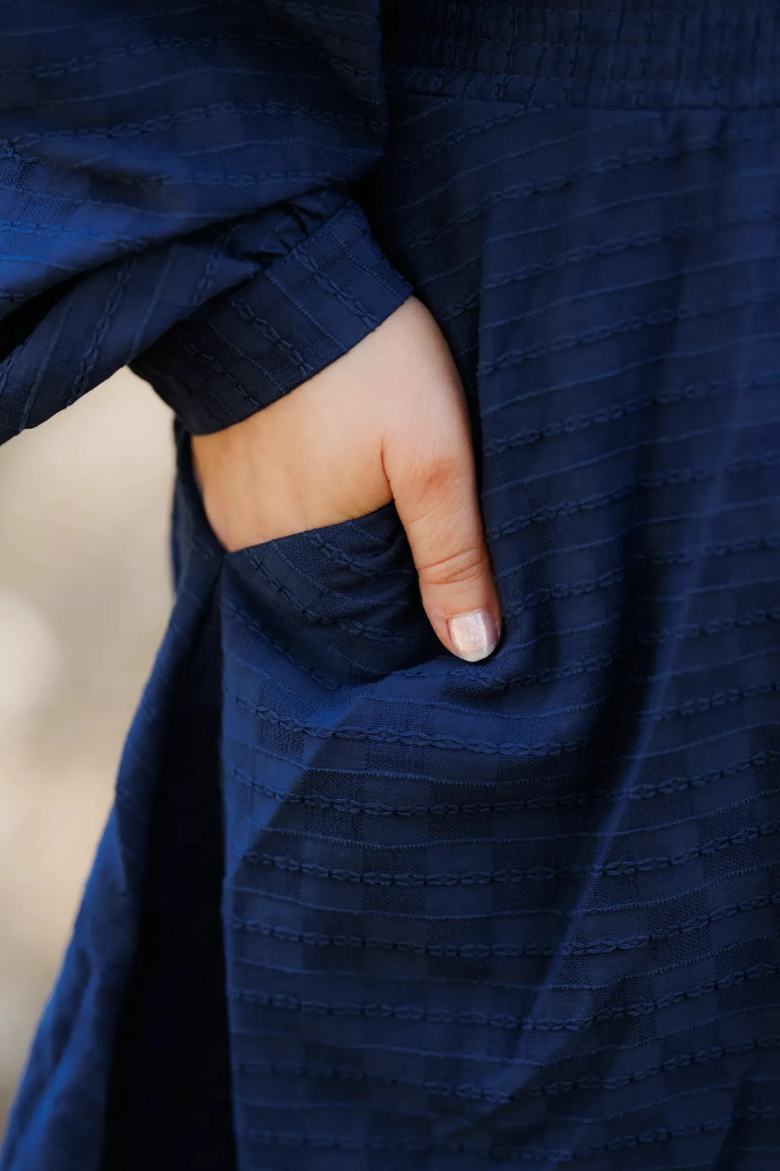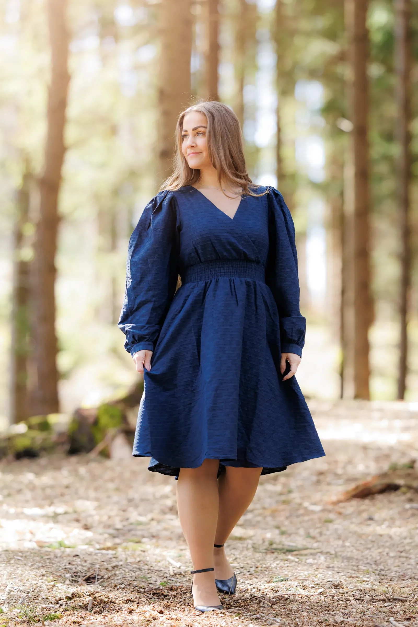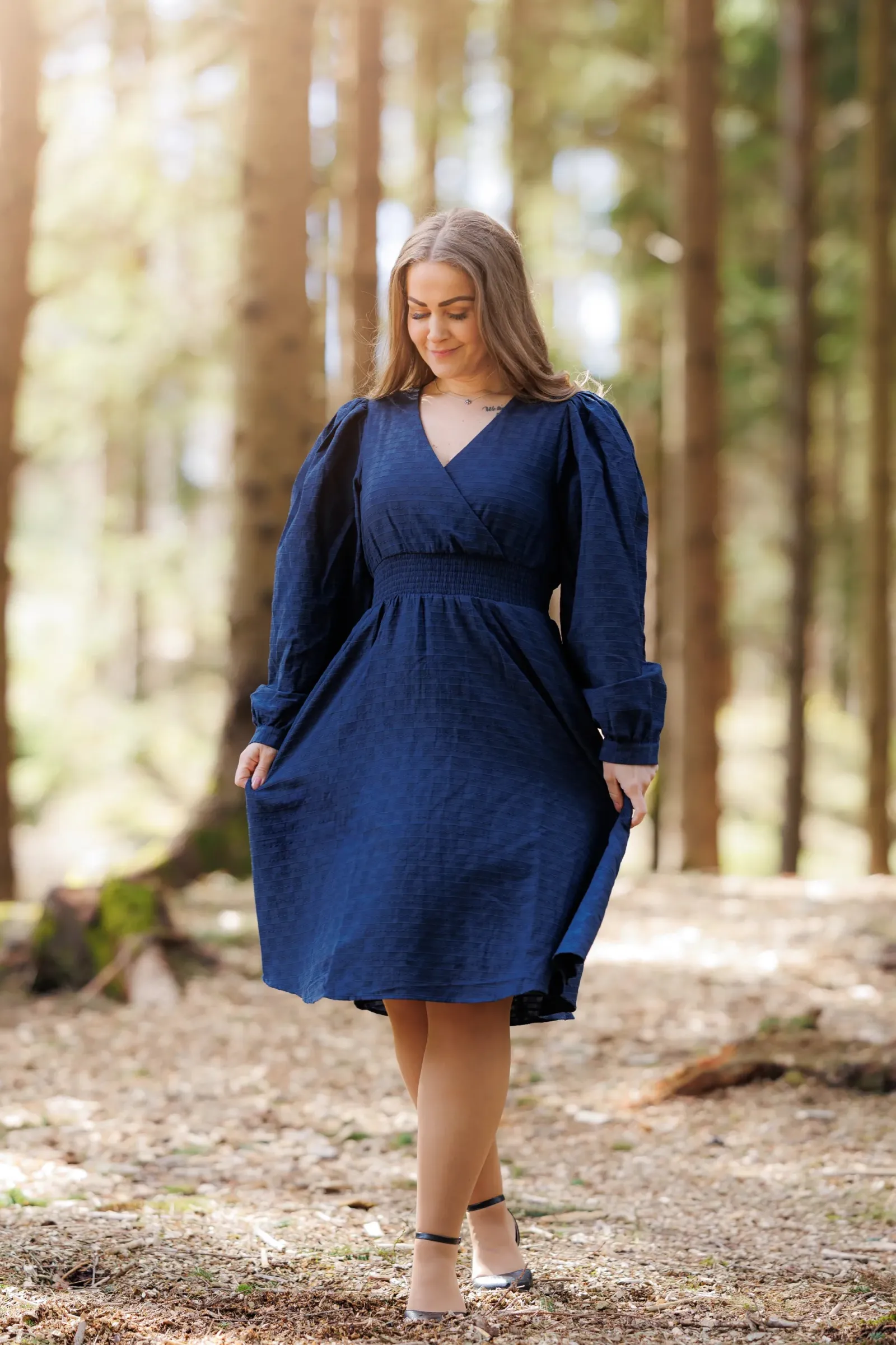 Belle kjole er den perfekte kjolen i mørkeblå til både hverdag og selskap. Denne kjolen er kort modell. Kjolen legger seg elegant på og har en behagelig strikk i livet, i tillegg til lommer på hver side.