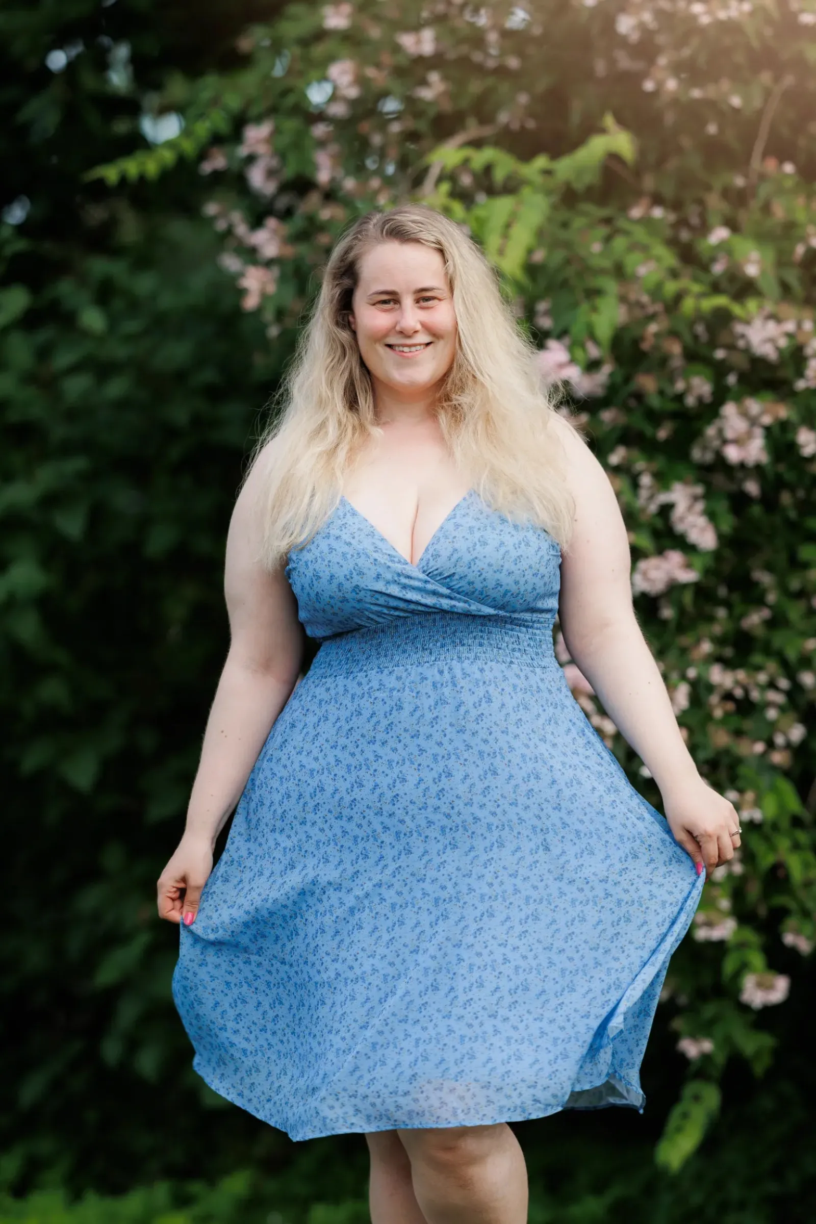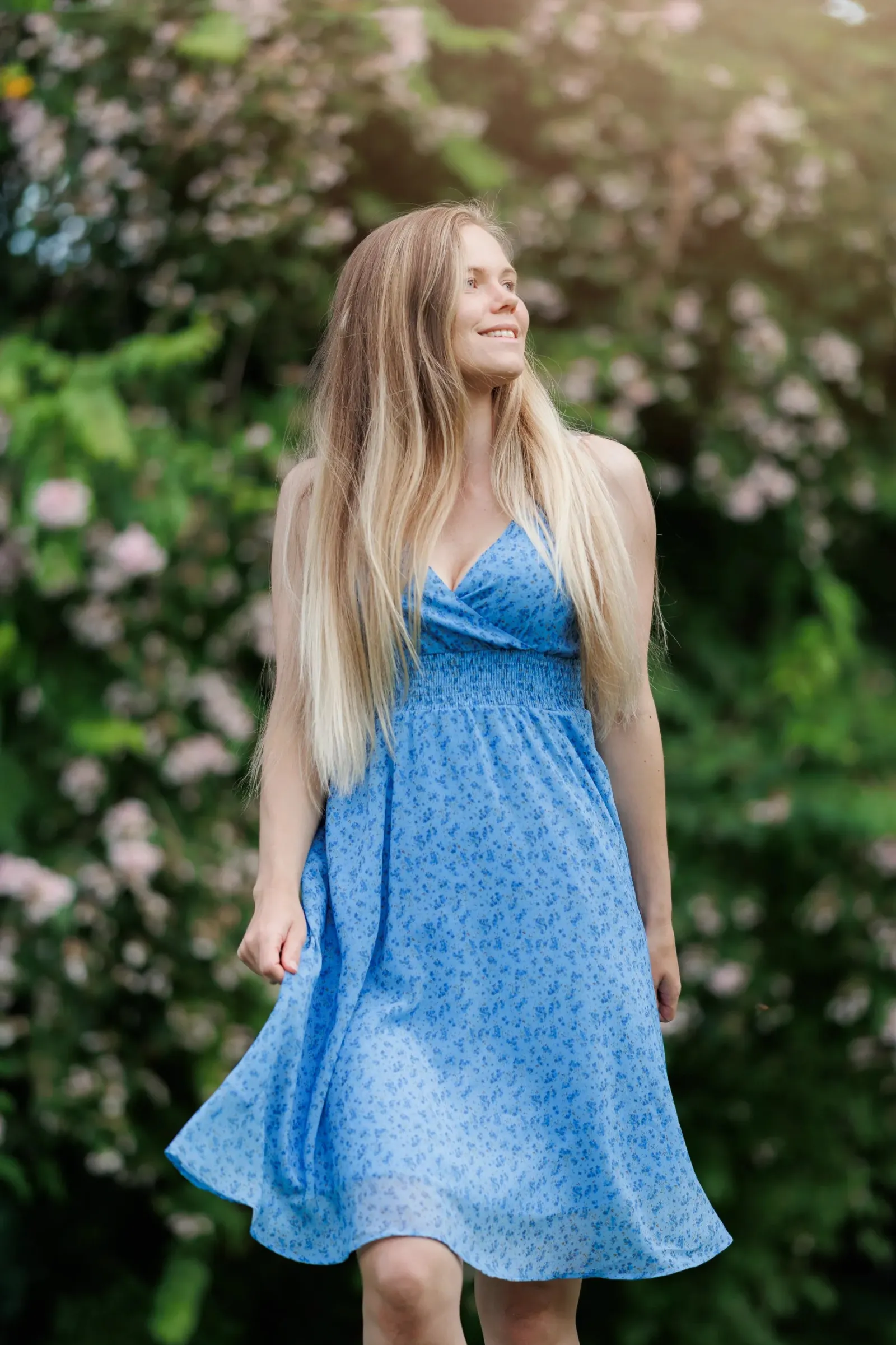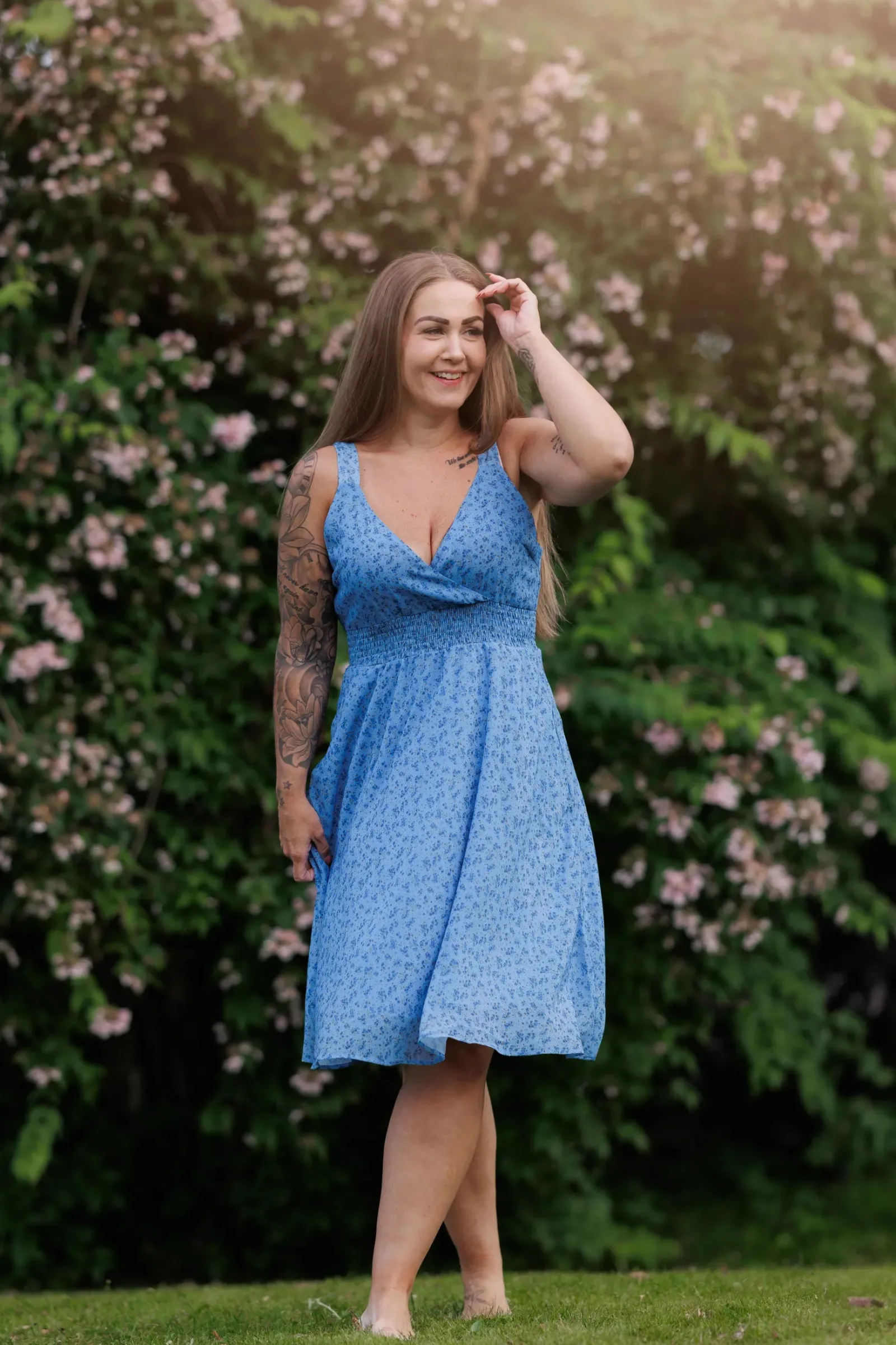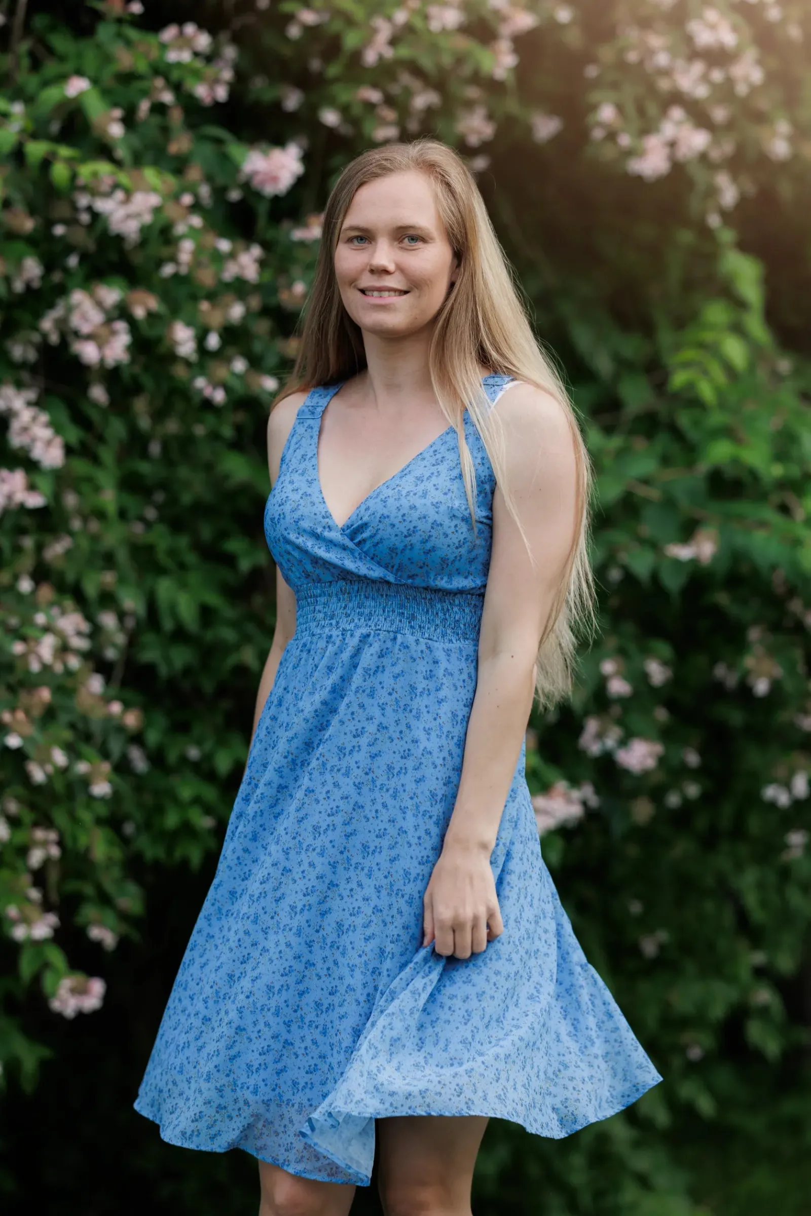 Belle med stropper i blå har et nydelig blomstermønster og er en lett, deilig kjole. Den legger seg så flatterende på og har et behagelig strikk i livet, i tillegg til lommer på hver side.
