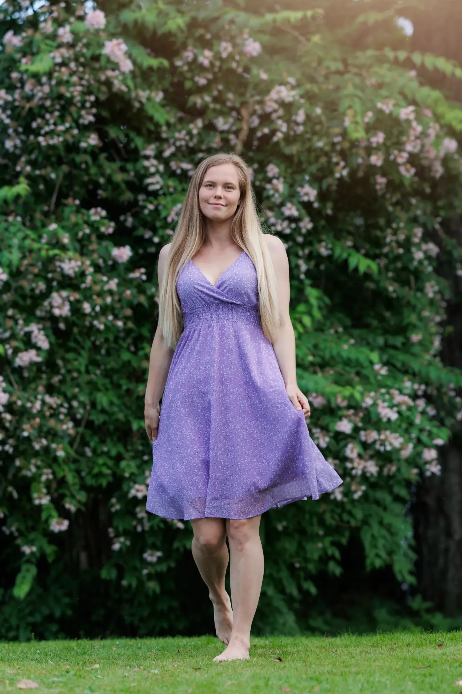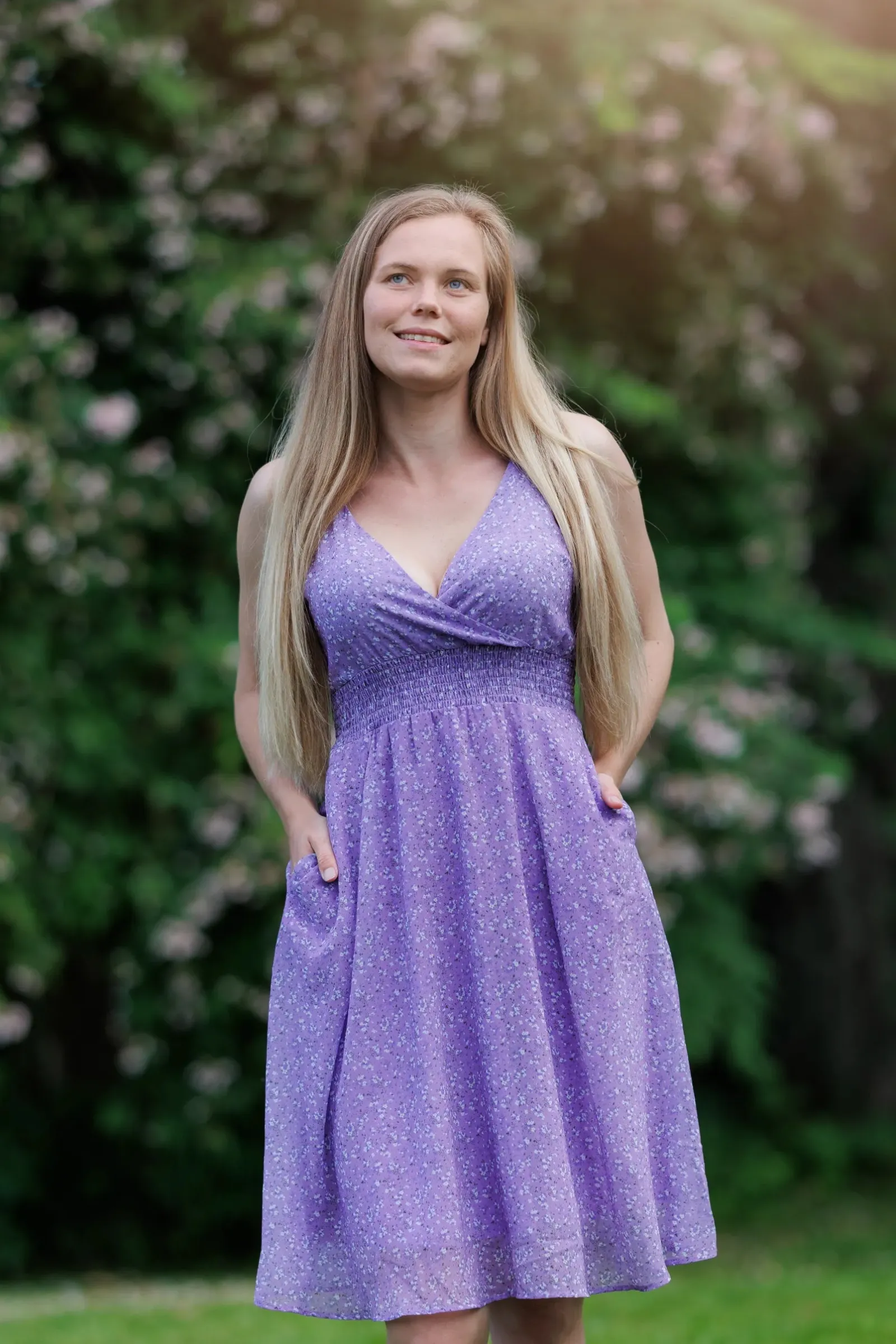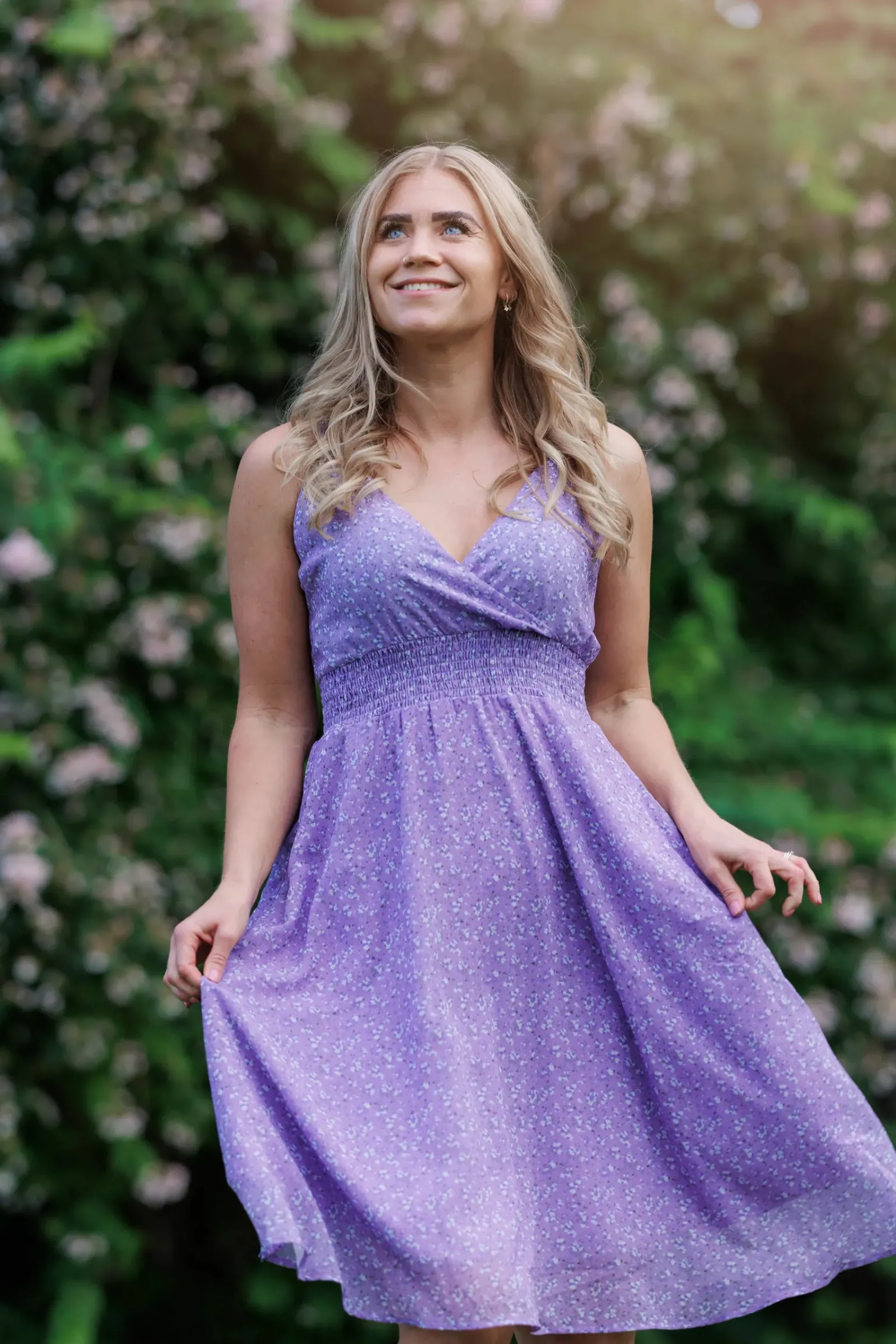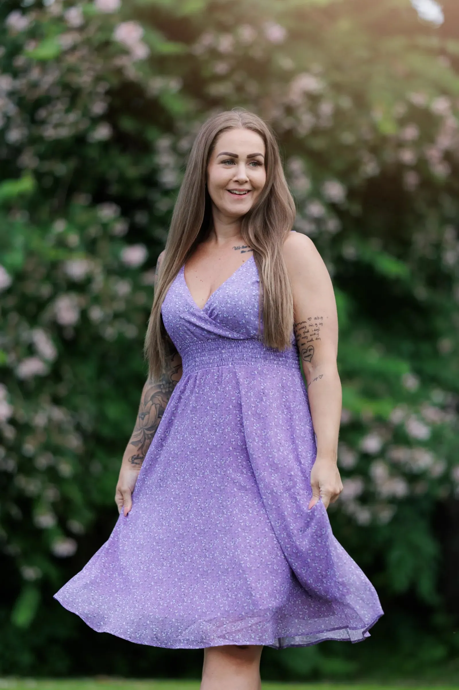 Belle med stropper i lilla har et nydelig blomstermønster og er en lett, deilig kjole. Den legger seg så flatterende på og har et behagelig strikk i livet, i tillegg til lommer på hver side.
