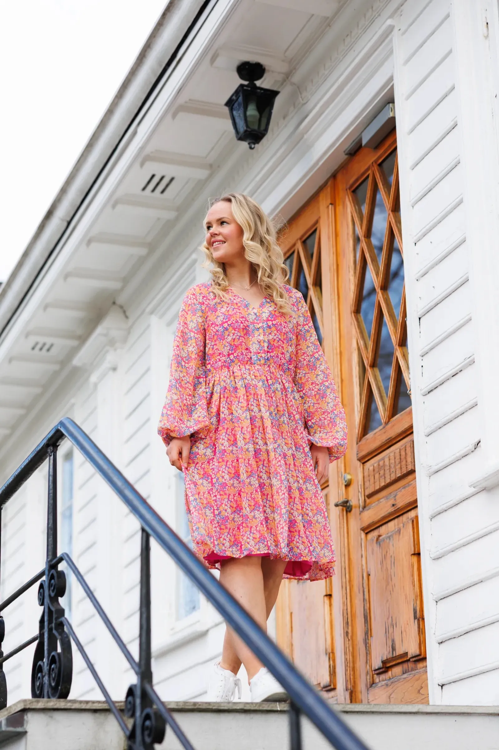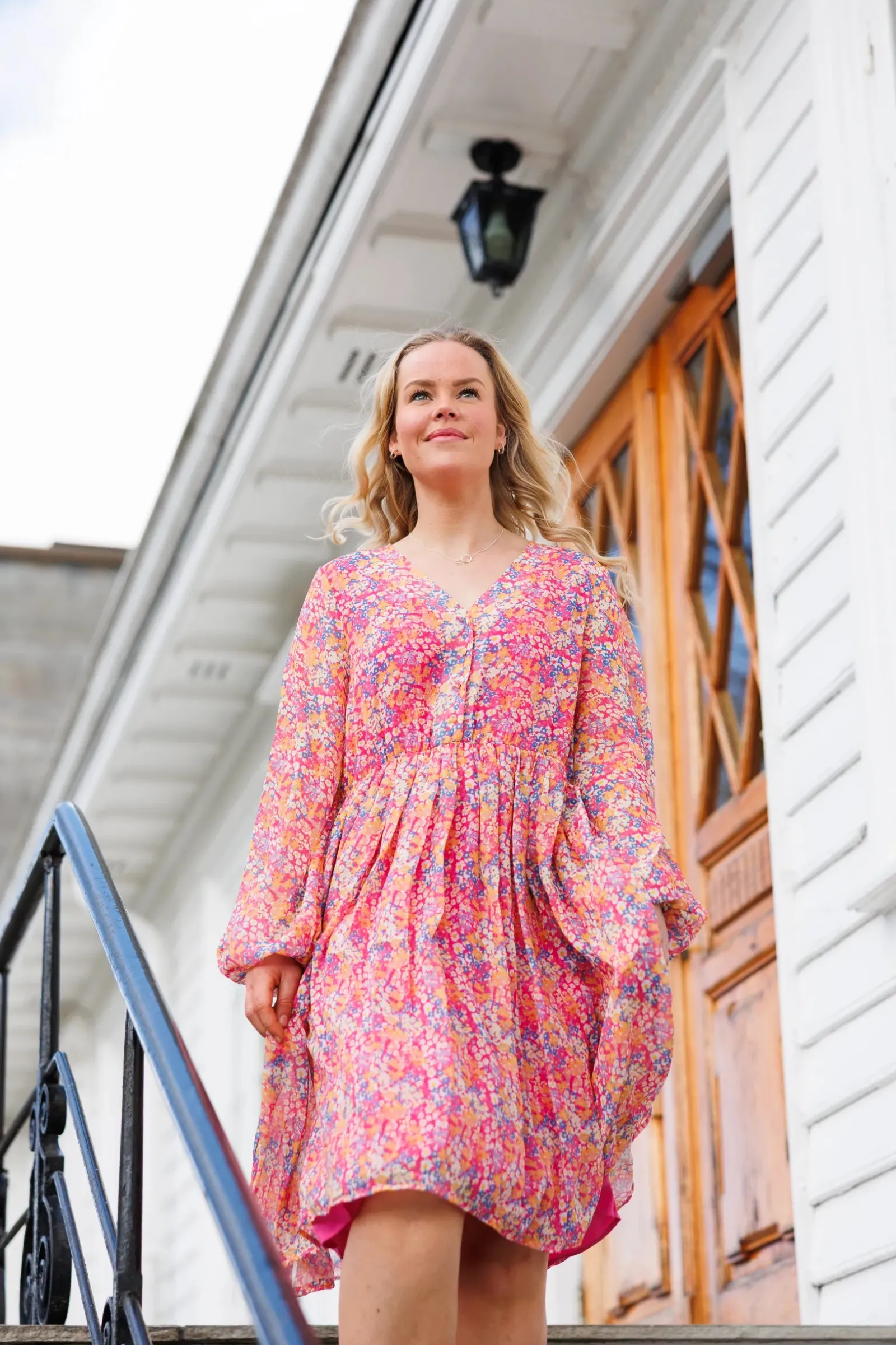 Den har lange ermer med lett puff og strikk ved håndleddene. Livet er markert med en lett rynket søm som gir volum og bevegelse til skjørtet. Kjolen har en V-utringning og knapper i front som kan åpnes/lukkes. Bianca er derfor super å feks amme i. Lengden går til under knærne. Det er lommer på hver side av hoftene. Stoffet er lett, luftig og passer så fint til vår og sommer.