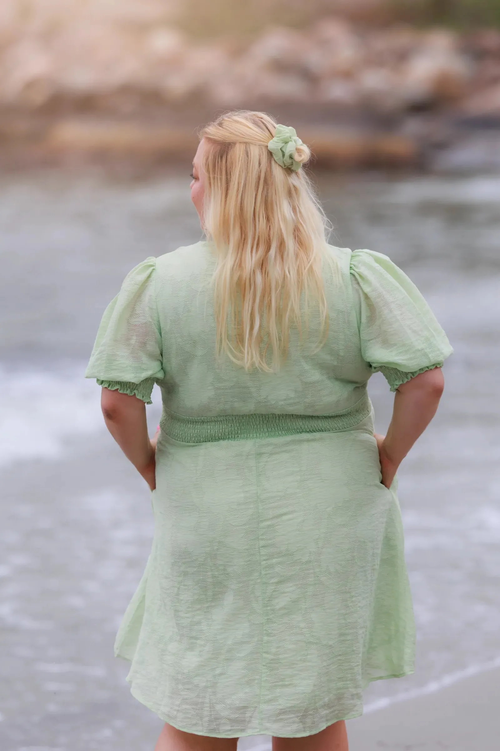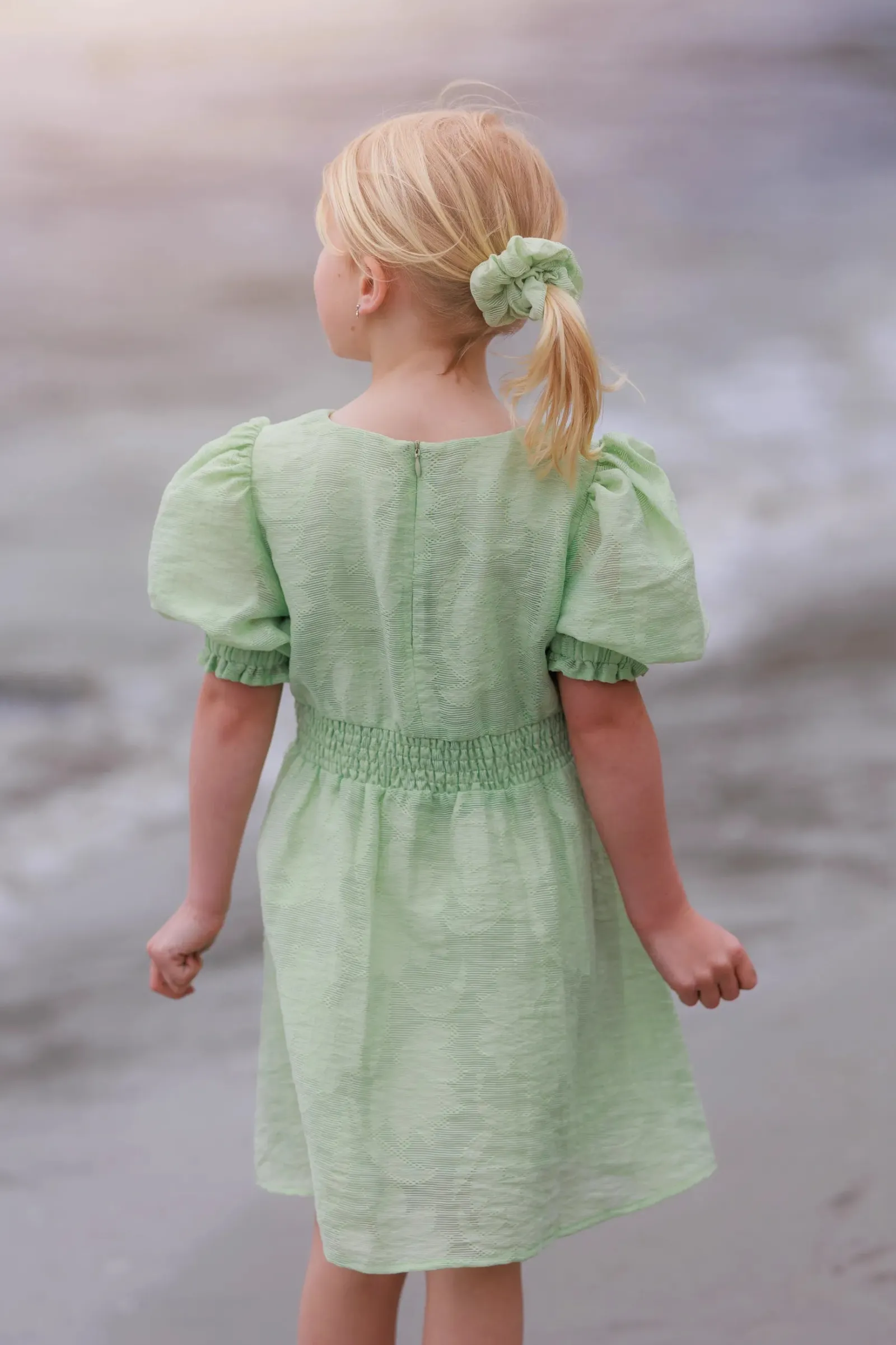 Flower Scrunchies 2pk i grønt er et nydelig hårstrikk med tekstur av blomster. Disse matcher perfekt med Belle Flower kjole i lang eller kort til dame, eller til barn.