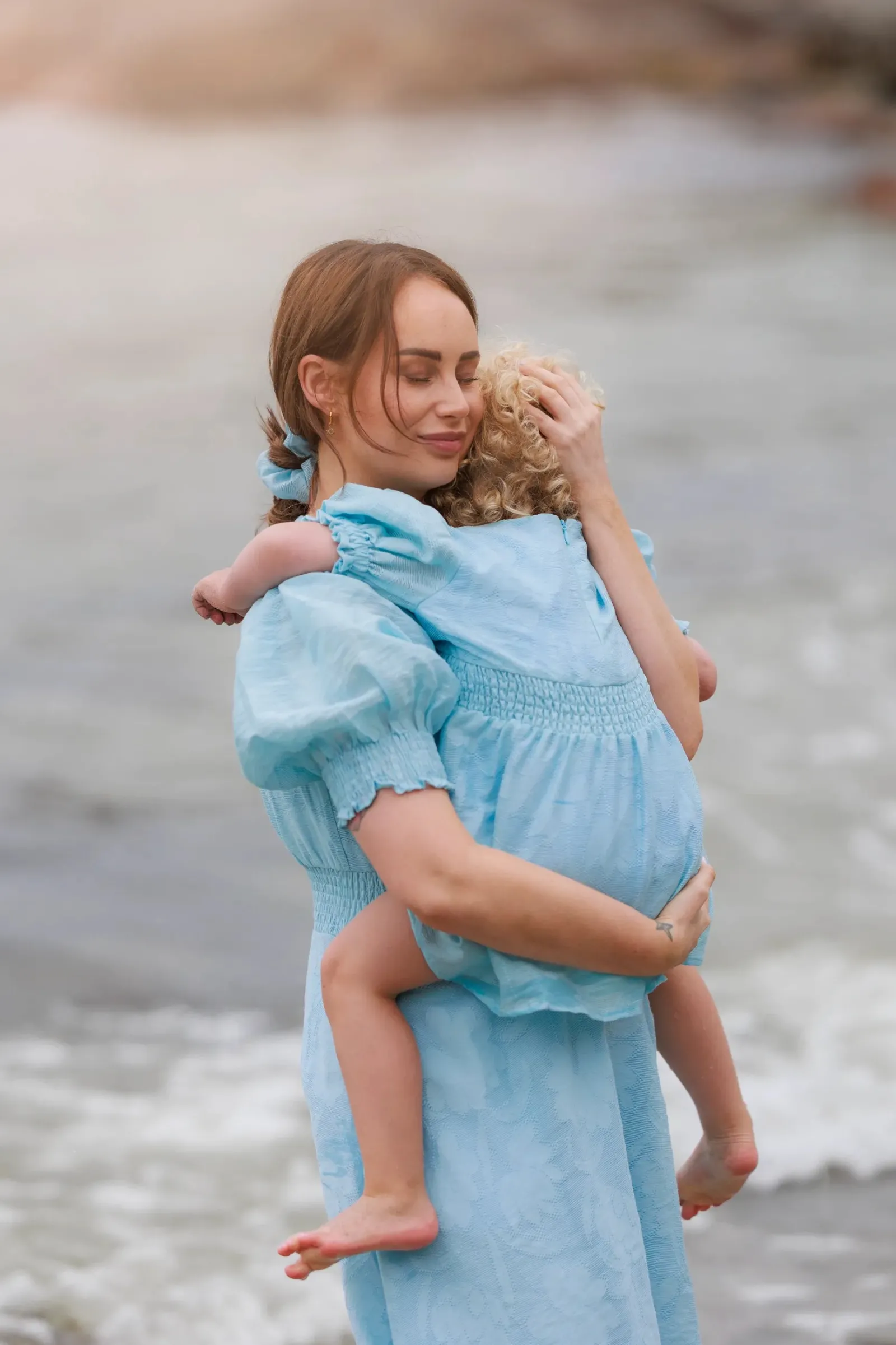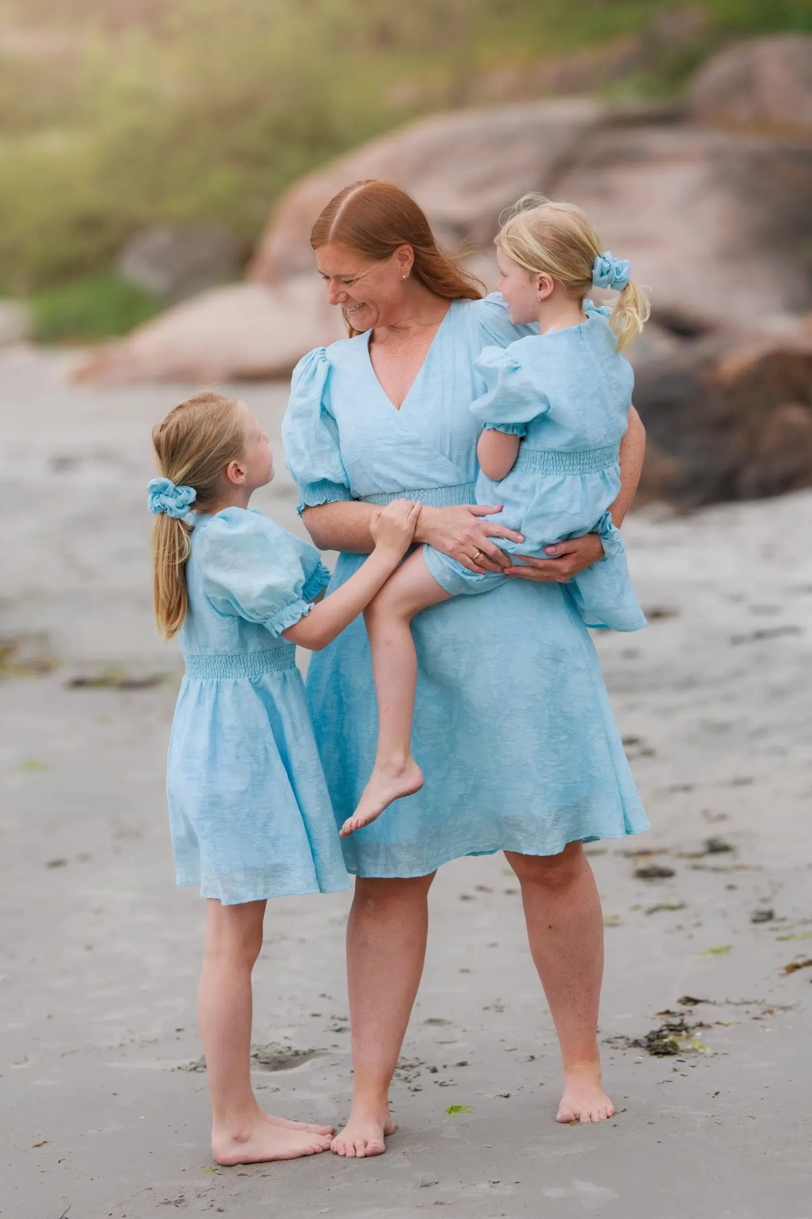 Flower Scrunchies 2pk i lyseblått er et nydelig hårstrikk med tekstur av blomster. Disse matcher perfekt med Belle Flower kjole i lang eller kort til dame, eller til barn.