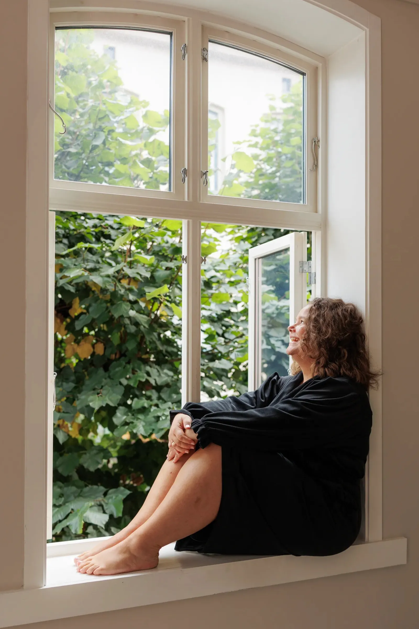 Det er belte i midjen og den har godelommer. Lengden er perfekt for at du kan bevege deg rundt på morgenen uten å være redd for at noen skal se deg.