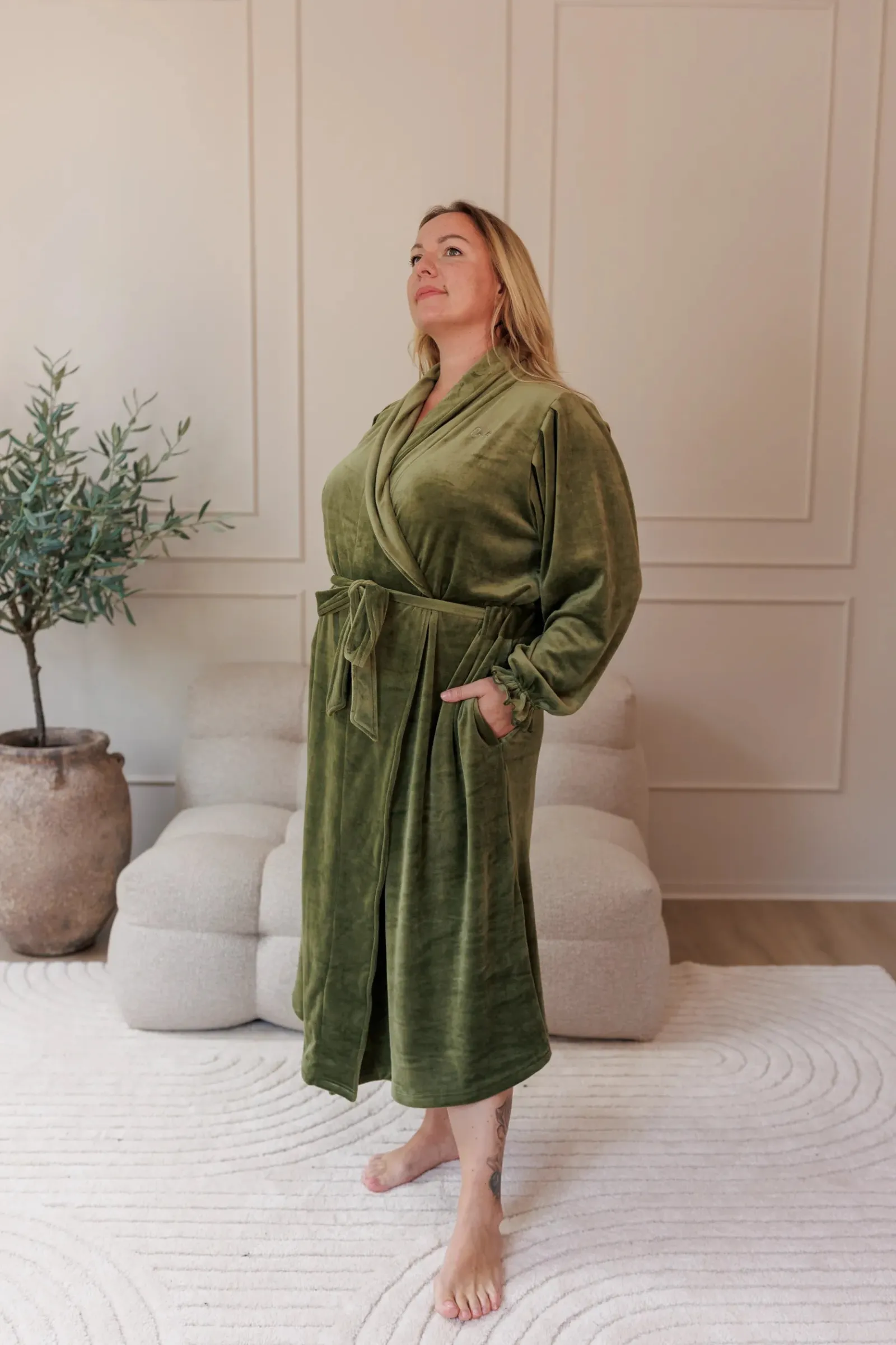 Det er belte i midjen og den har godelommer. Lengden er perfekt for at du kan bevege deg rundt på morgenen uten å være redd for at noen skal se deg.