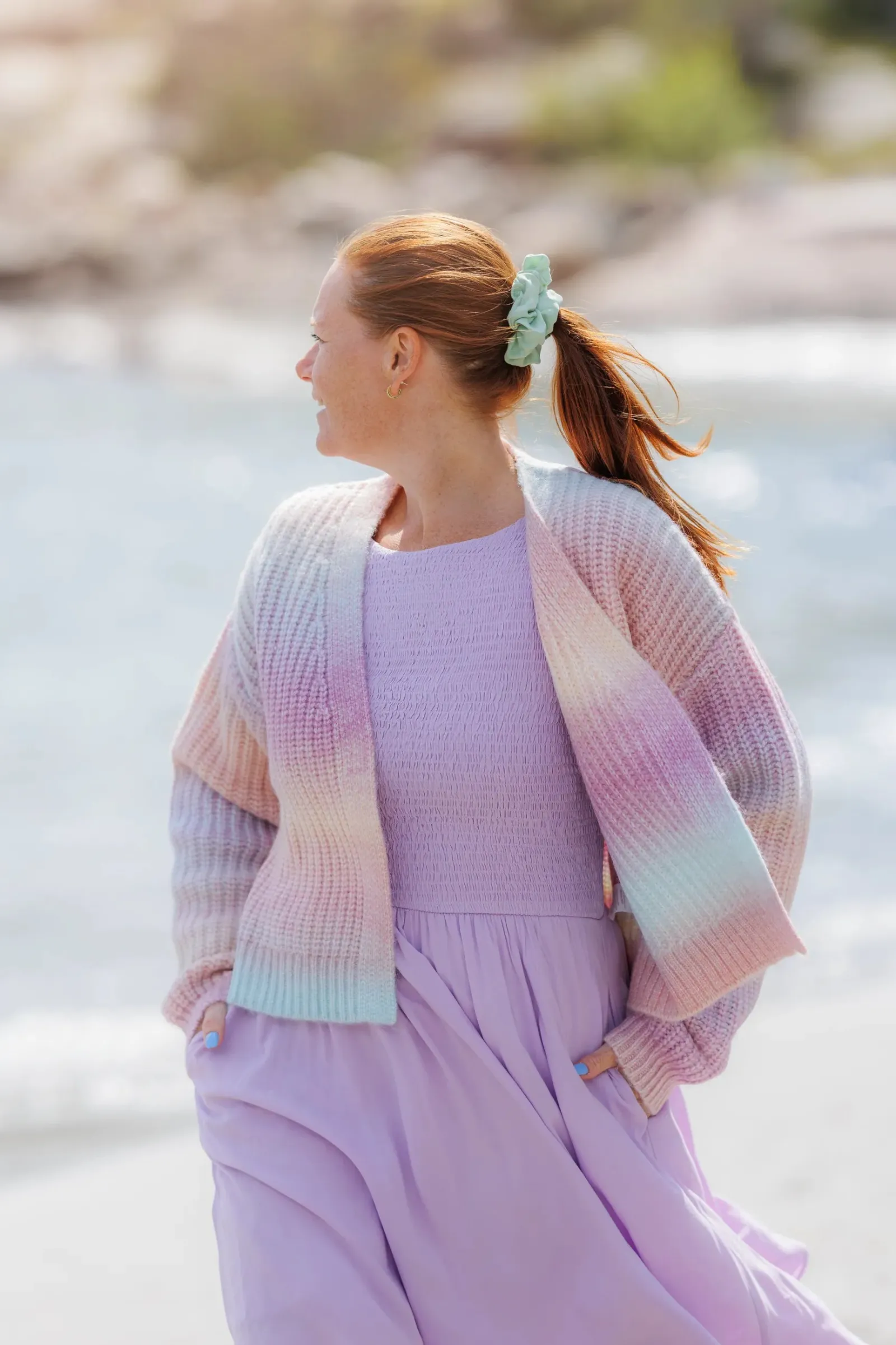 Leah cardigan i pastell er perfekt å slenge over en kjole eller andre plagg. Den er strikket med nydelige fargede striper og har en løs passform. Stopper rett over midjen og er uten knapper eller glidelås.