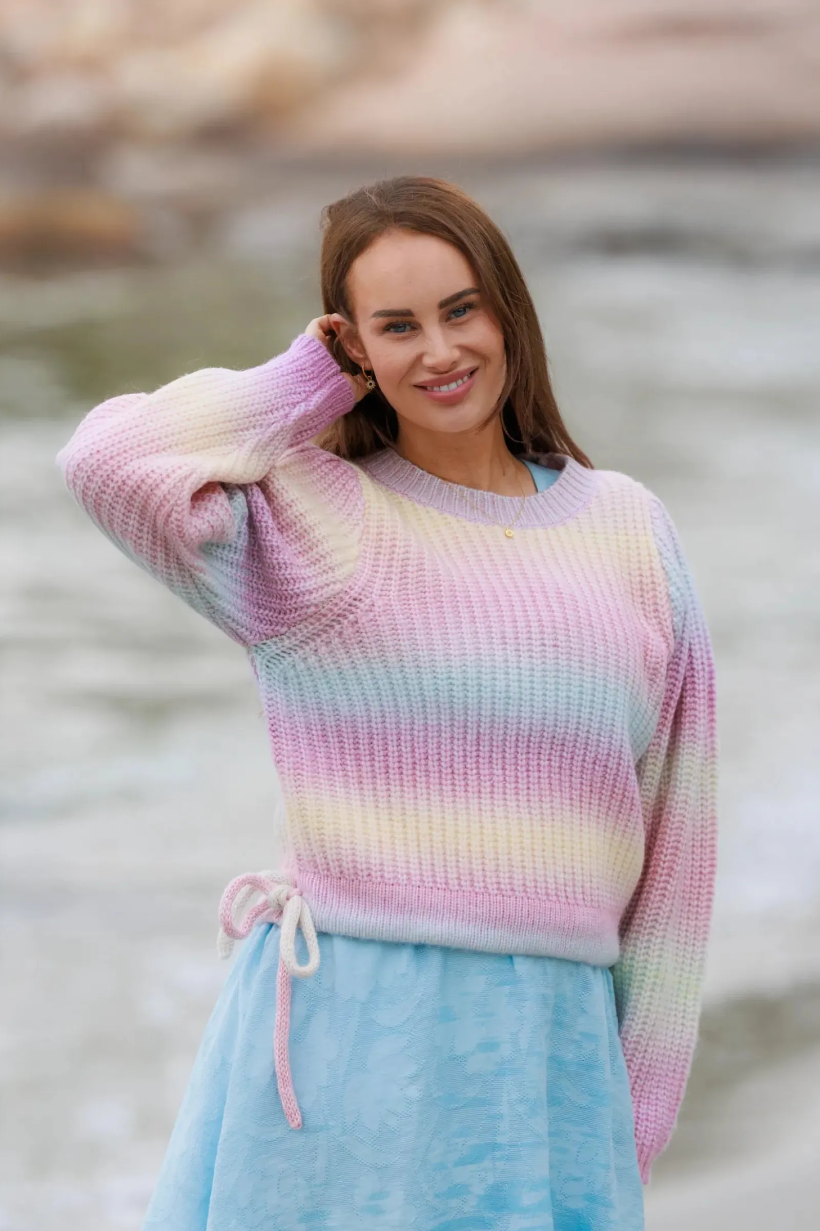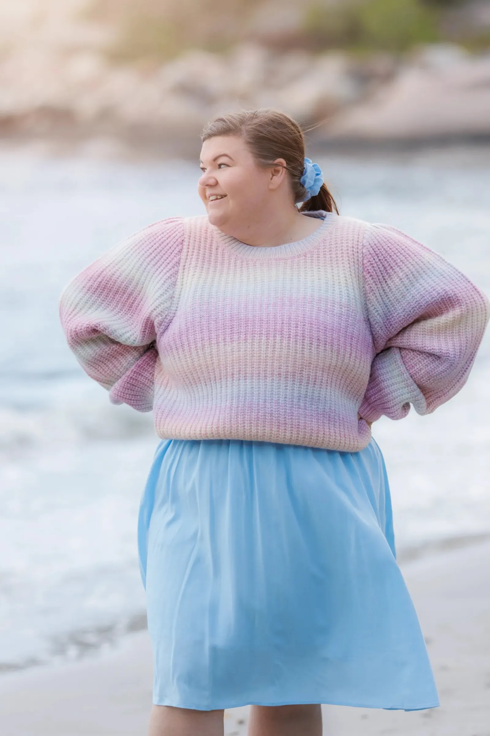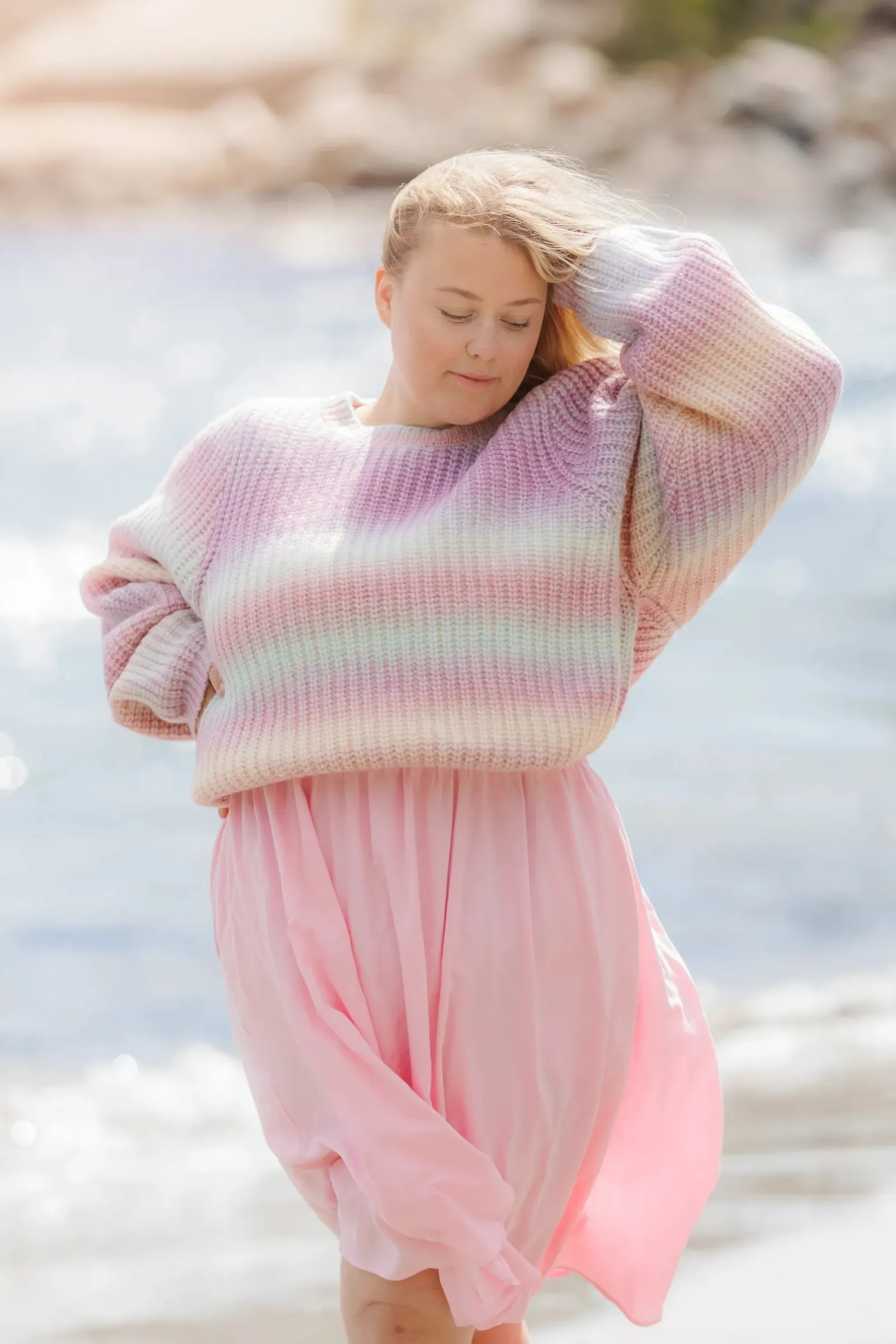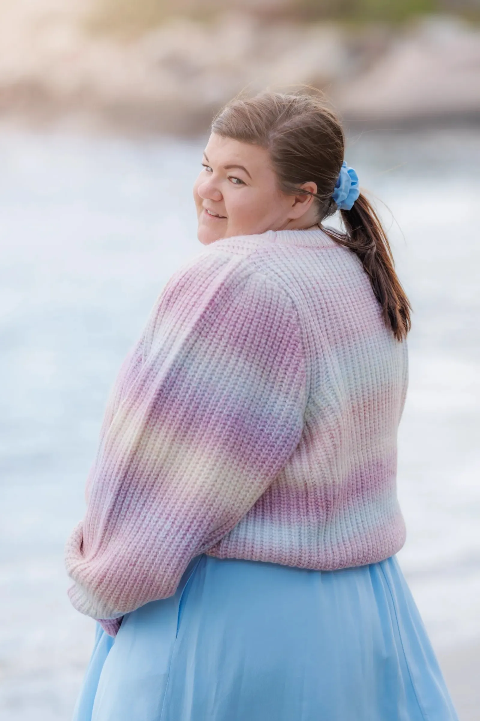 Leah genser i pastell er perfekt å slenge over en kjole eller andre plagg. Den er strikket med delikat stripemønster og har en løs passform. Kan strammes inn i midjen med skjult knyting så du enkelt kan justere lengden.