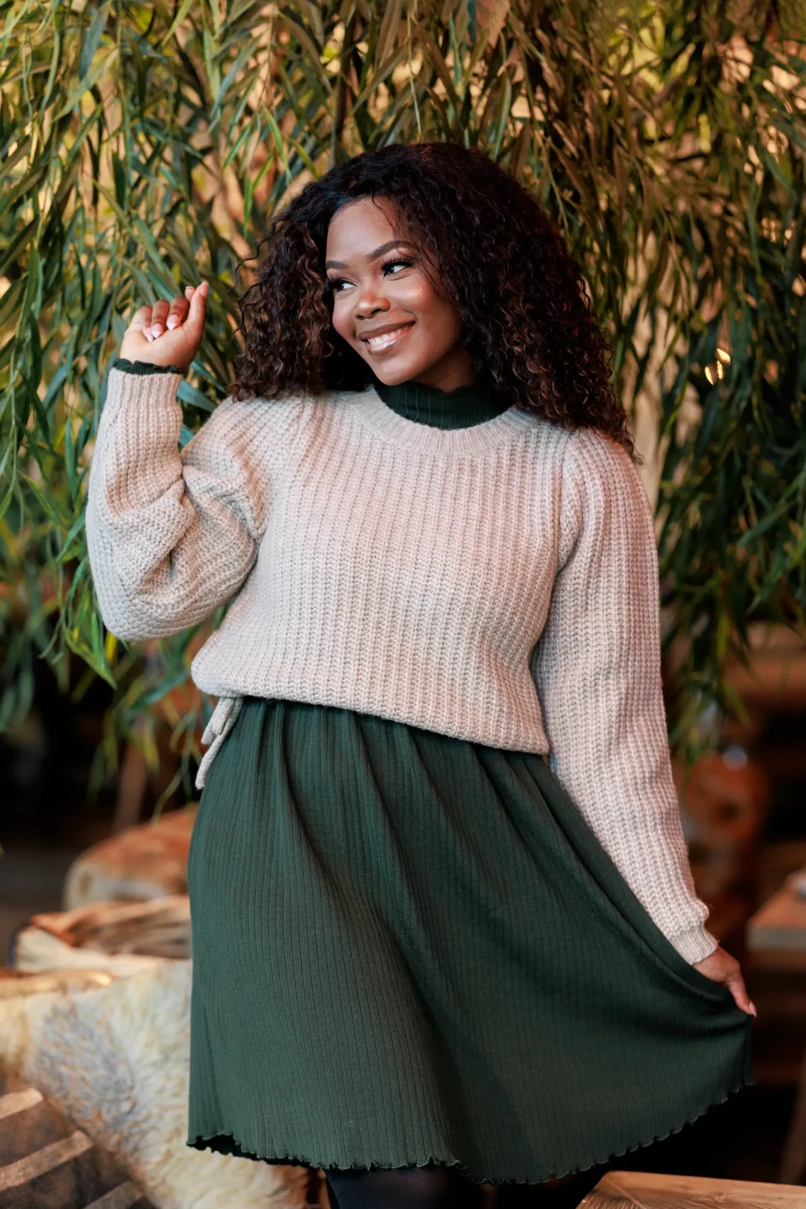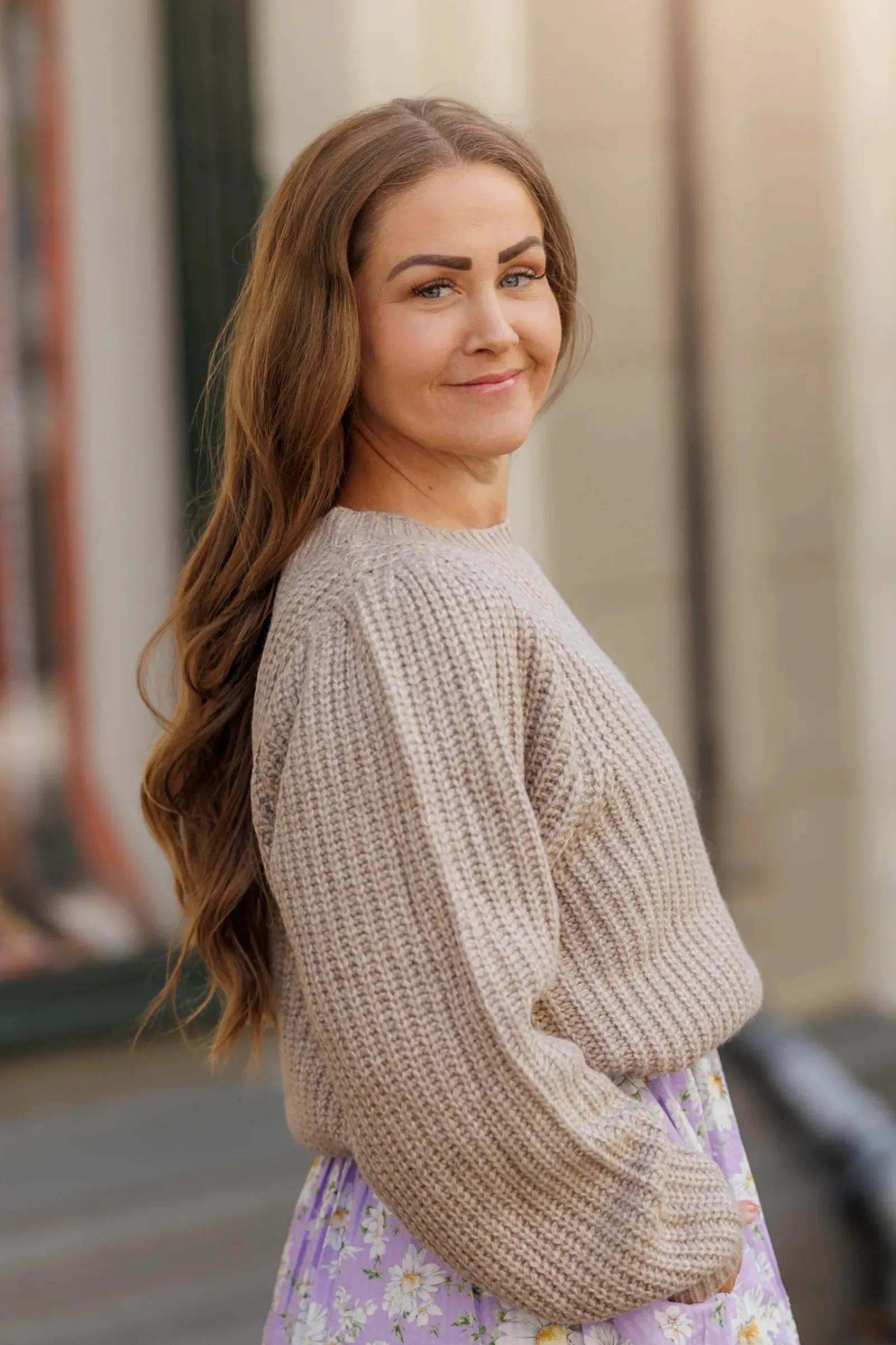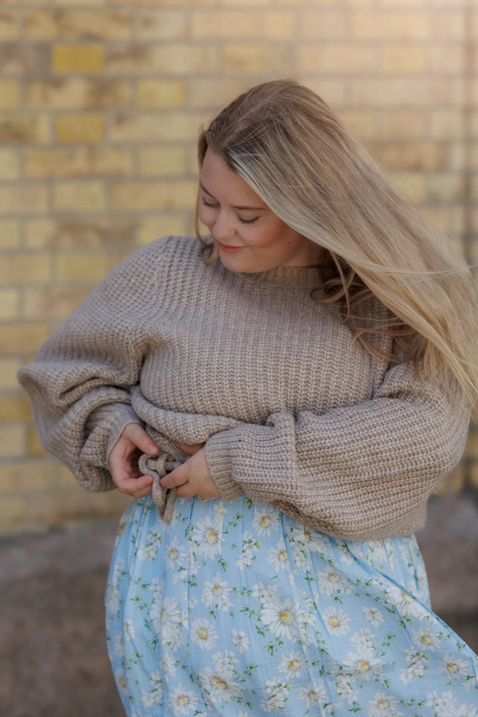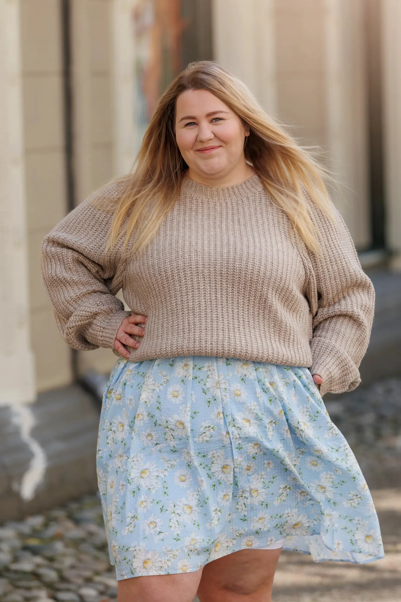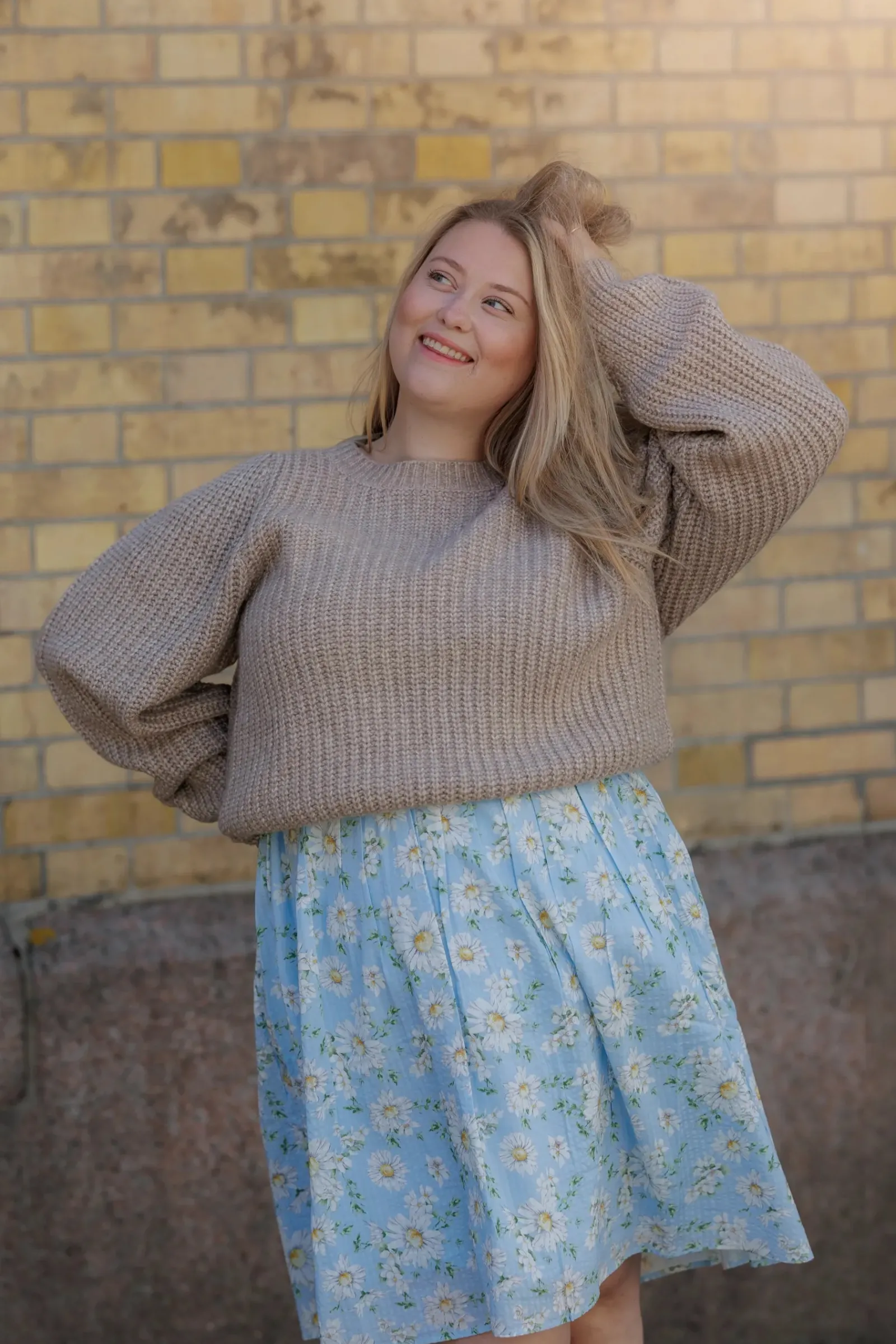Leah genser i beige er perfekt å slenge over en kjole eller andre plagg. Den er strikket med delikat stripemønster og har en løs passform. Kan strammes inn i midjen med skjult knyting så du enkelt kan justere lengden.