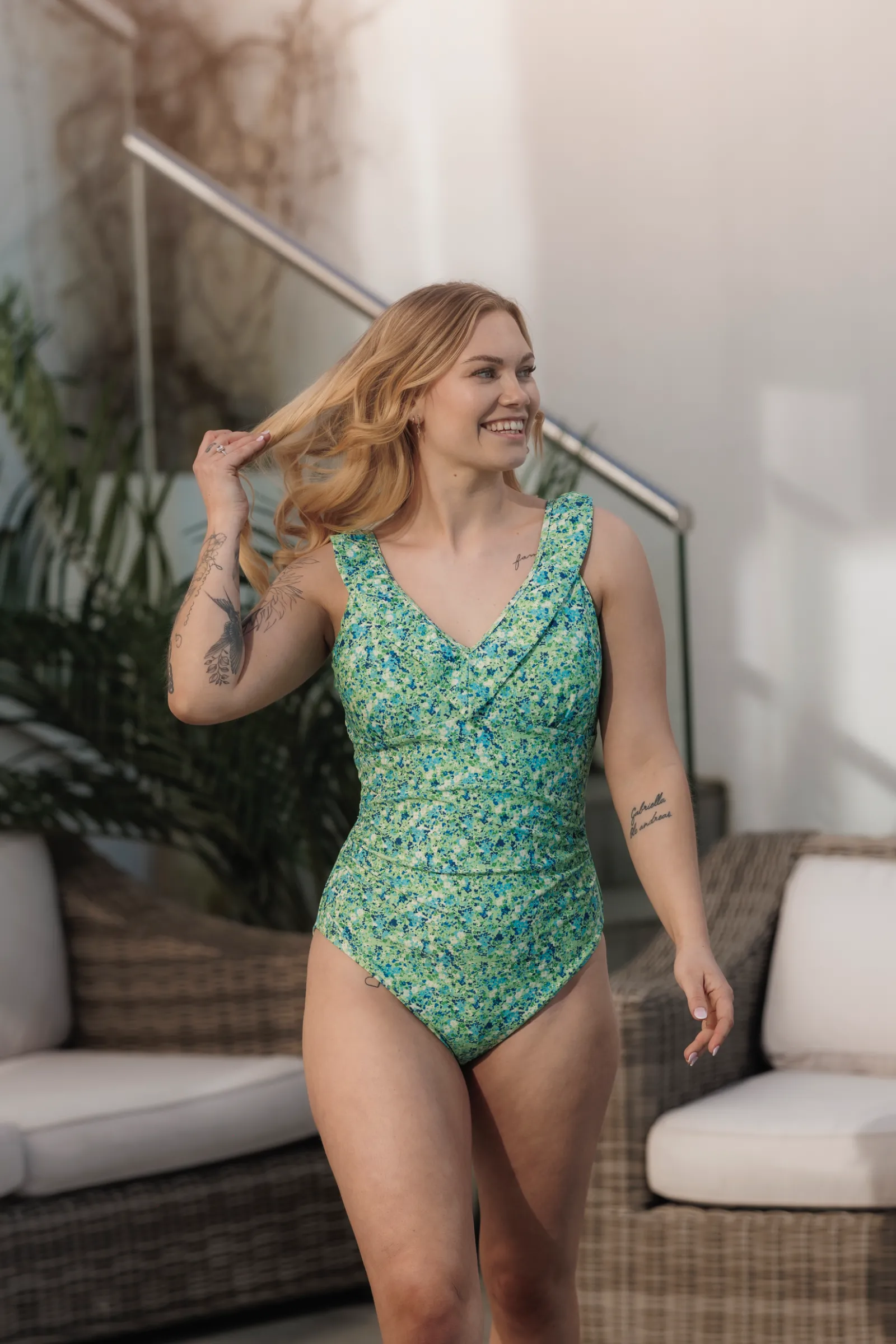 Milano badedrakt er badedrakten du trenger! Denne har justerbare stropper, masse stretch med godt hold og et flatterende snitt. Lekre frynser i bysten og skrunch på siden ved midje/mage så stoffet skaper et pent spill. Vi opplever at badedrakten tilpasser seg veldig godt til både høyt og lavt da modellene går fra 149 cm til 180 cm i høyde!