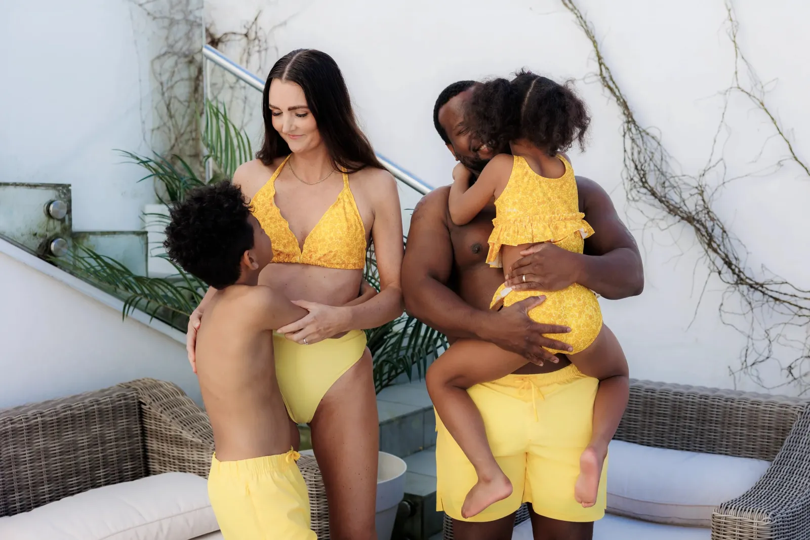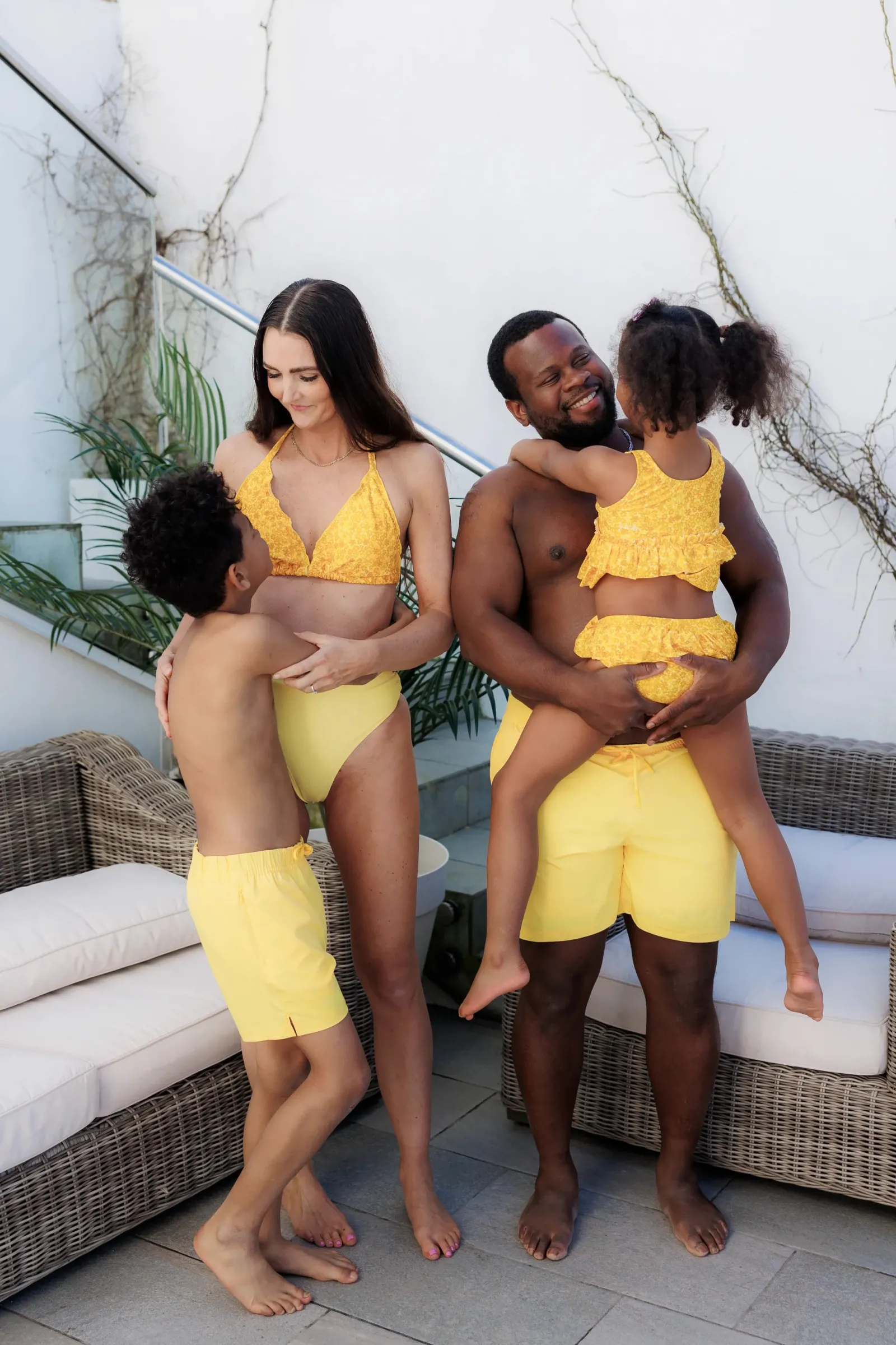 Bikini til barn i topp og truse i blomstrete print. Den var fine volanger rundt mage og hofter.