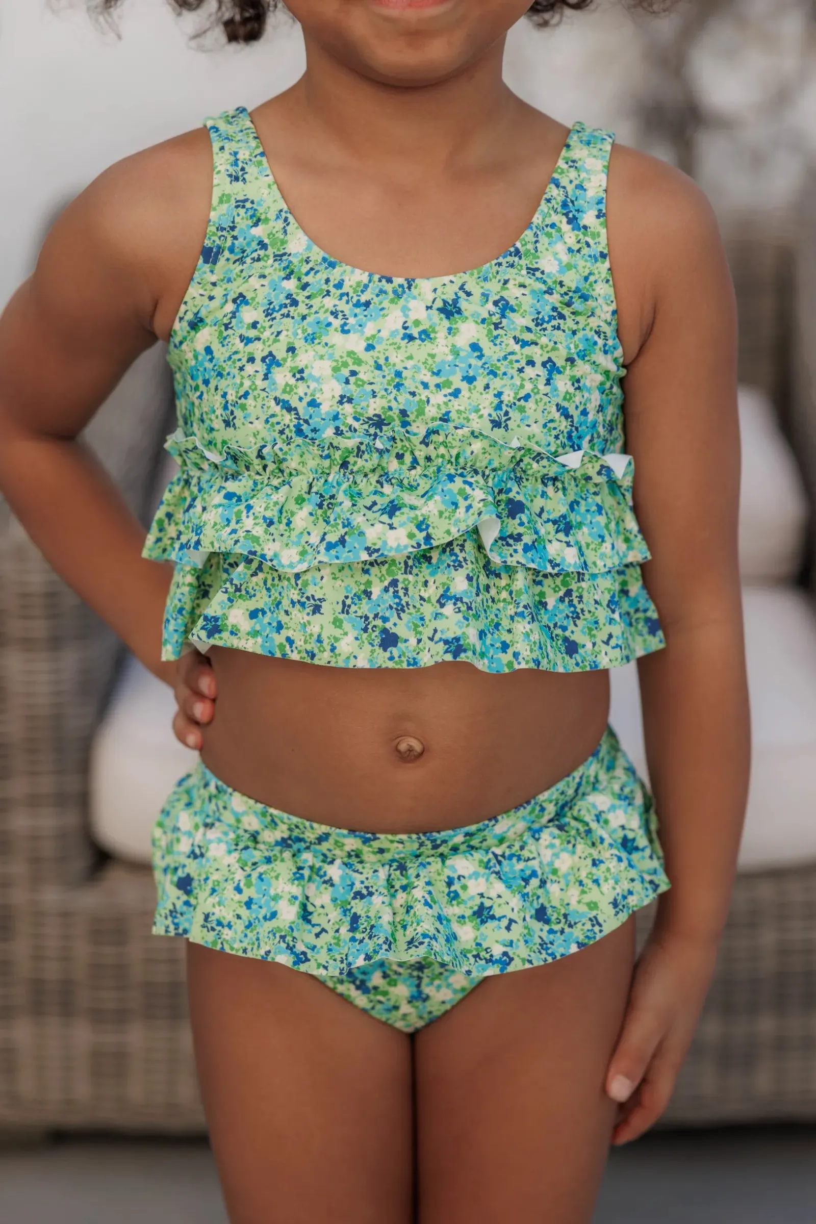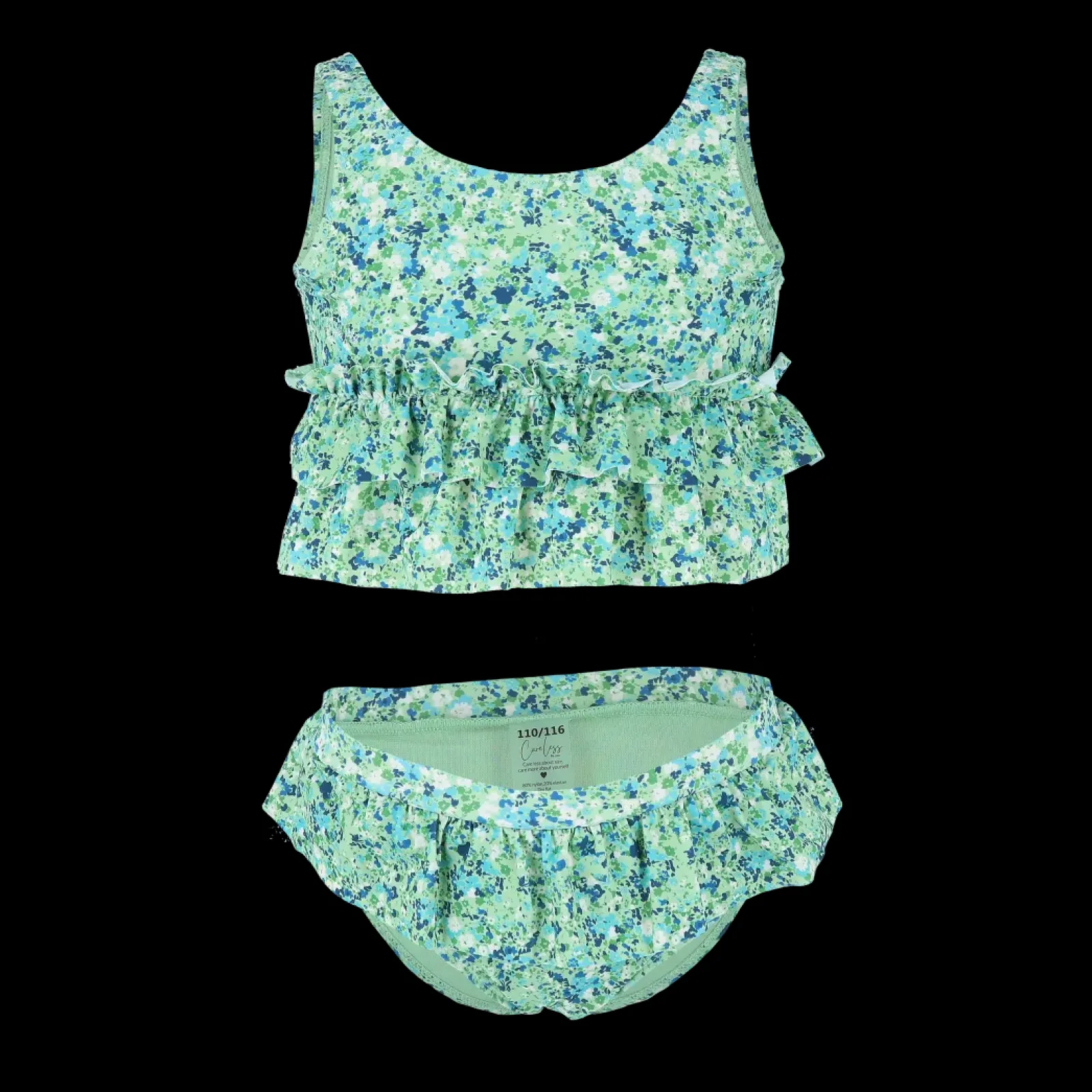 Bikini til barn i topp og truse i blomstrete print. Den var fine volanger rundt mage og hofter.
