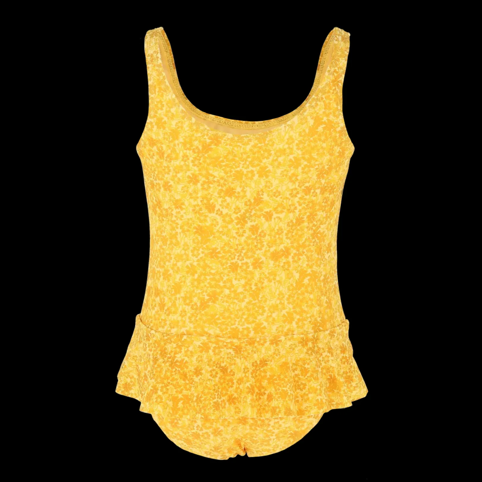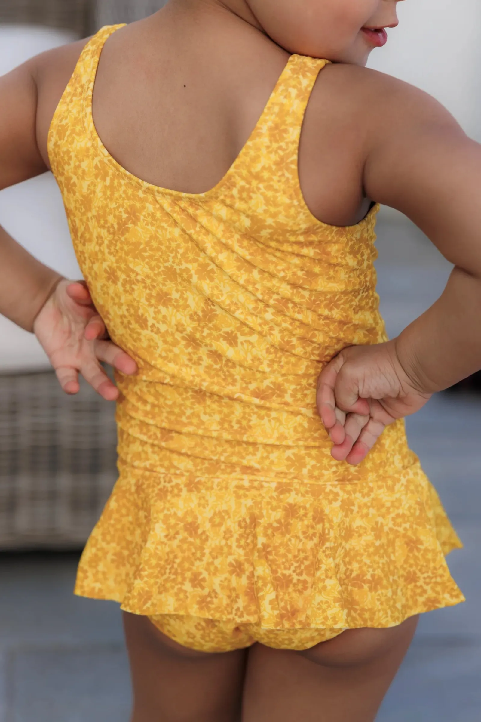Badedrakt til barn i blomstrete print. Den var fine volanger rundt hoftene.