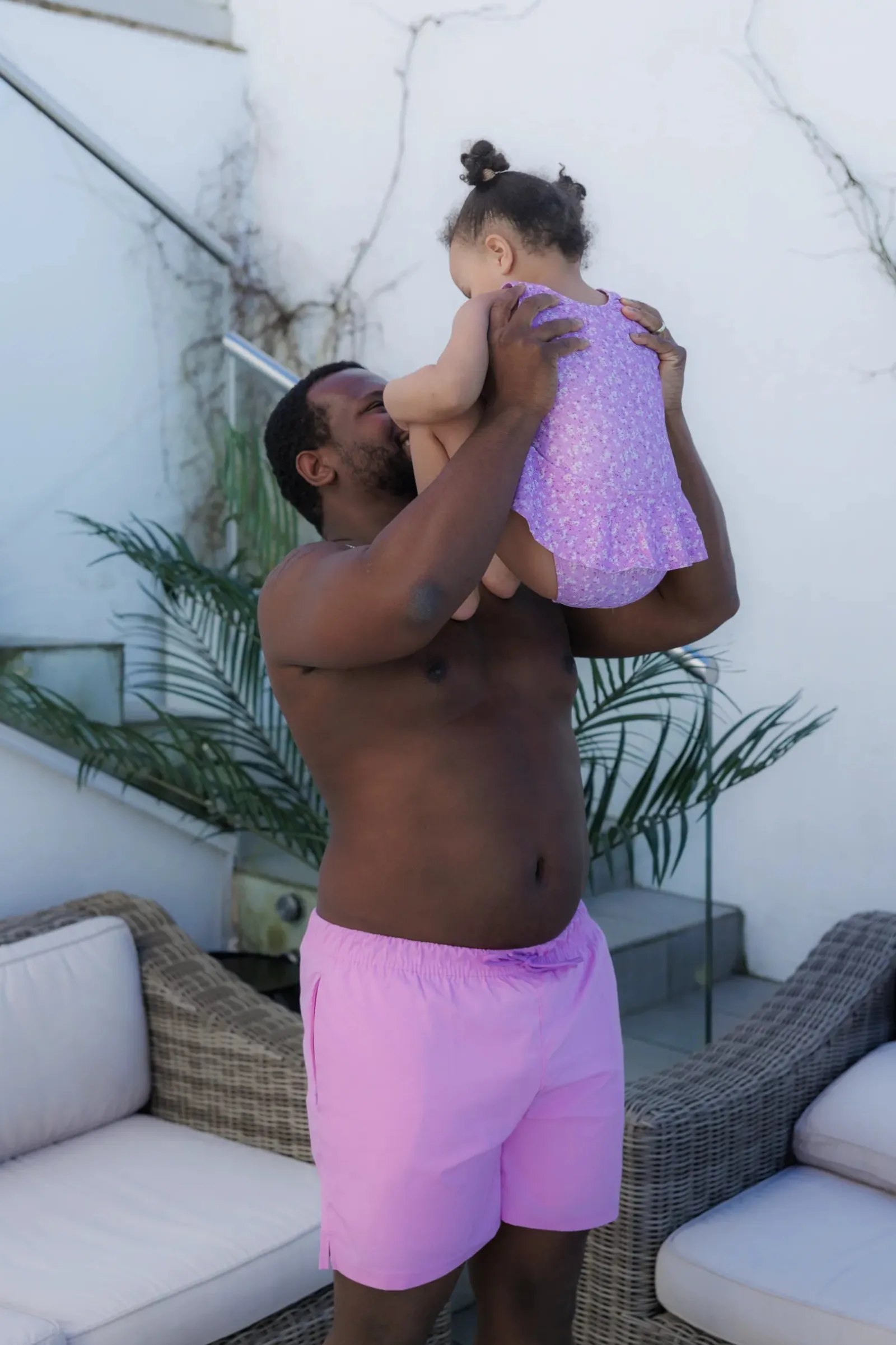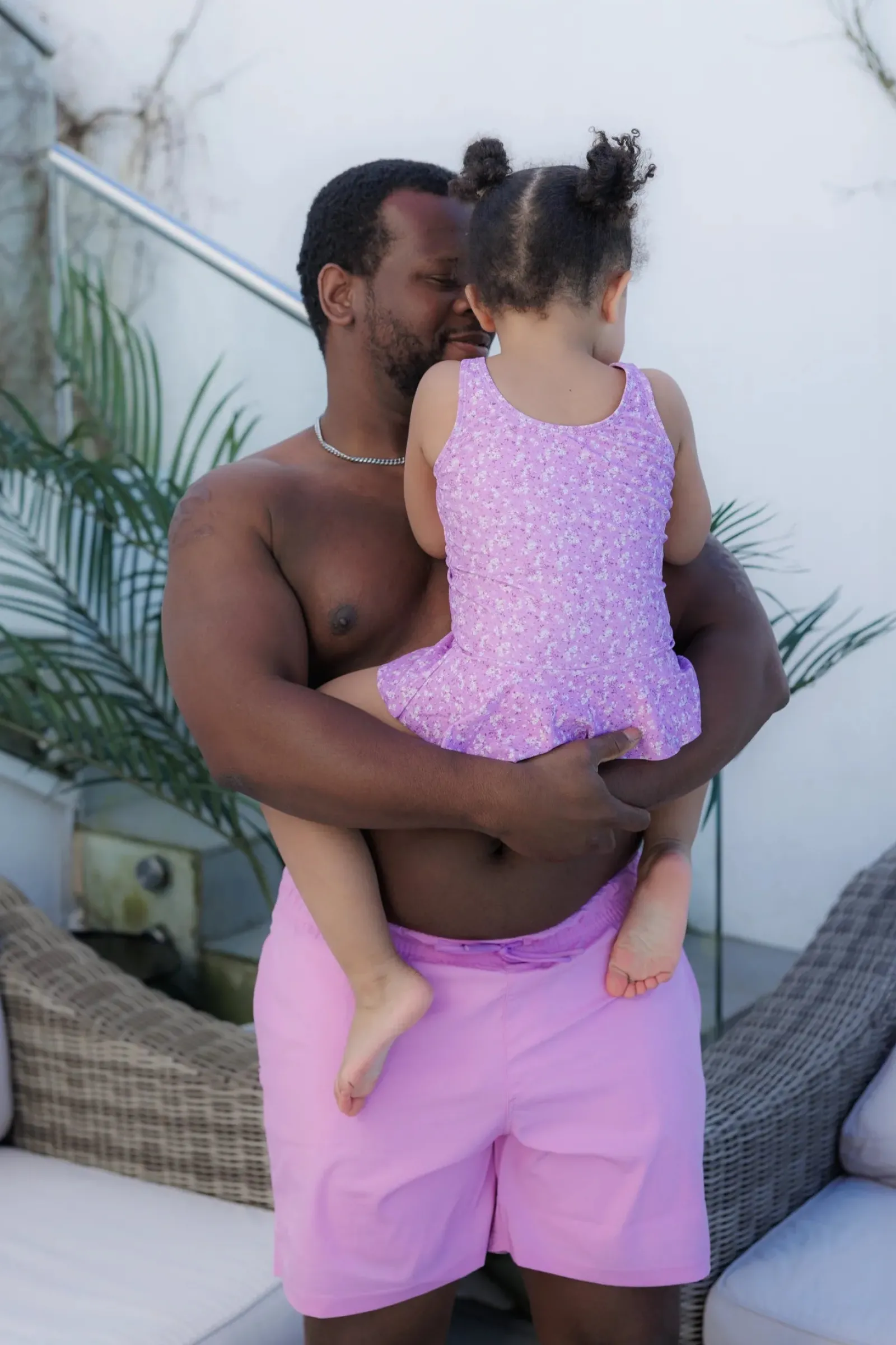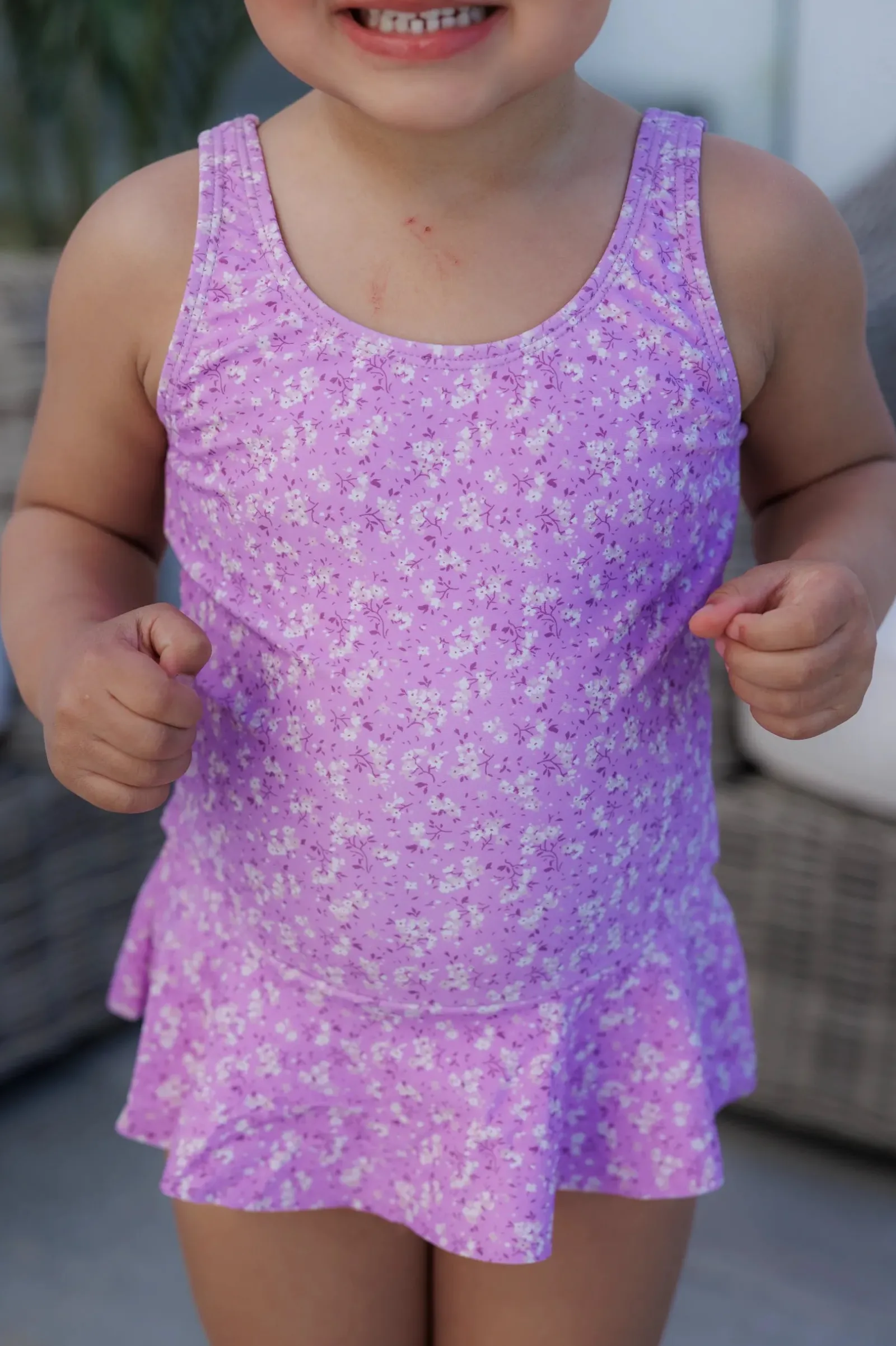 Badedrakt til barn i blomstrete print. Den var fine volanger rundt hoftene.