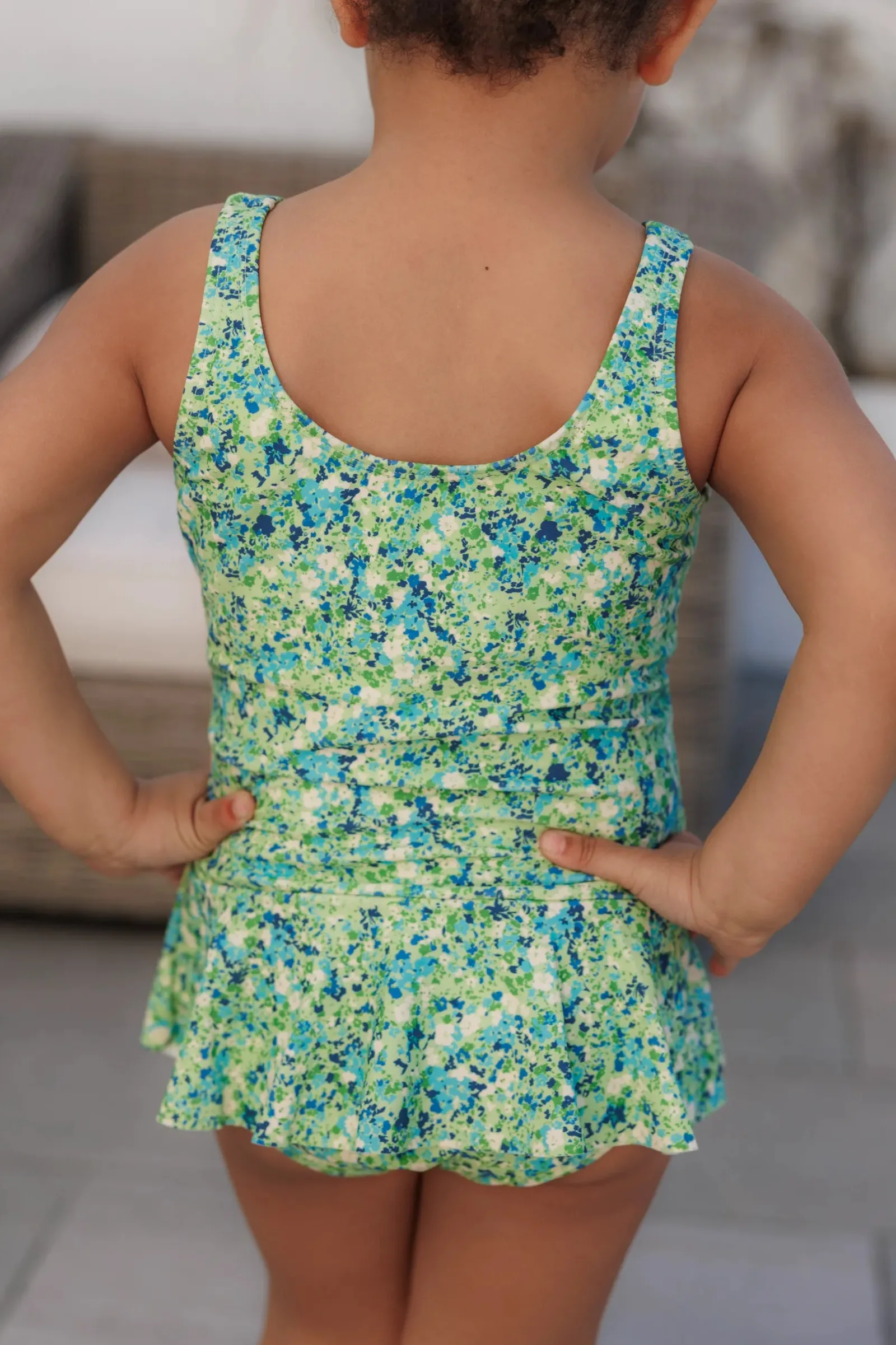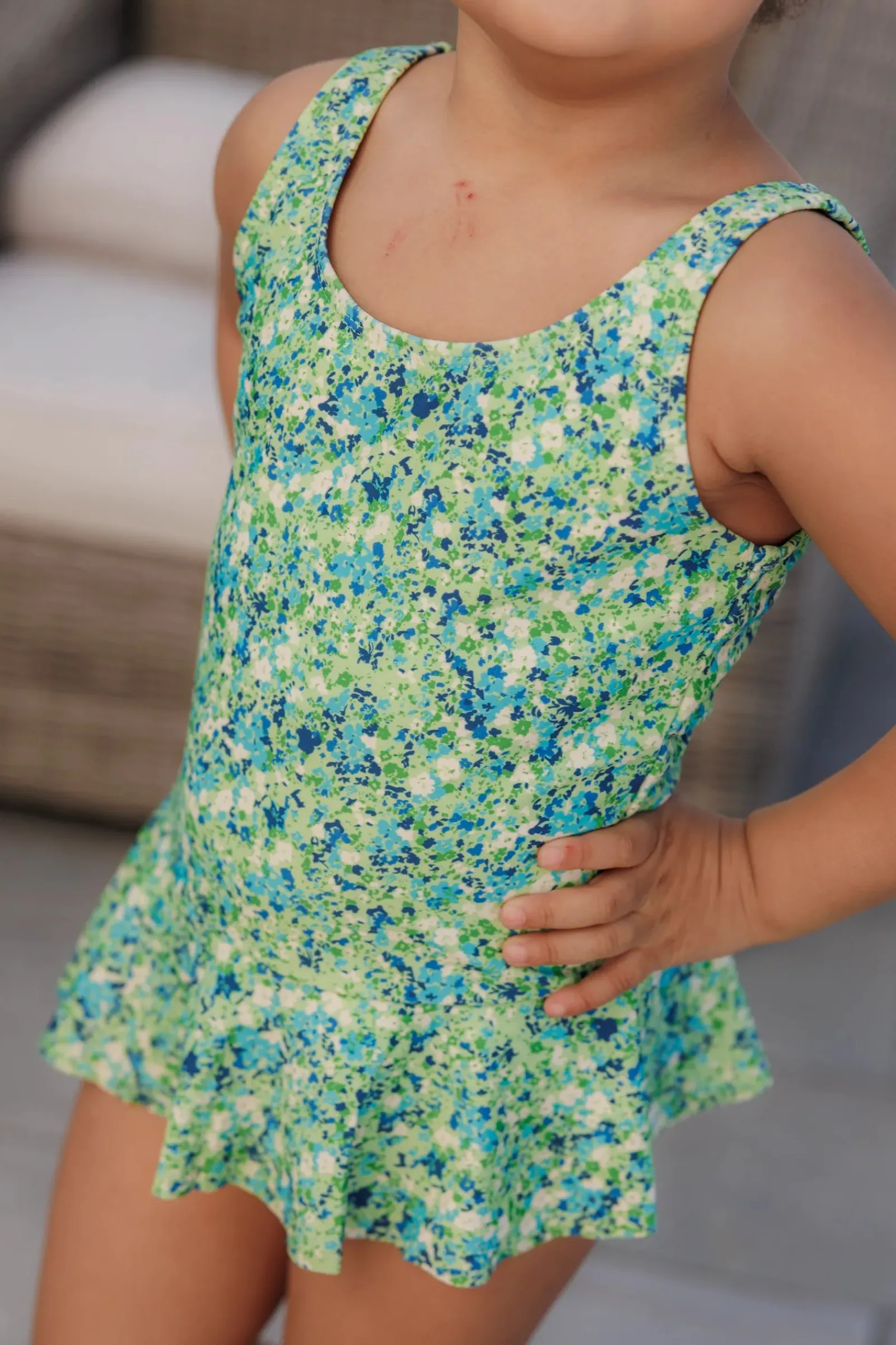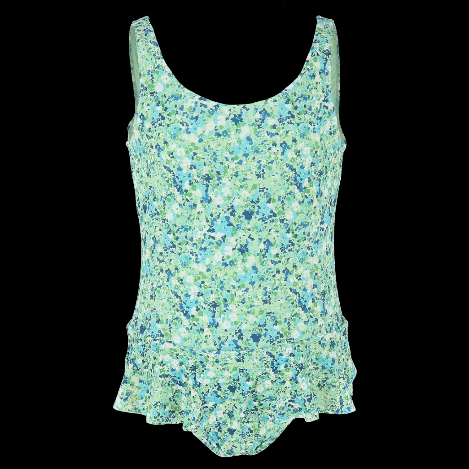 Badedrakt til barn i blomstrete print. Den var fine volanger rundt hoftene.