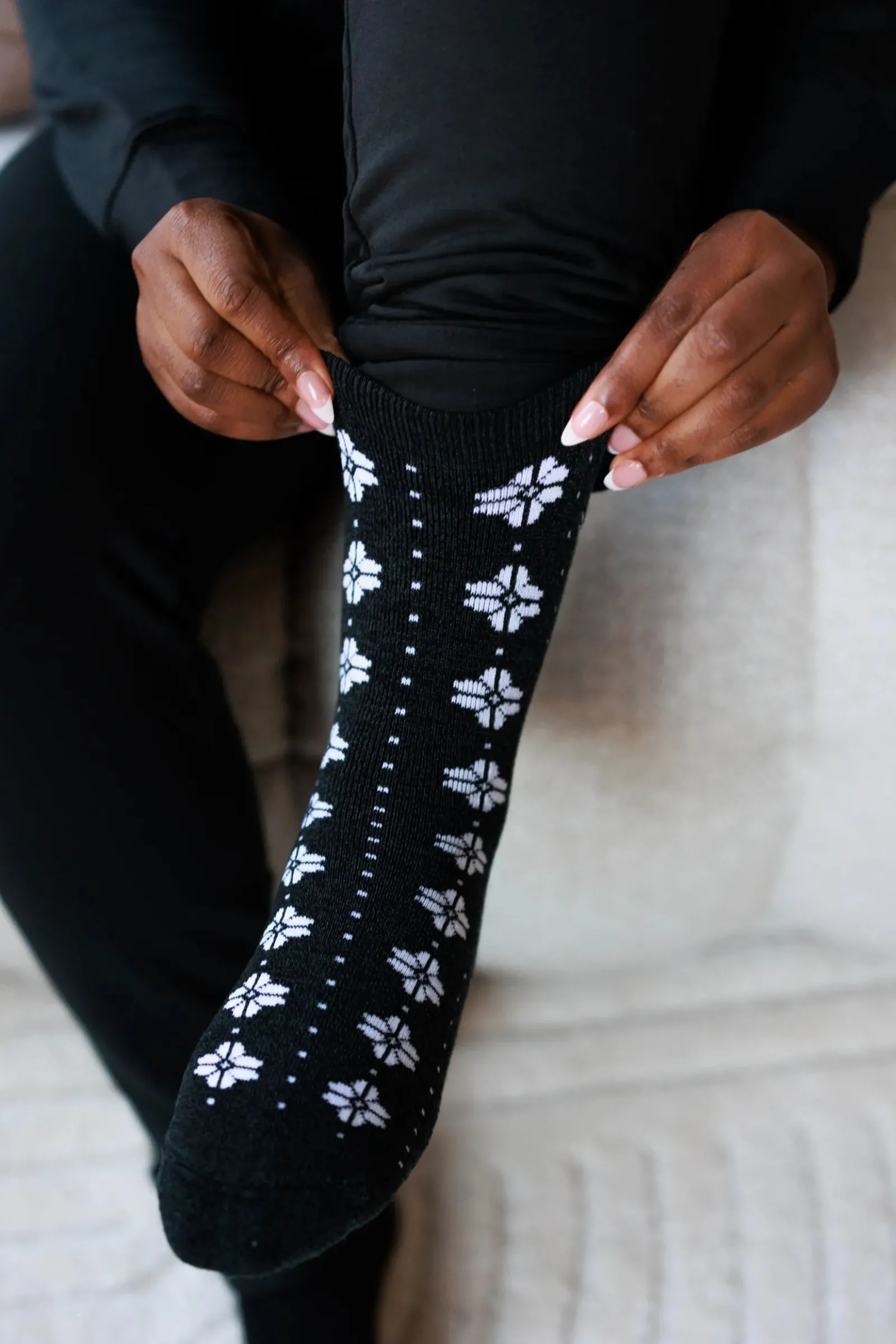 Disse sokkene er svarte med et hvitt mønster inspirert av vinter og snø. Laget av en herlig blanding av ull og viskose av bambus, så om du leter etter varme og behagelige sokker til vinteren er disse perfekt for deg.