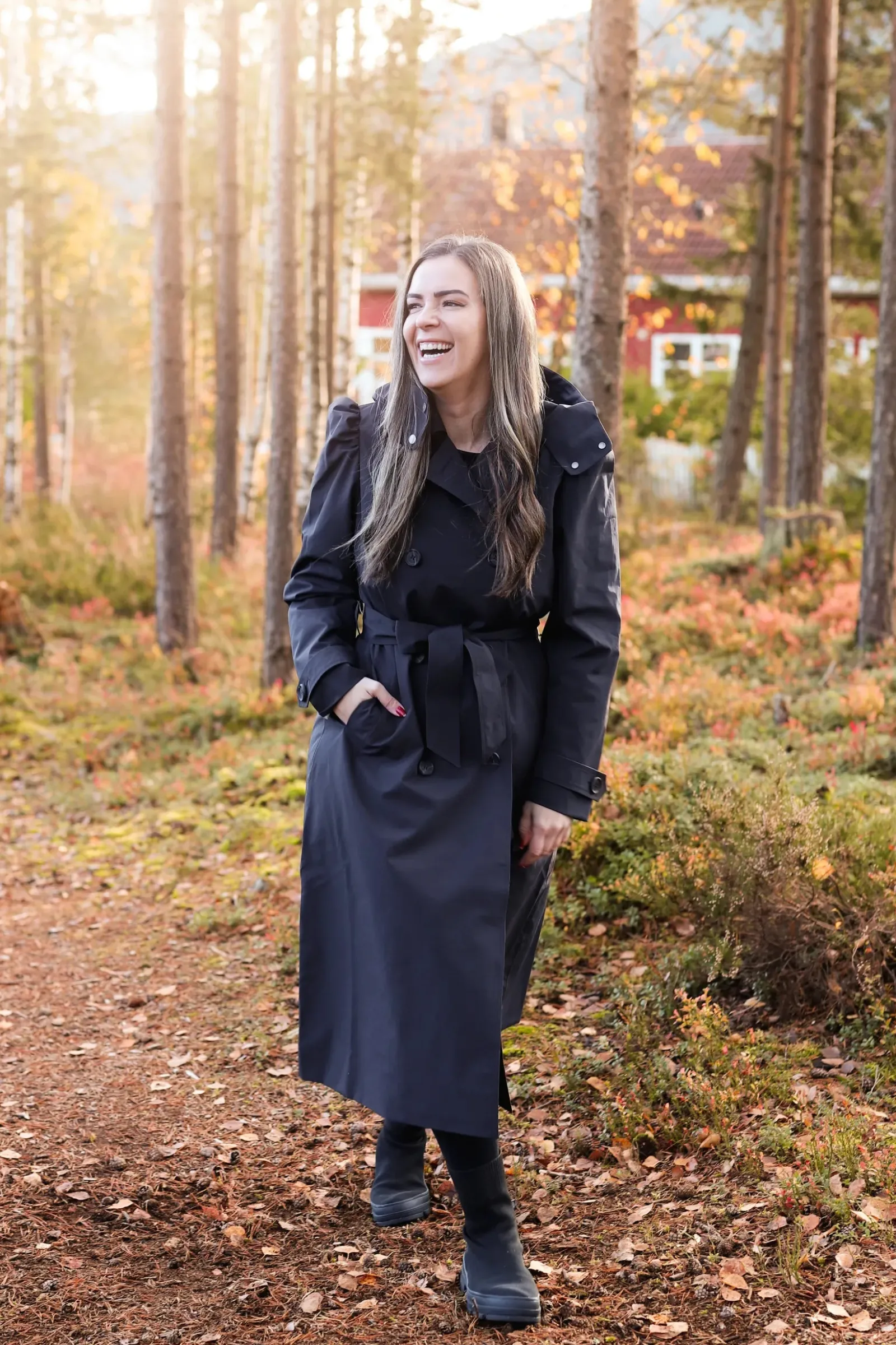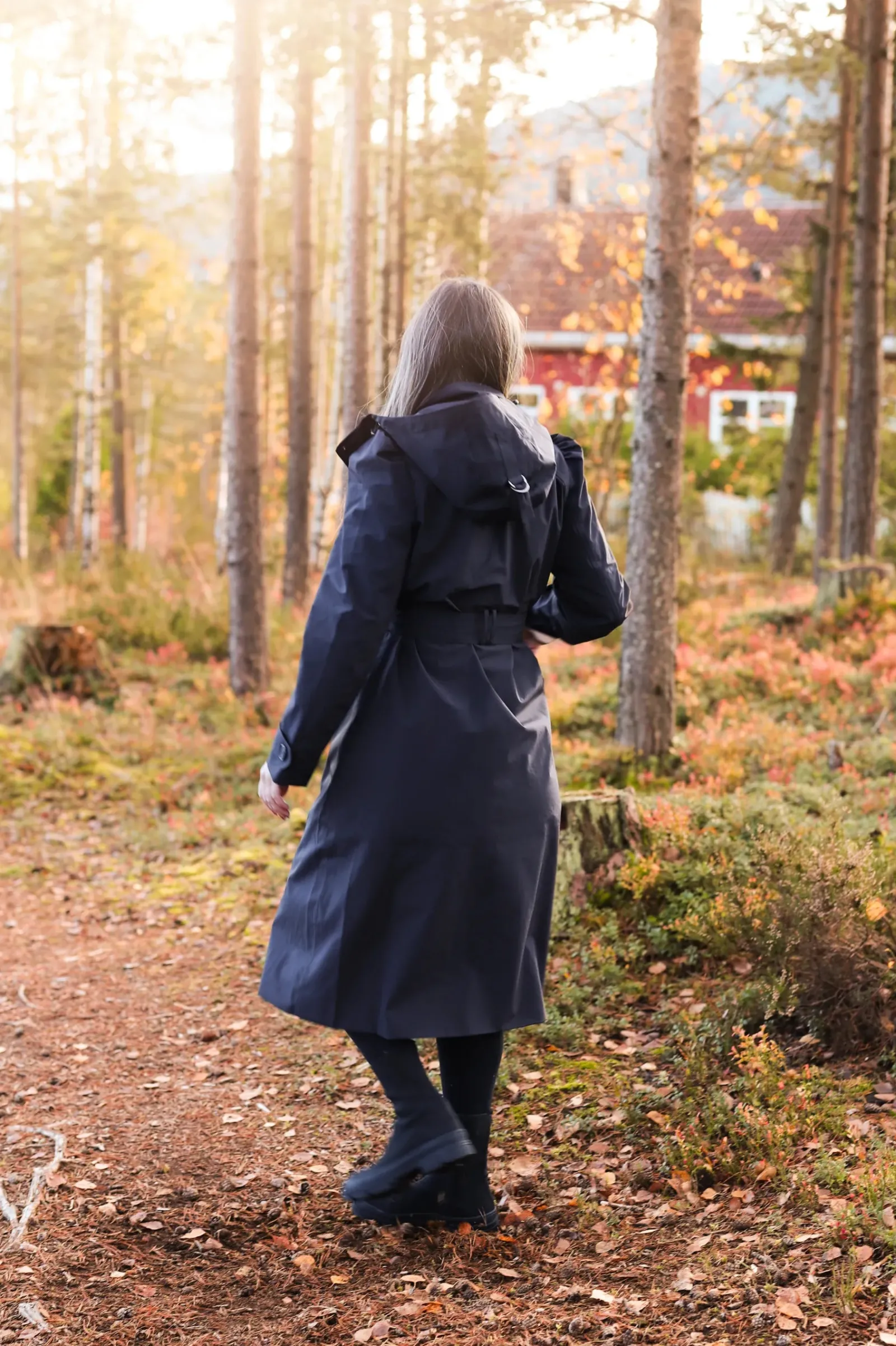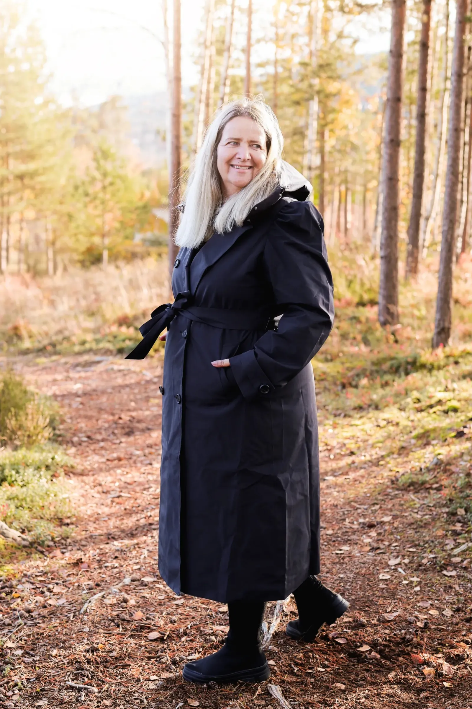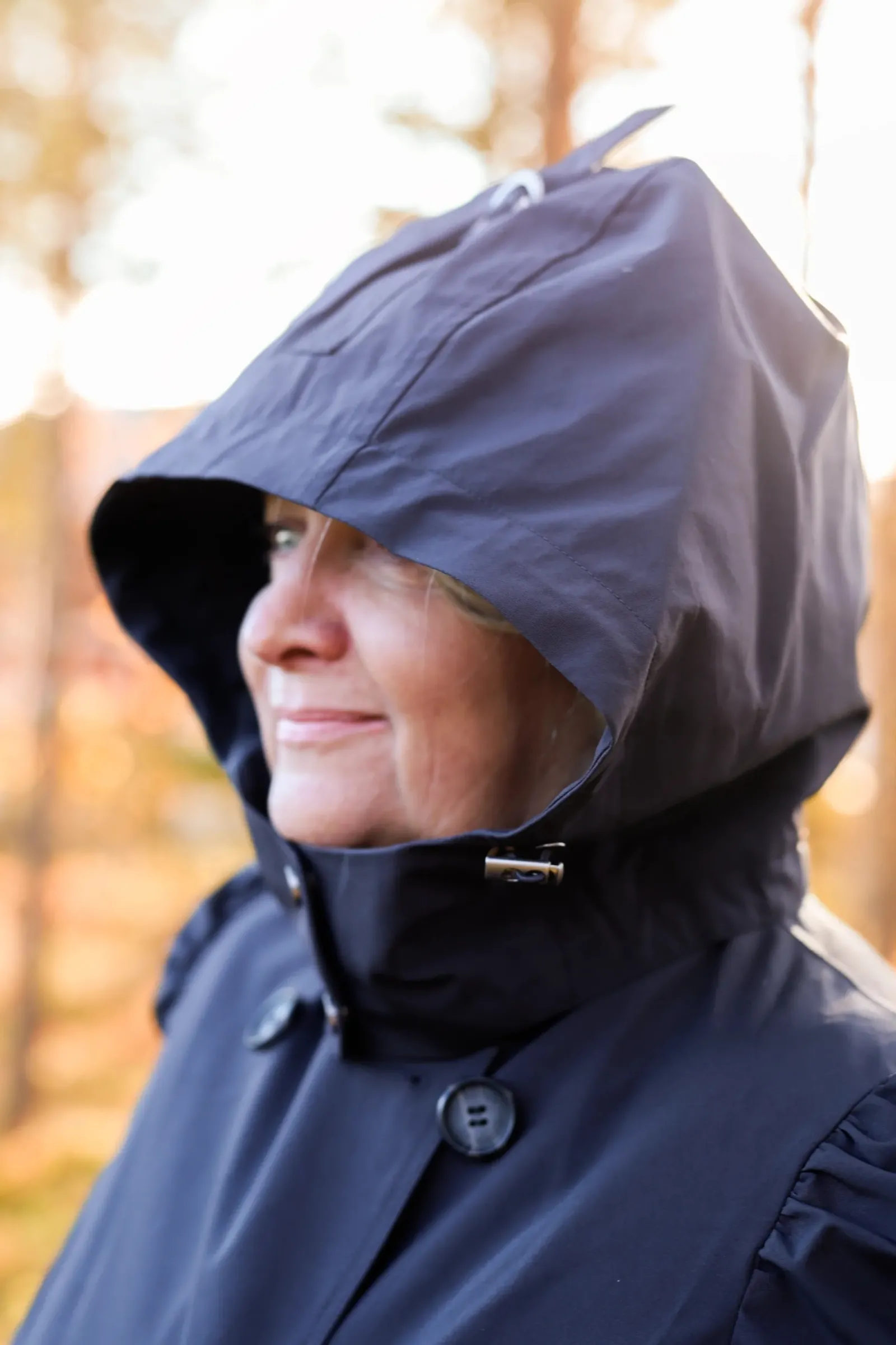 Den er dobbeltspent med knytebelte i midjen. Høy krage og justerbar hette for ekstra skjerming for regn og vind. Volum på skuldrene for en feminin touch.