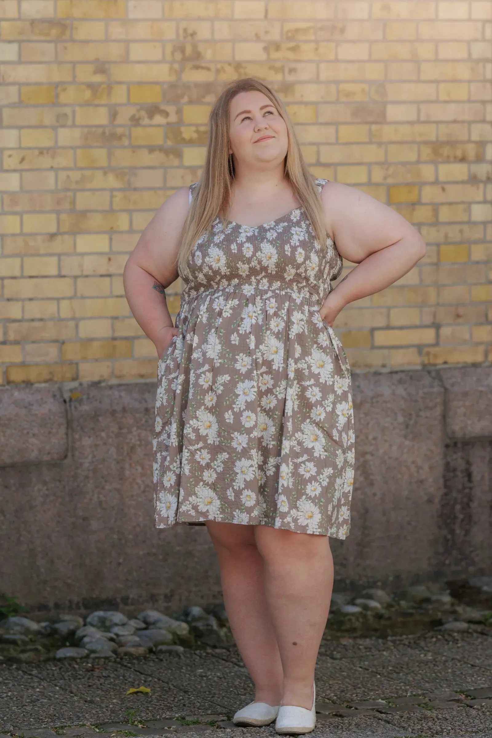 Vera er en sommerlig og feminin kjole. Den har et beige stoff med et delikat blomstermønster. Kjolen har brede stropper og et smockliv som gir en komfortabel og flatterende passform. Skjørtet er lett og luftig, faller i myke folder og rekker til rett over knærne. Dette gjør kjolen ideell for varme sommerdager, og den har også lommer som gir et praktisk og avslappet preg.