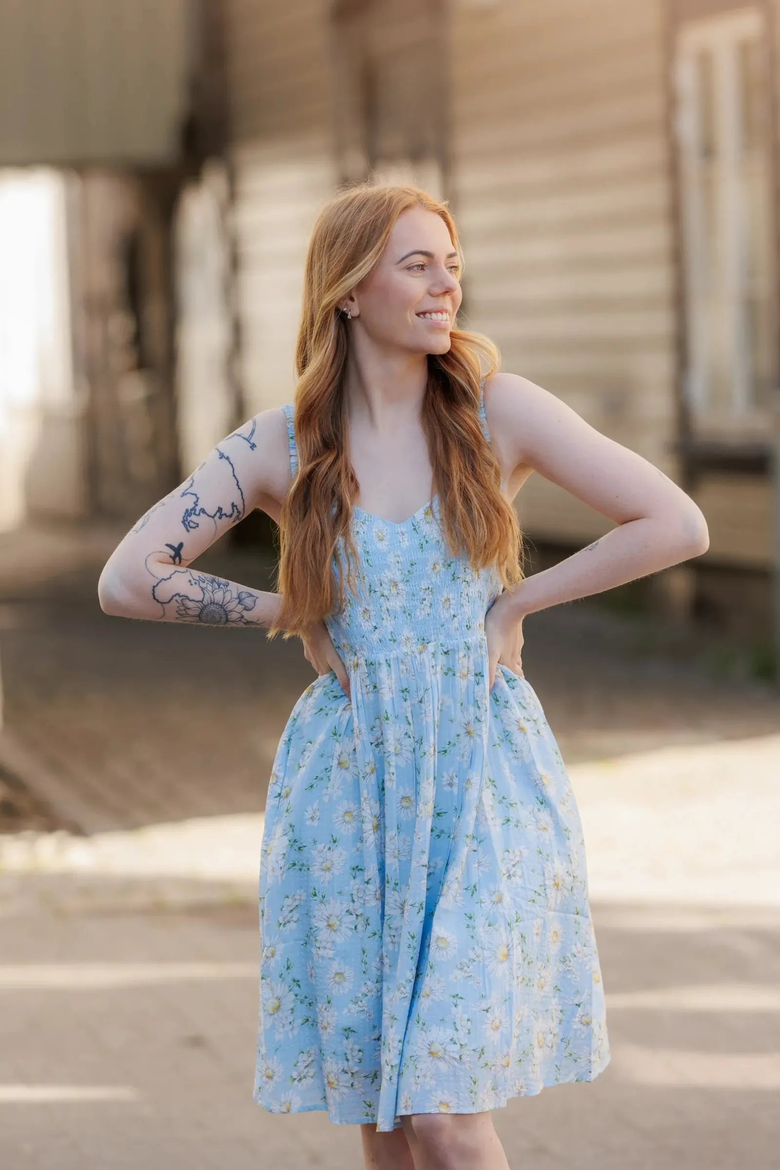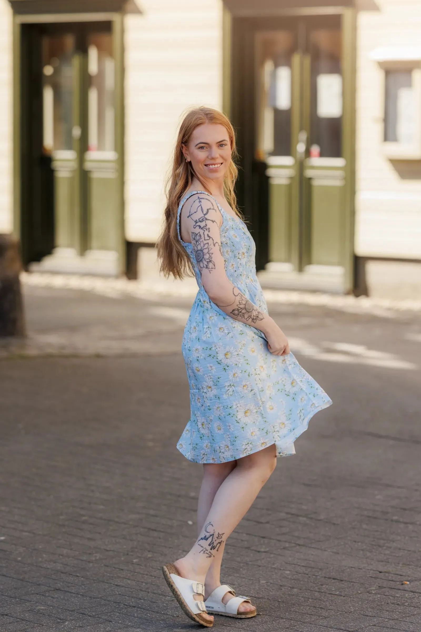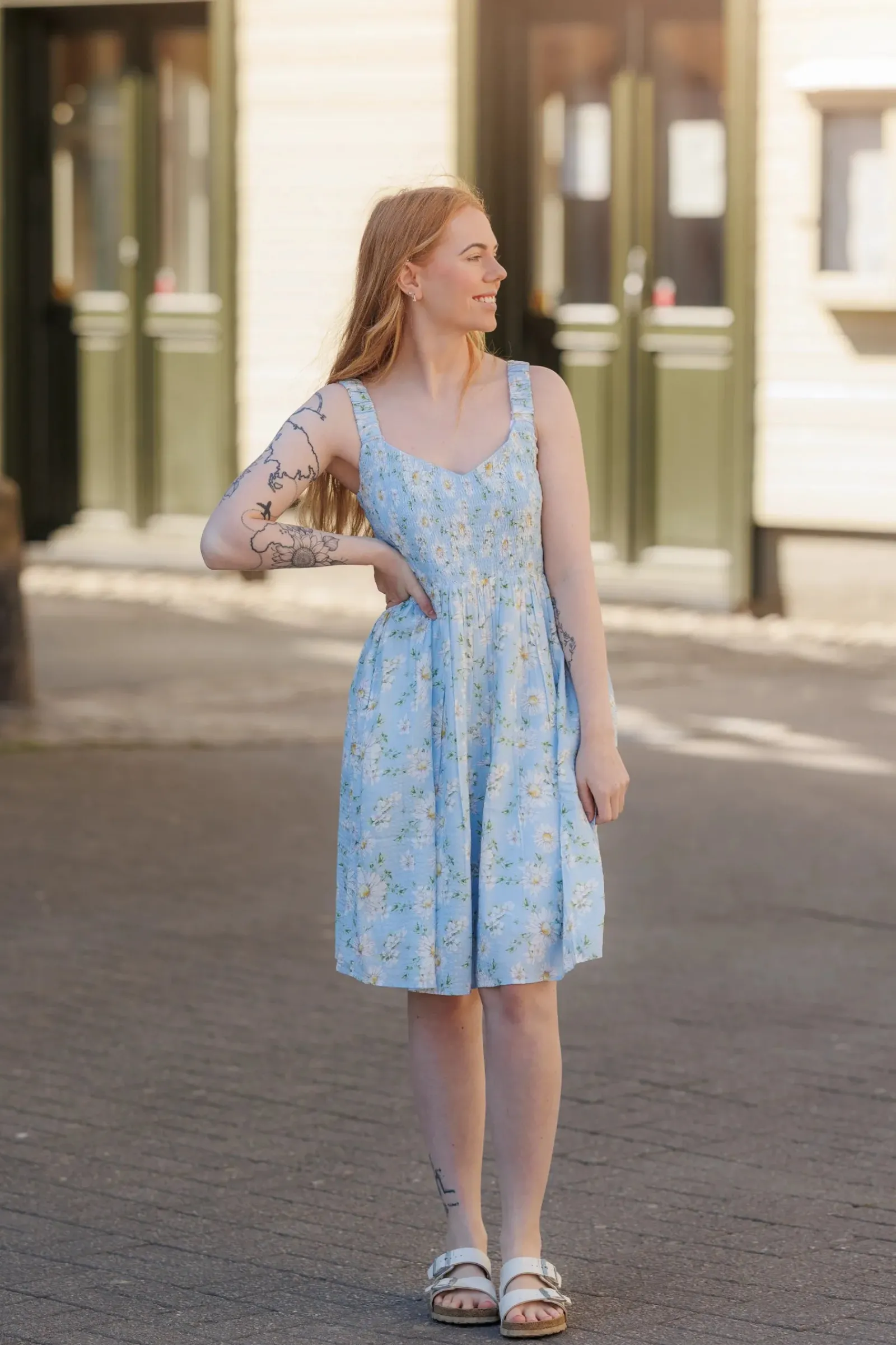 Vera er en sommerlig og feminin kjole. Den har et lyseblått stoff med et delikat blomstermønster. Kjolen har brede stropper og et smockliv som gir en komfortabel og flatterende passform. Skjørtet er lett og luftig, faller i myke folder og rekker til rett over knærne. Dette gjør kjolen ideell for varme sommerdager, og den har også lommer som gir et praktisk og avslappet preg.