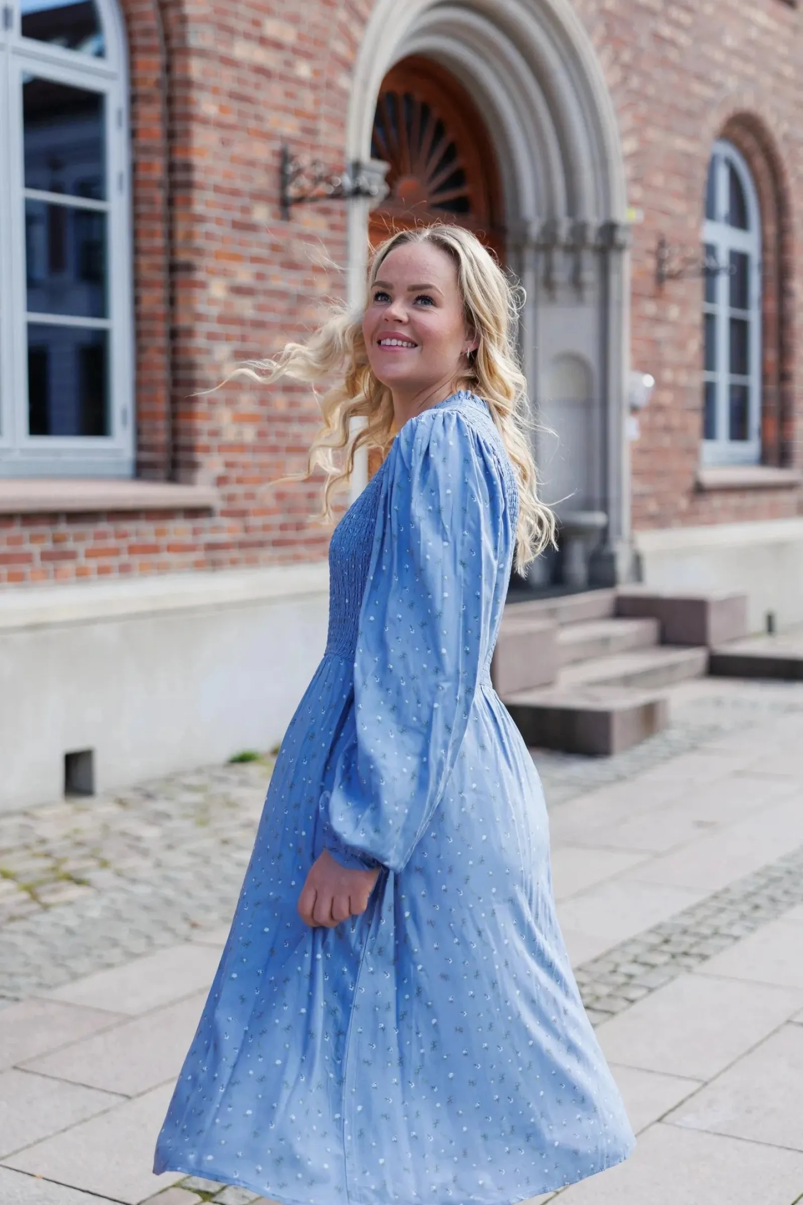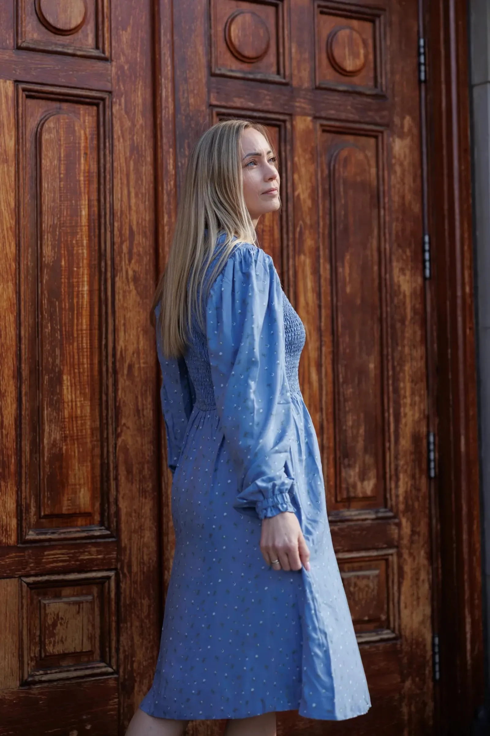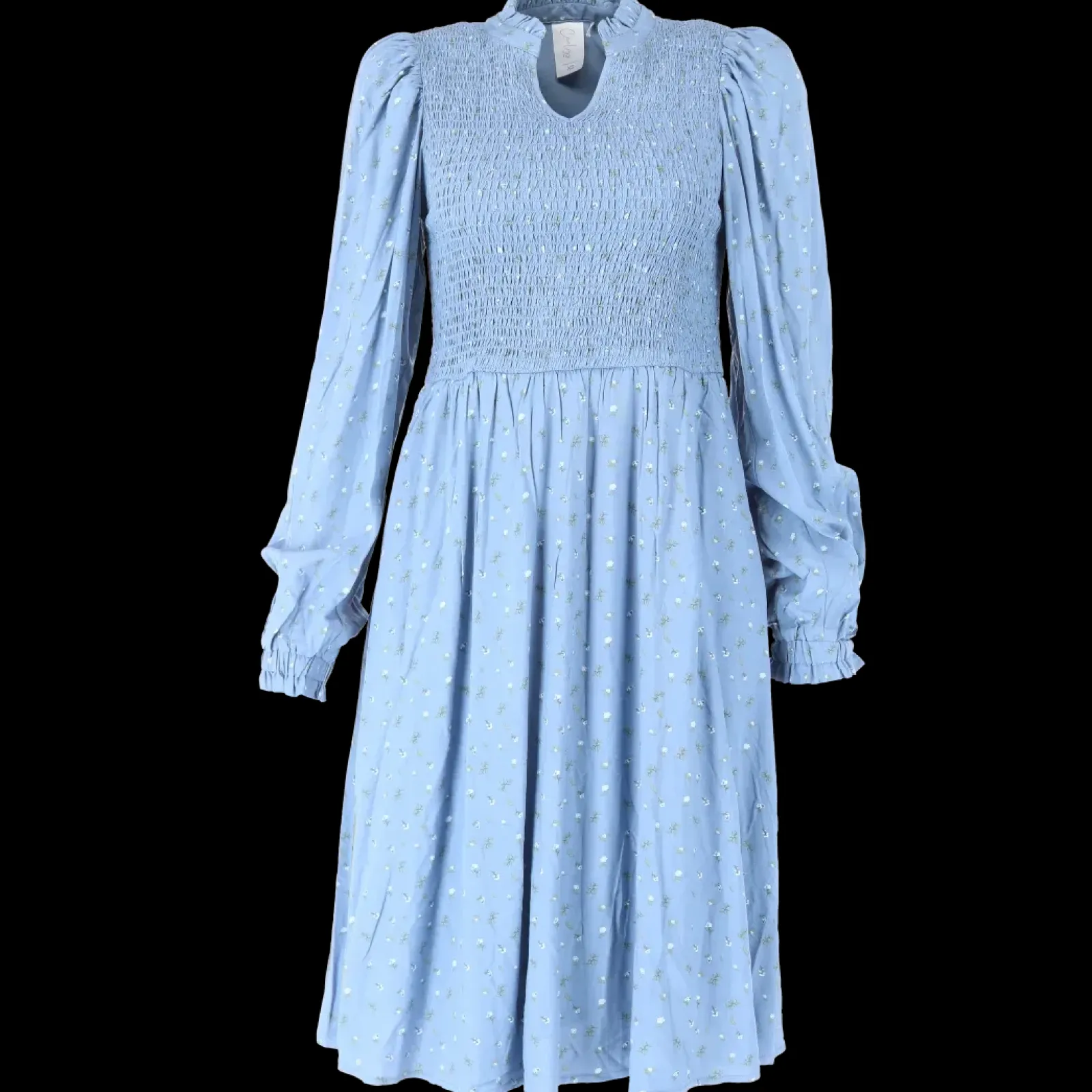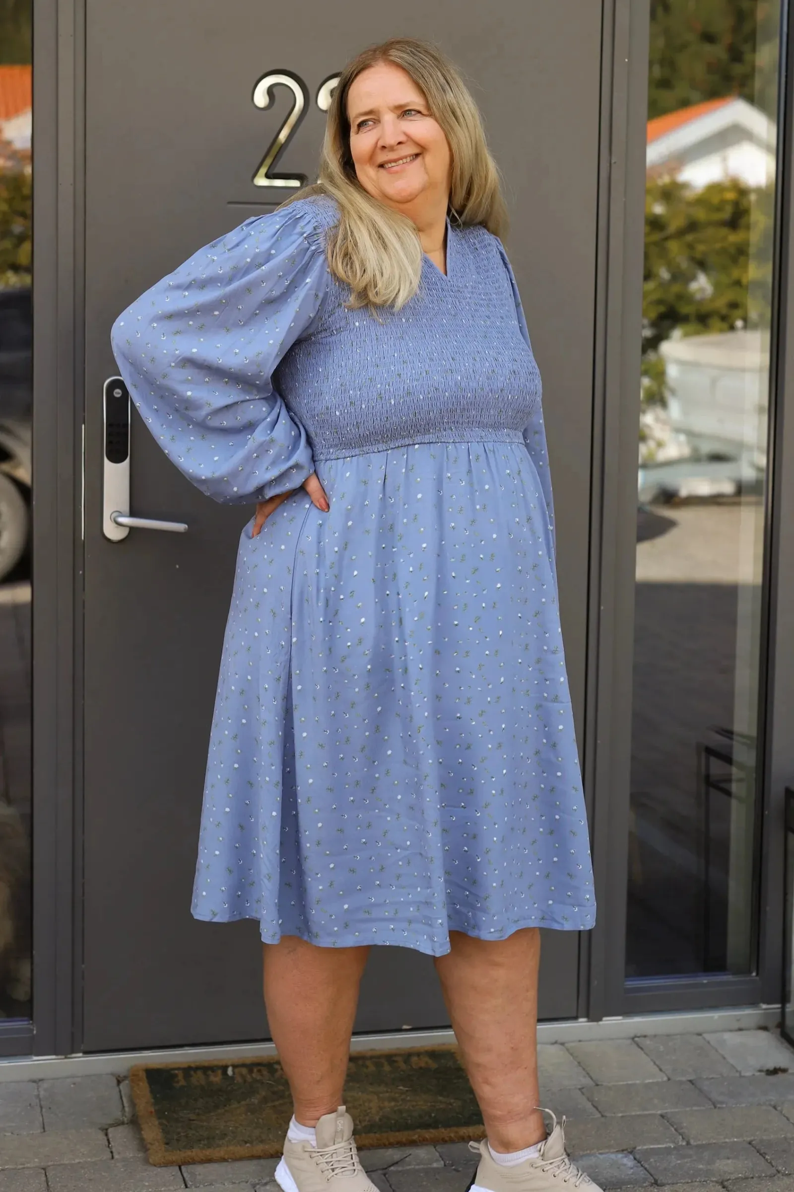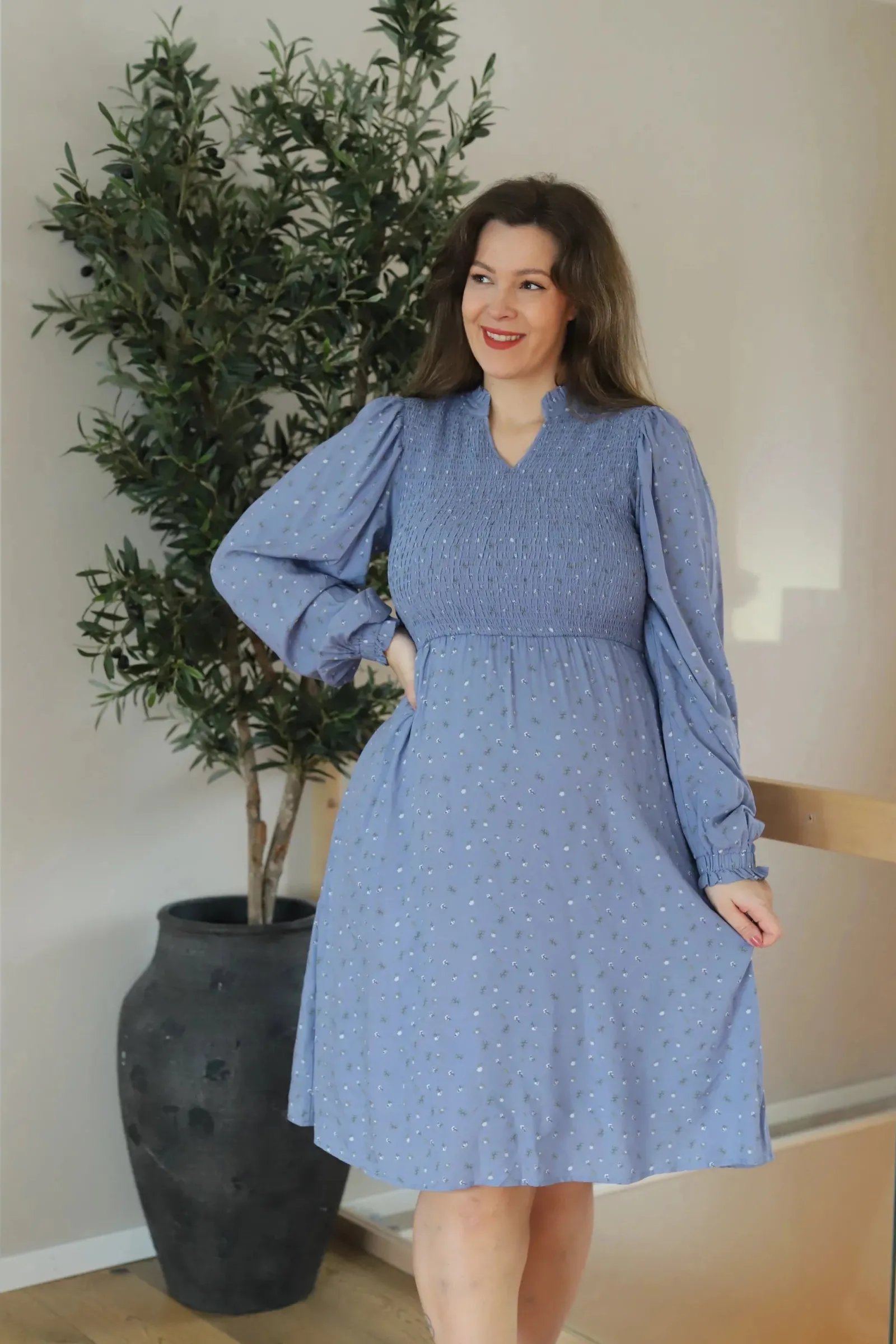 Ada er «lillesøsteren» til Anna med nydelige detaljer ved halsen. Den har volangkrage og en liten v-utringing.Smock rundt hele brystet og et lett og luftig skjørt som skaper en flatterende fasong. Praktiske lommer på begge sider.