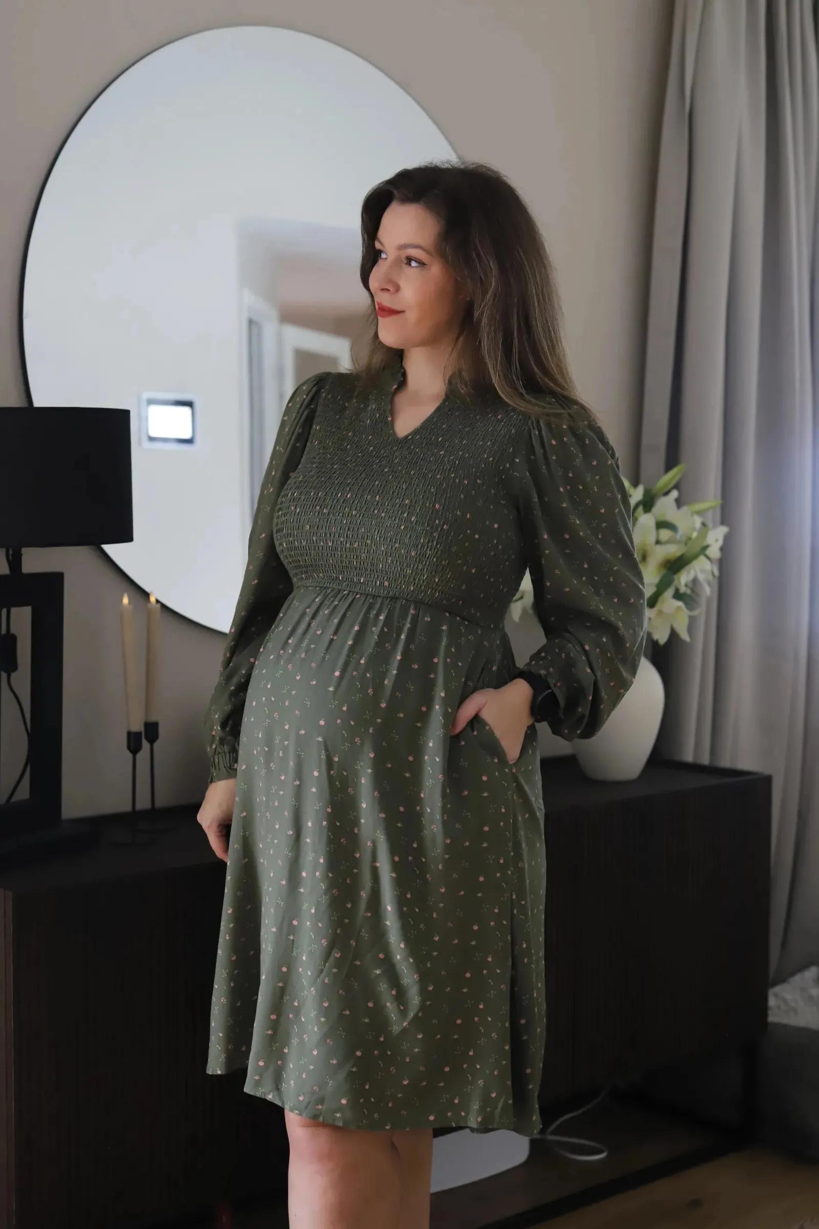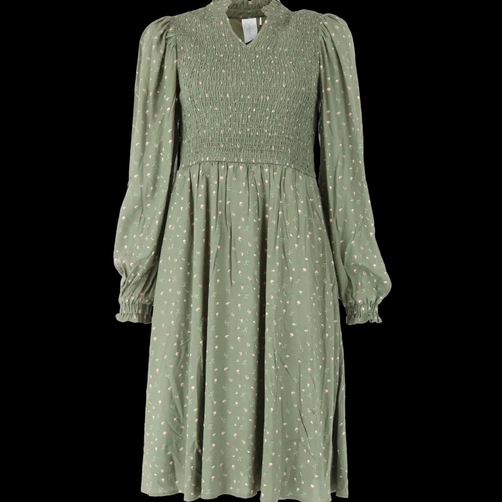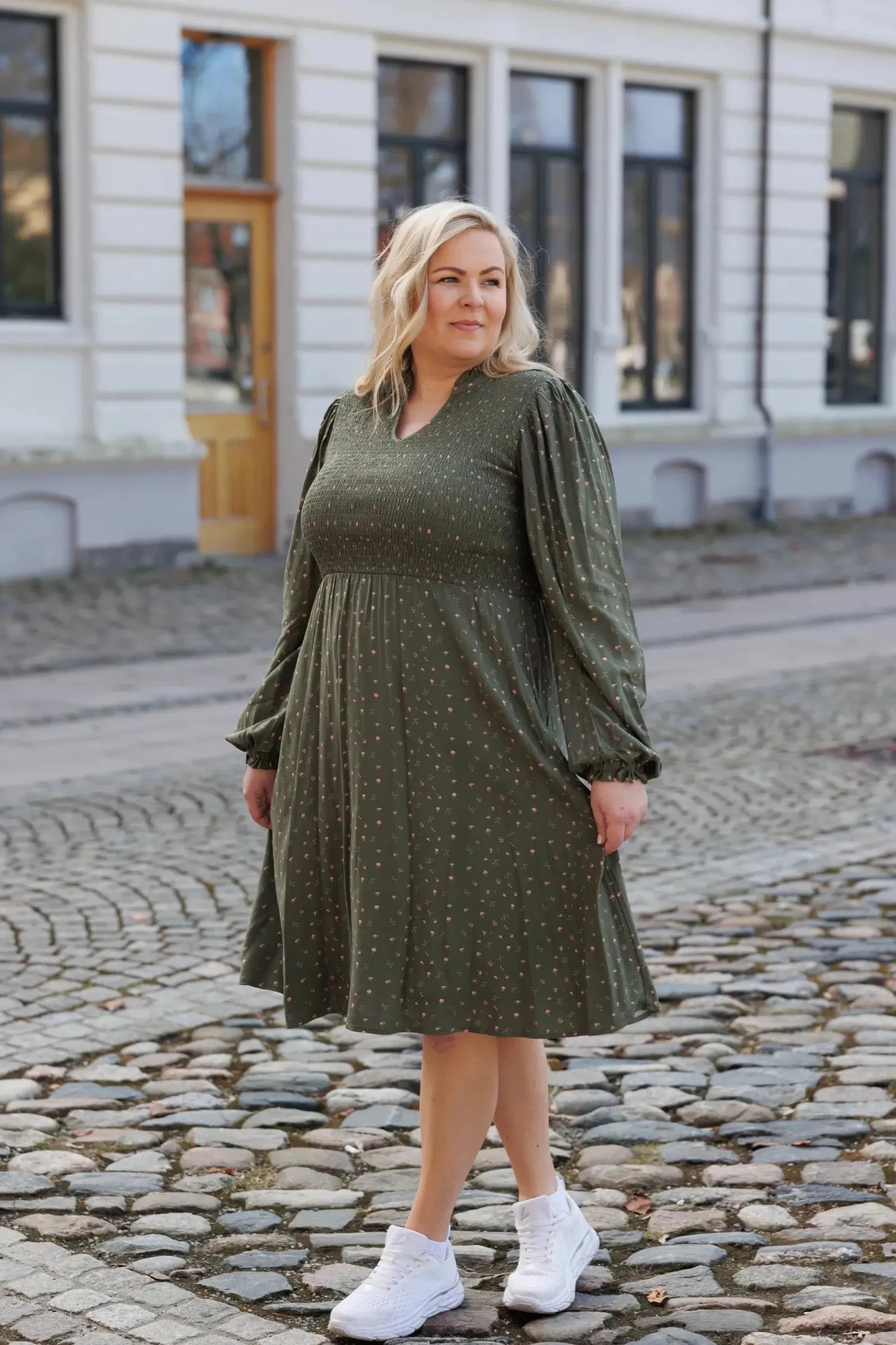 Ada er «lillesøsteren» til Anna med nydelige detaljer ved halsen. Den har volangkrage og en liten v-utringing.Smock rundt hele brystet og et lett og luftig skjørt som skaper en flatterende fasong. Praktiske lommer på begge sider.