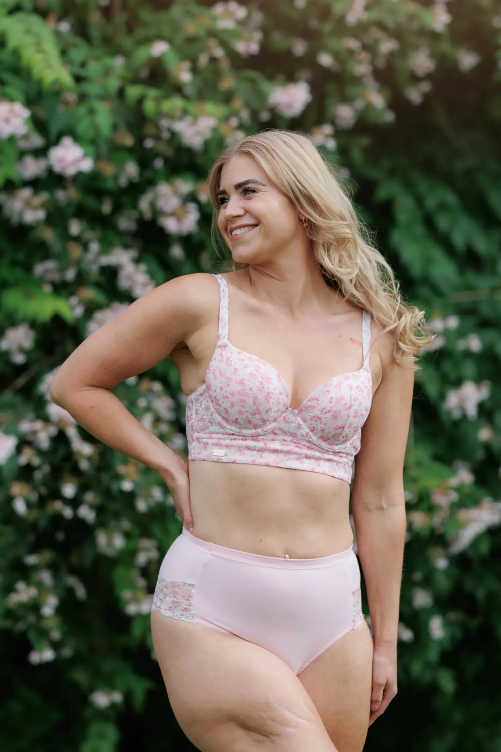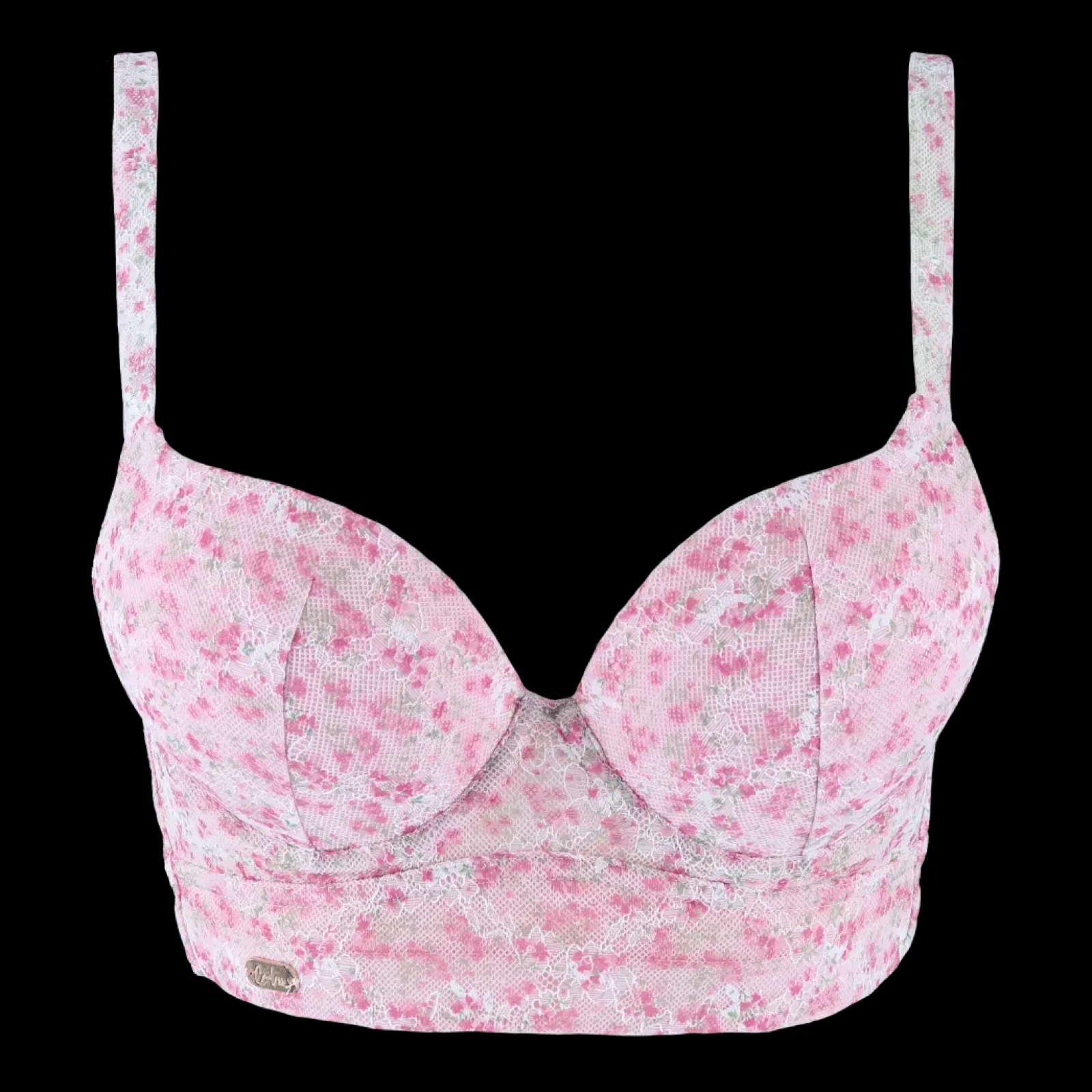 Afrodite Small cup i lyserosa er en BH med bøyle og mye push-up i innleggene. Den er i full blonde med et nydelig blomstermønster trykket i stoffet med flott fargespill. Ment som en mer sexy versjon av vårt undertøy. Det er ikke mulig å ta ut innleggene da de har fast padding.