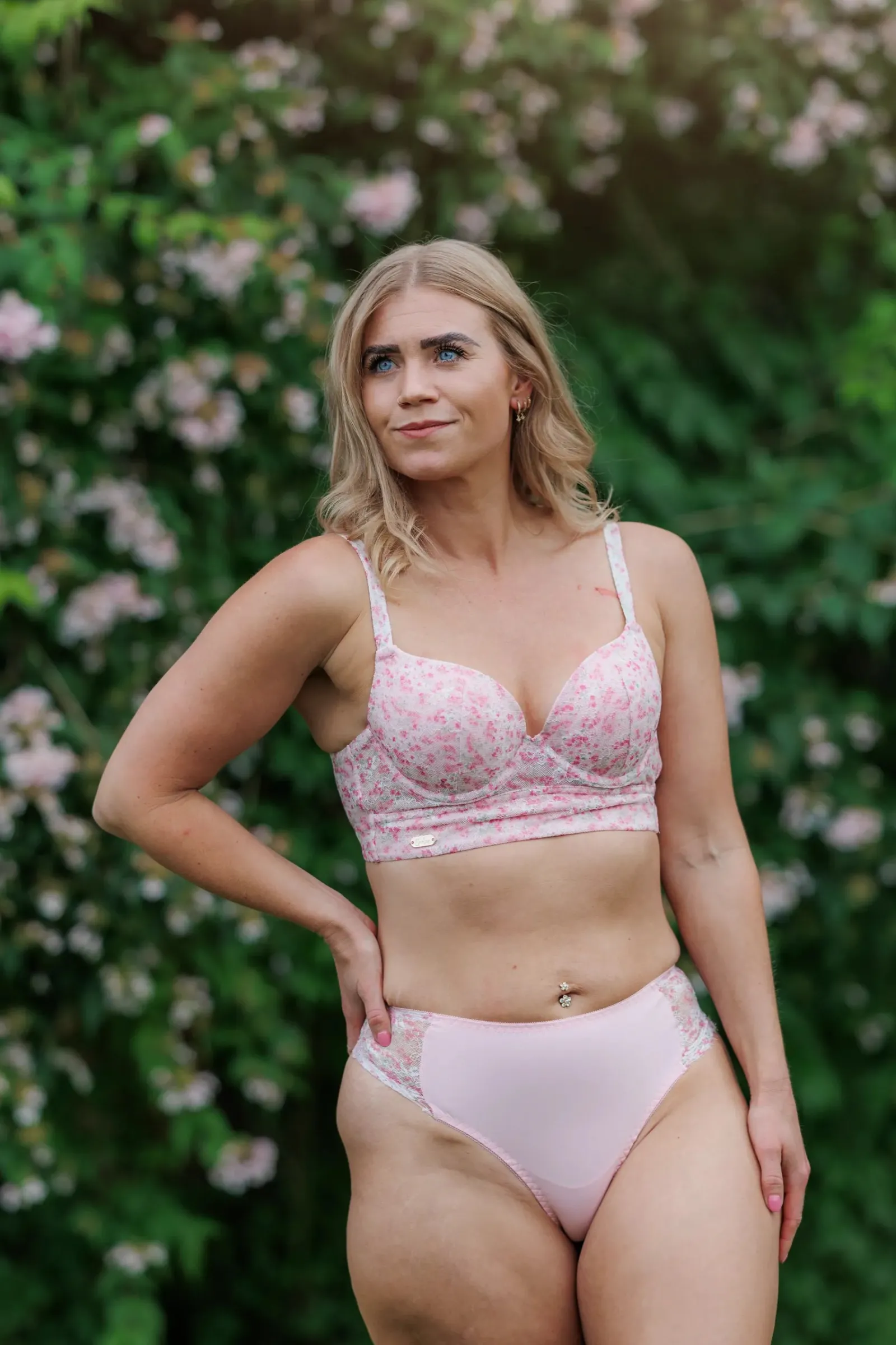 Størrelse er lik som våre andre modeller i omkrets og den er mest lik Amanda i cup. (Amanda har også fast padding. Aline har løs padding og er mest stretchy i bryst av våre modeller).