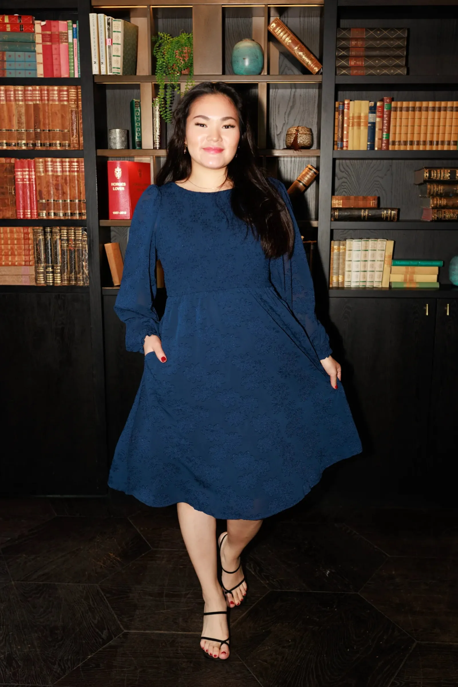 Anna chiffon kjole er en nydelig kjole til sesongens finere anledninger. Den har flatterende snitt, lekre ballongermer og smock rundt hele front og rygg for en god tilpasningsevne. Praktiske lommer på begge sider.