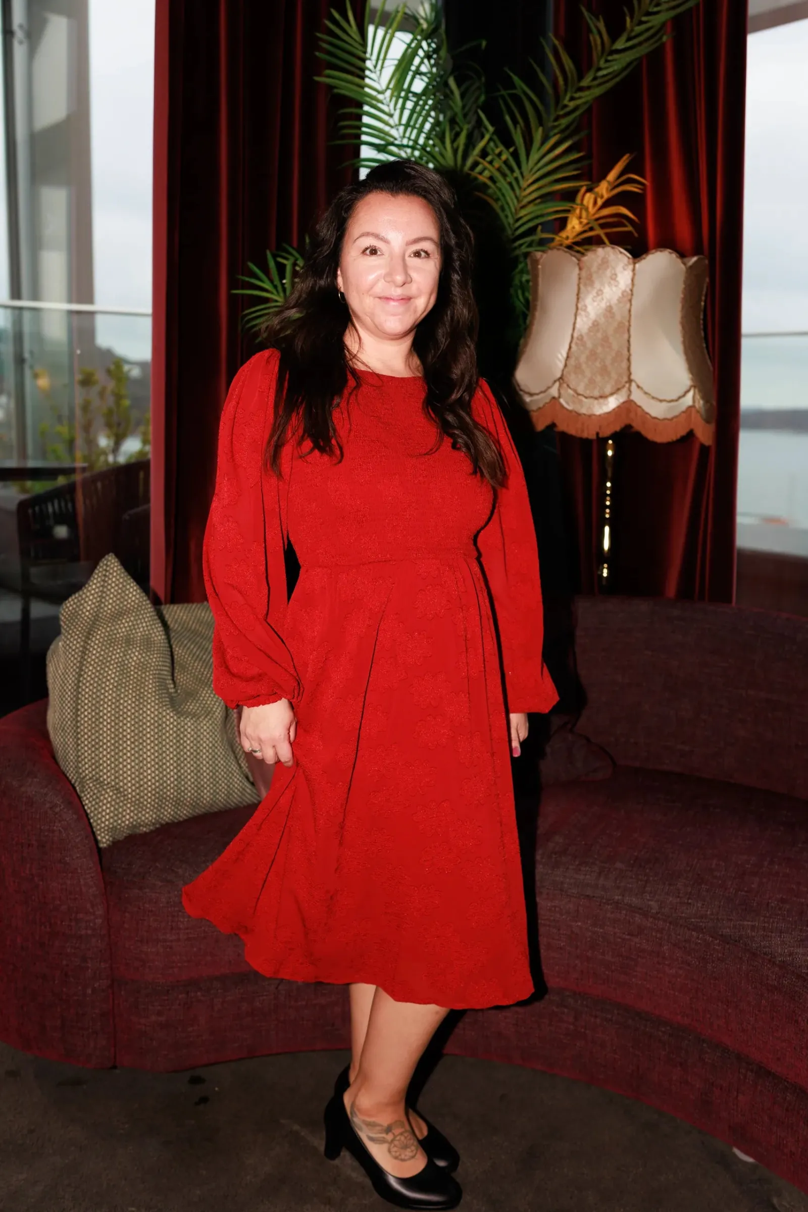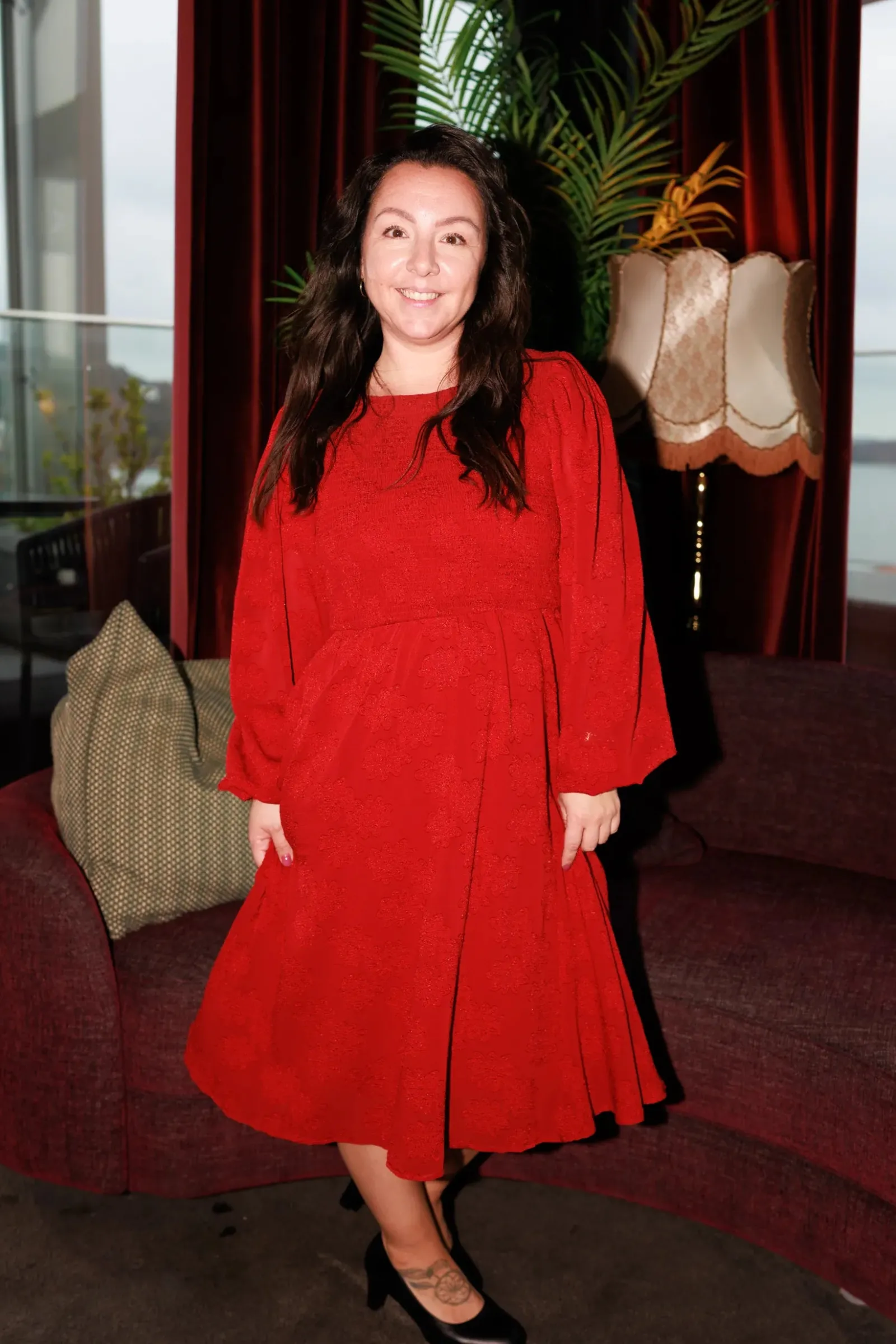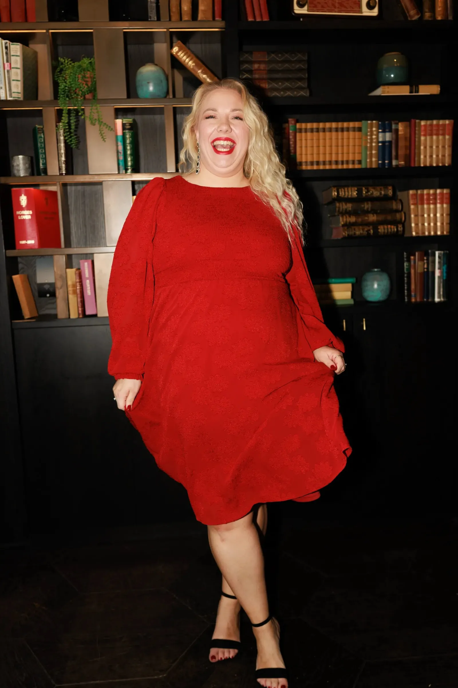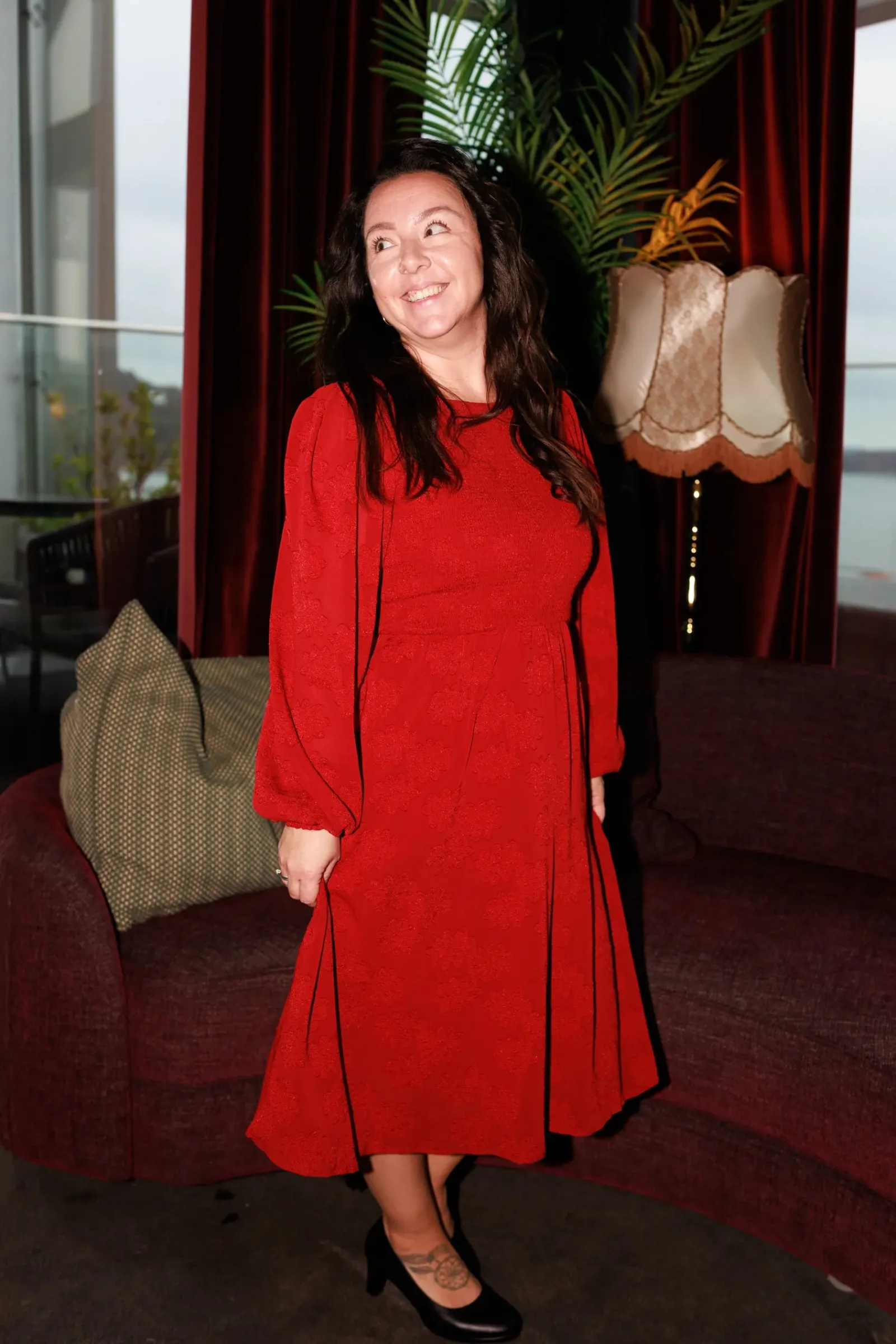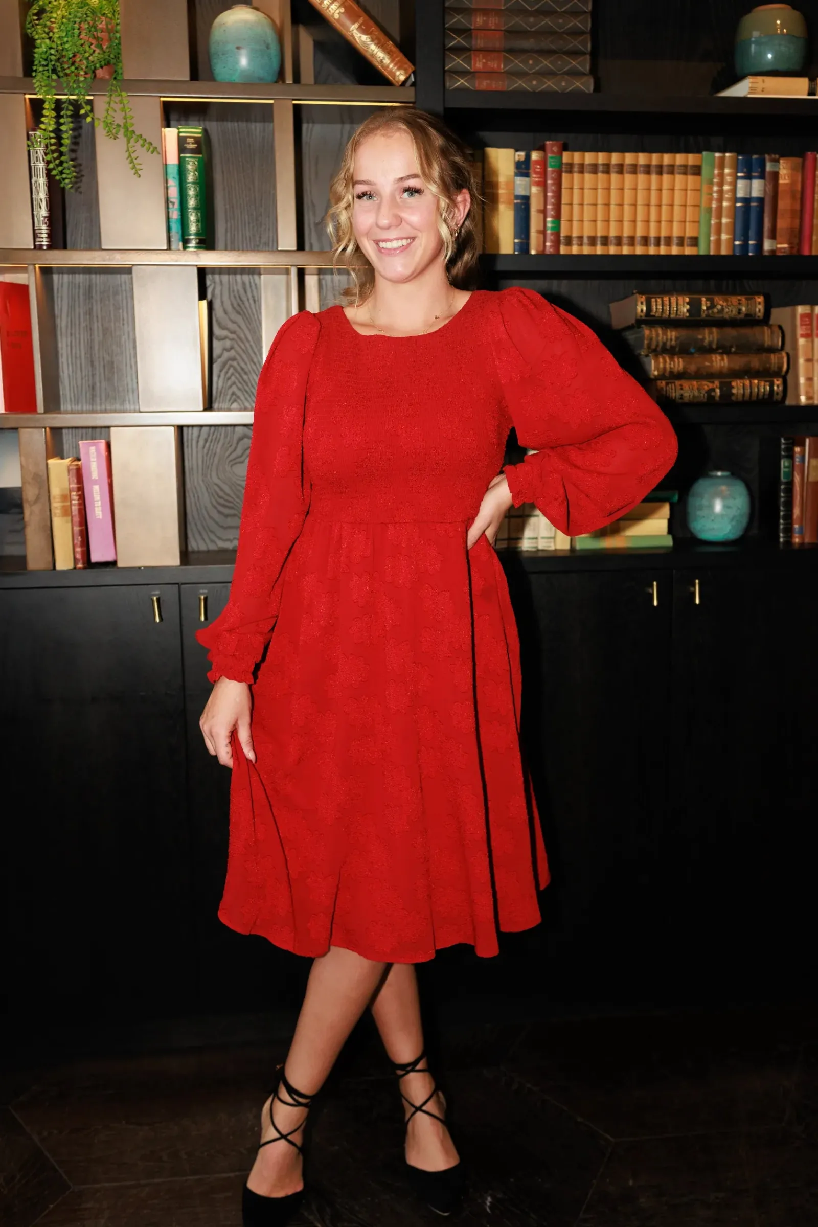Anna chiffon kjole er en nydelig kjole til sesongens finere anledninger. Den har flatterende snitt, lekre ballongermer og smock rundt hele front og rygg for en god tilpasningsevne. Praktiske lommer på begge sider.