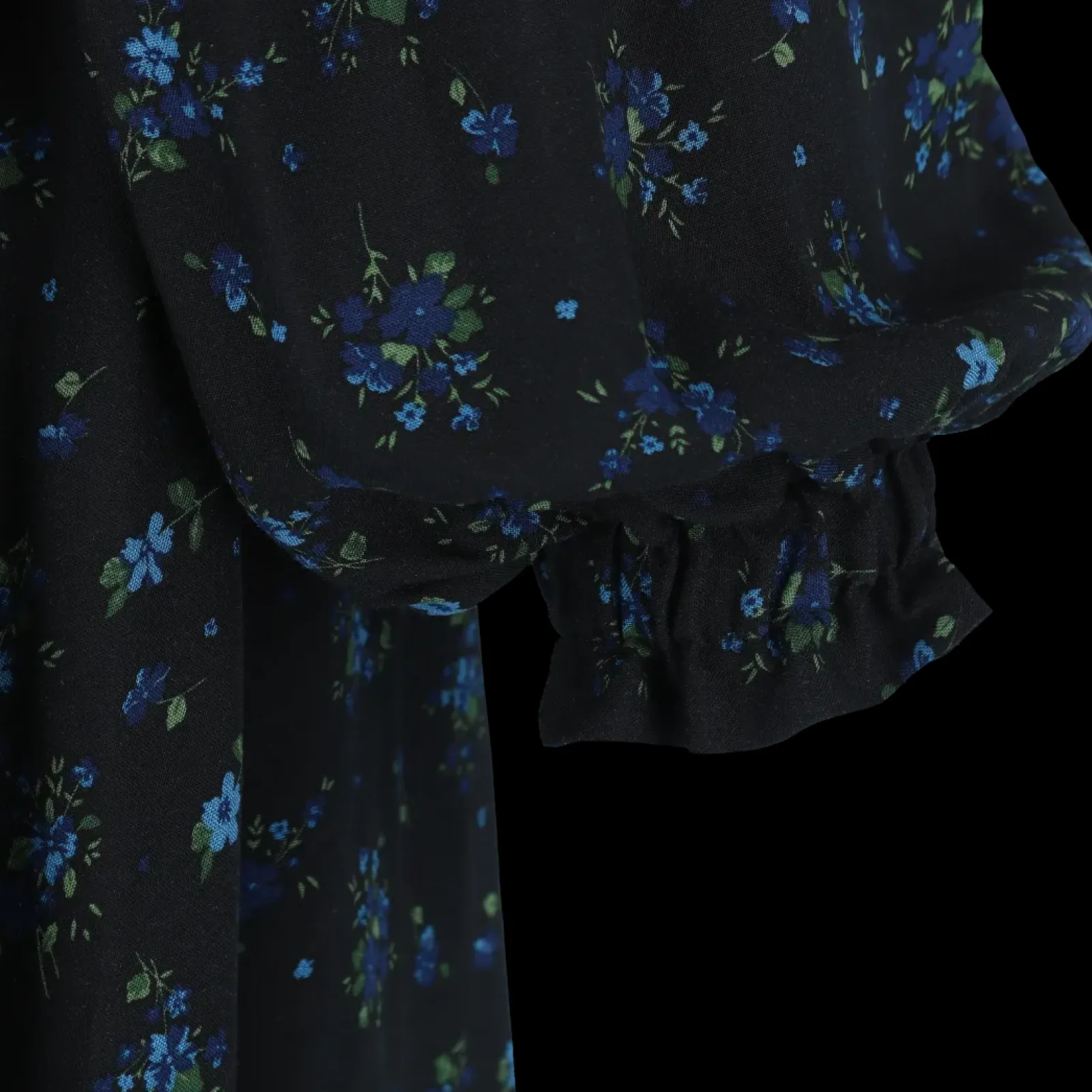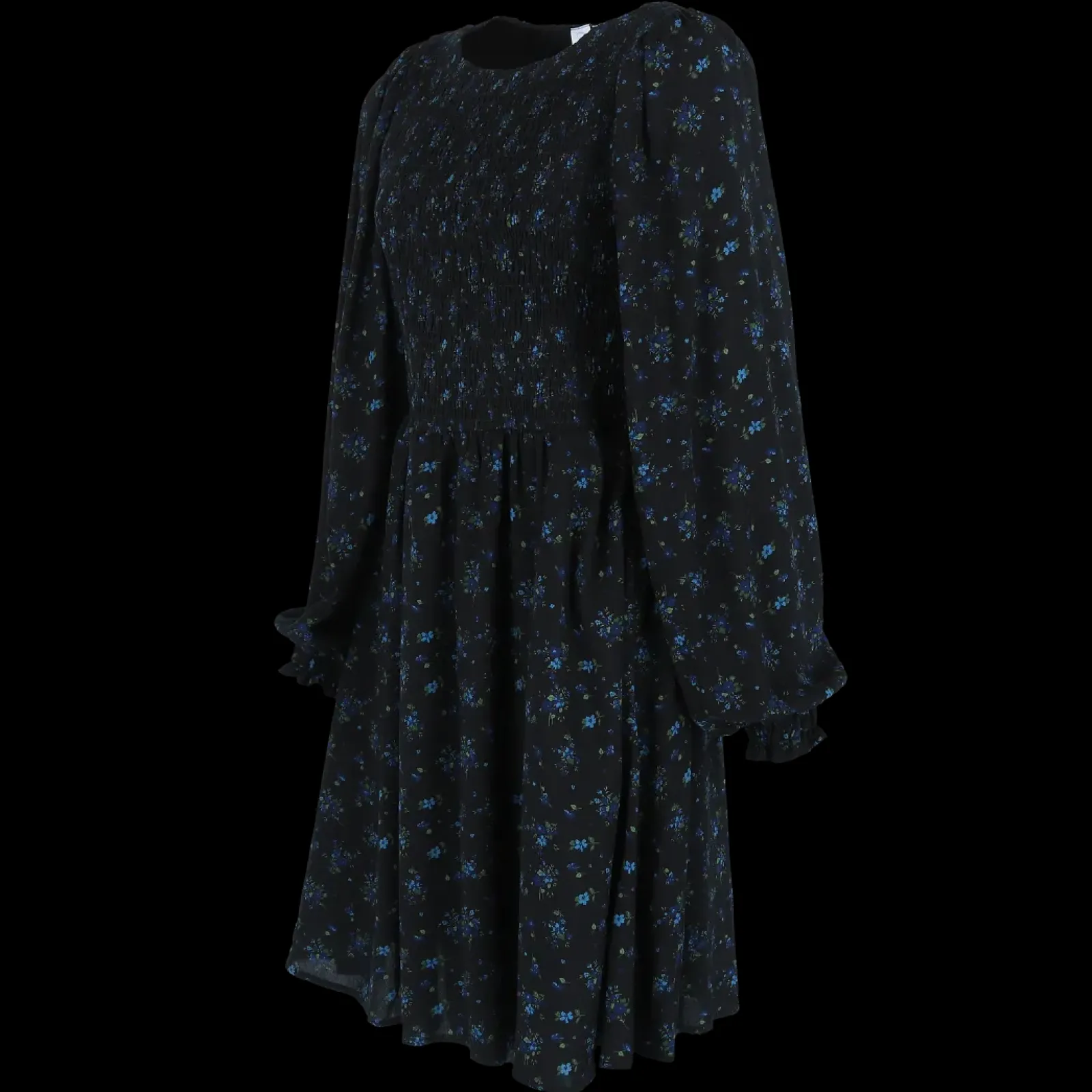 Anna kjole i mørk blå med nydelig blomstermønster som virkelig fanger blikket!