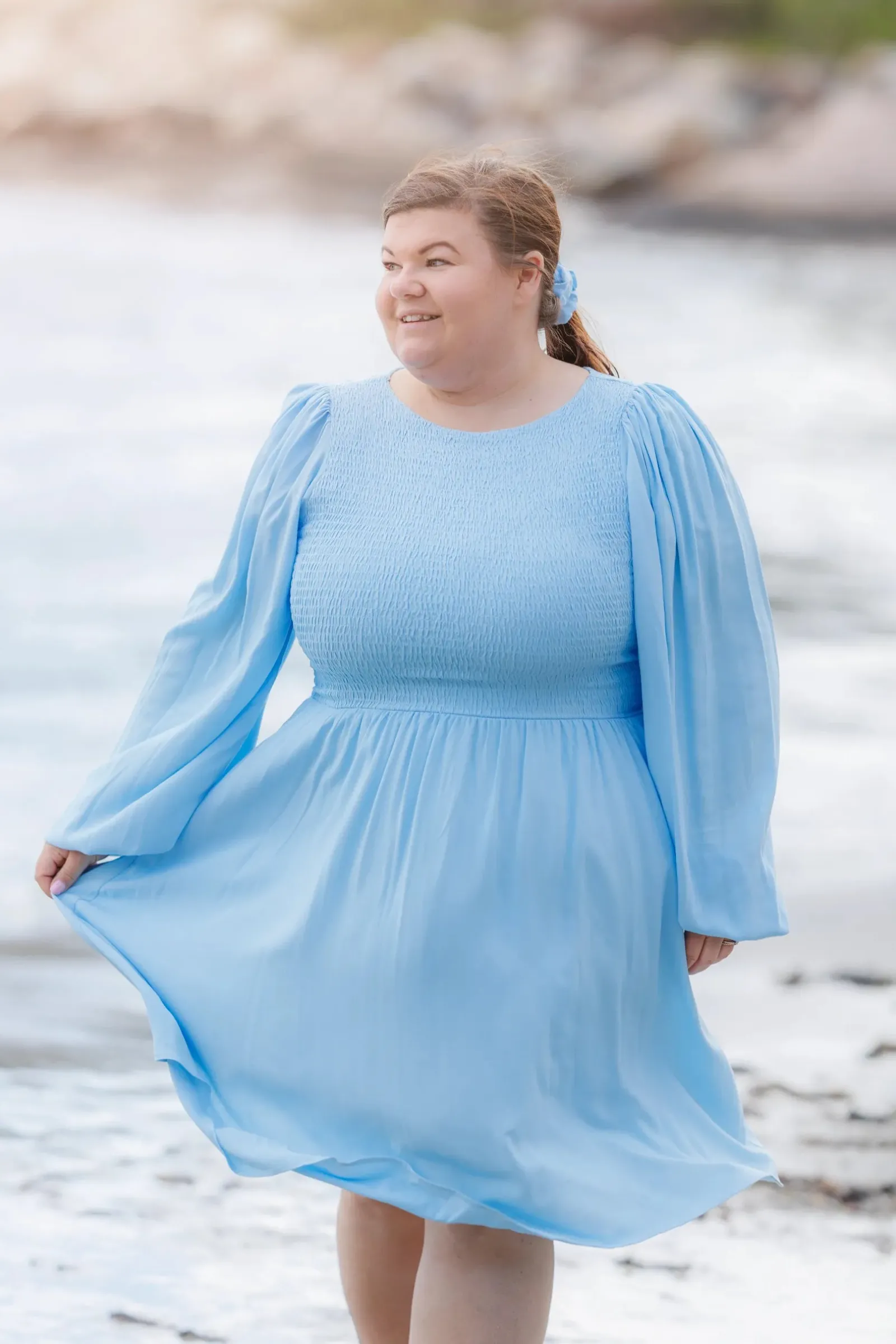 Anna avsluttes med strikk ved håndleddet og i livet. Den har også smock rundt hele front og rygg for en god tilpasningsevne. Lommer på begge sider.