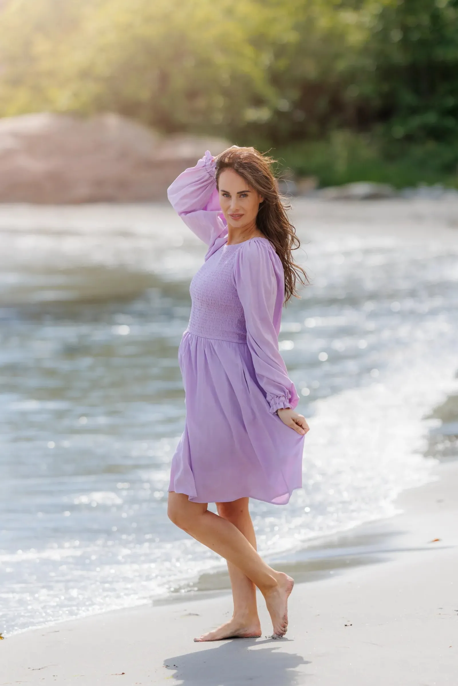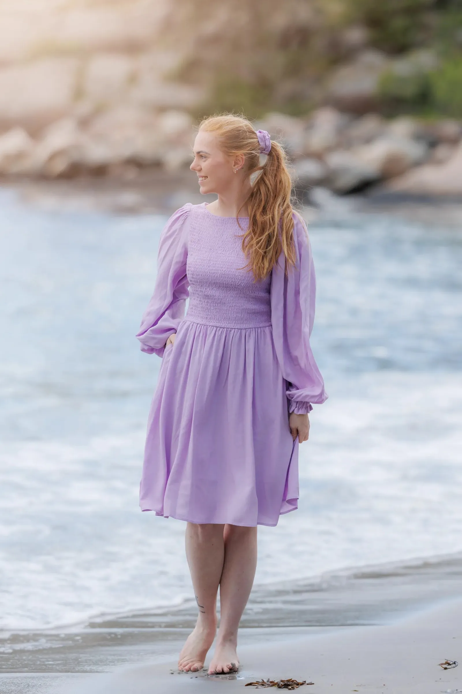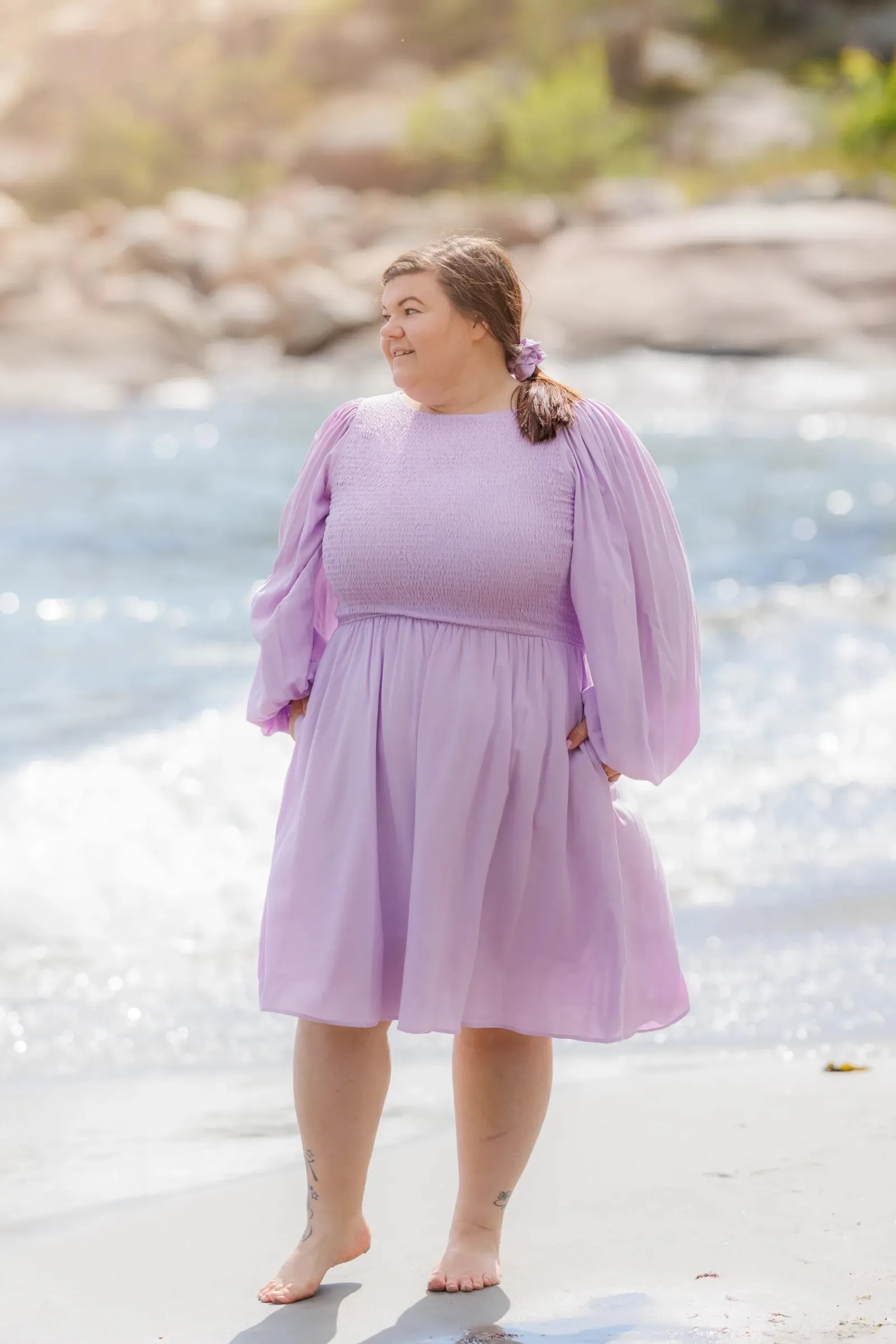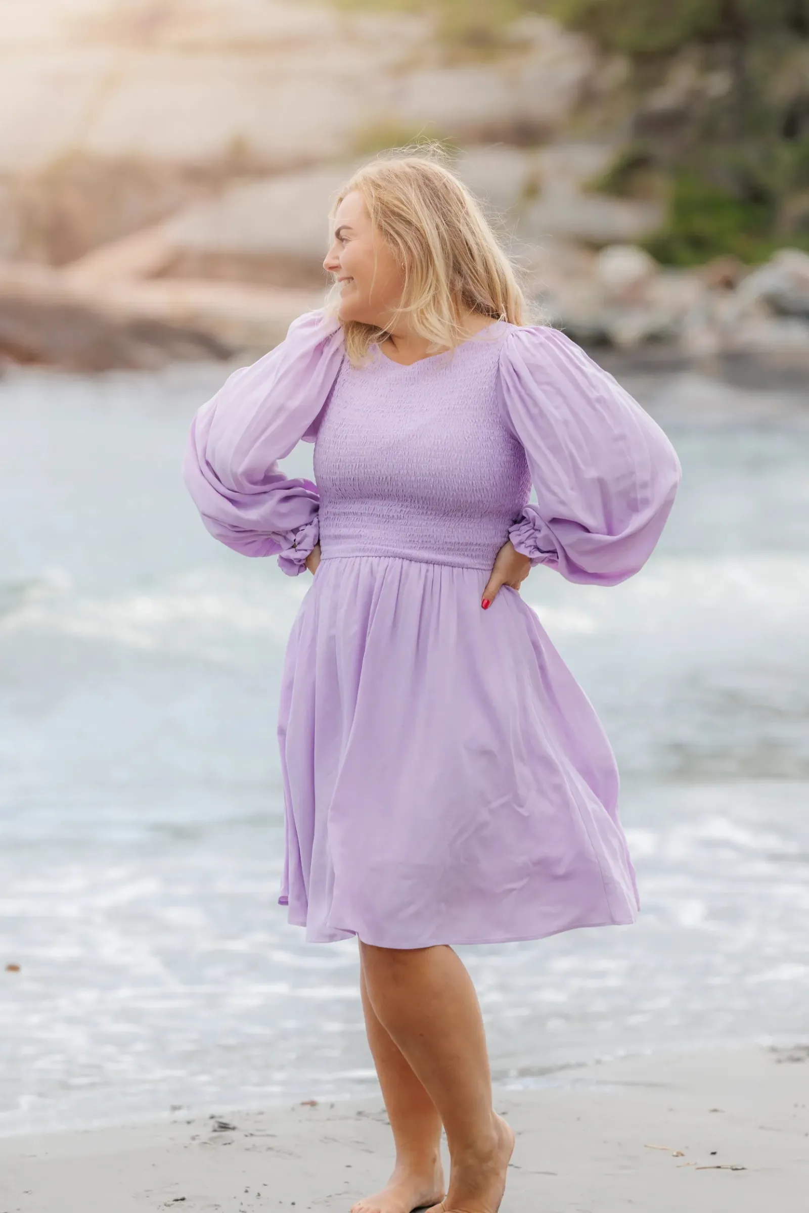 Ensfarget Anna kjole i lilla med nydelige snitt og lekre ballongermer kan den brukes både til hverdager og festdager.
