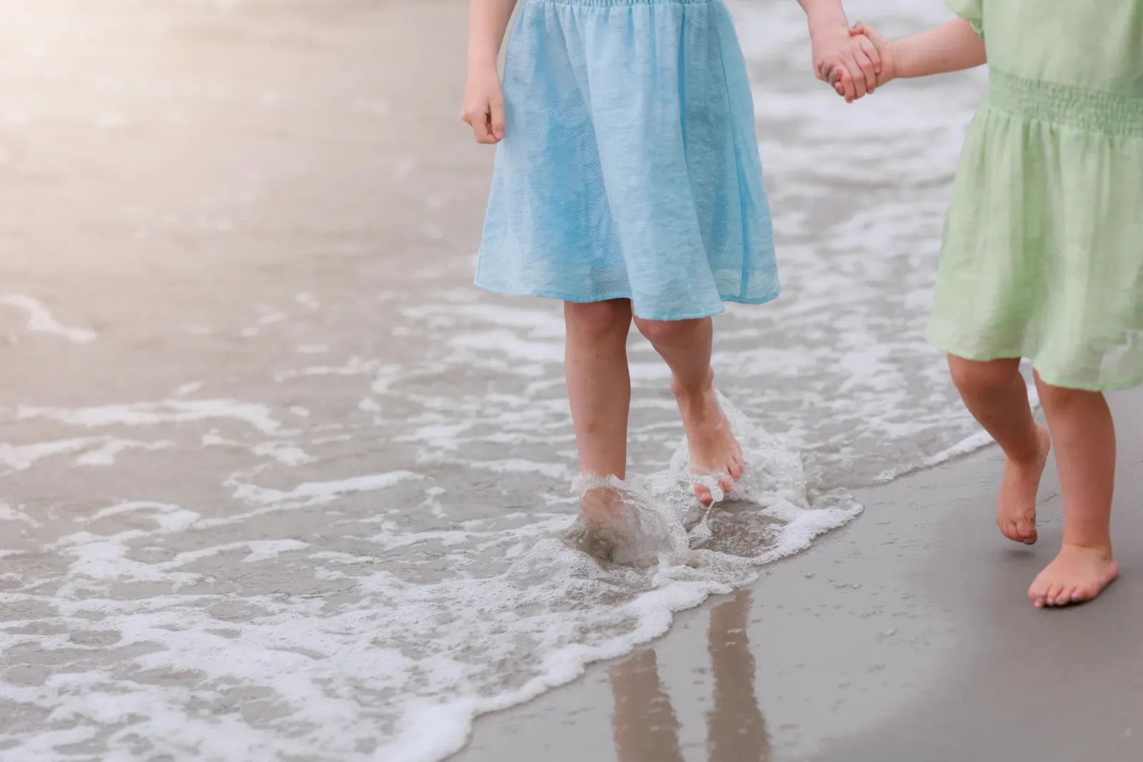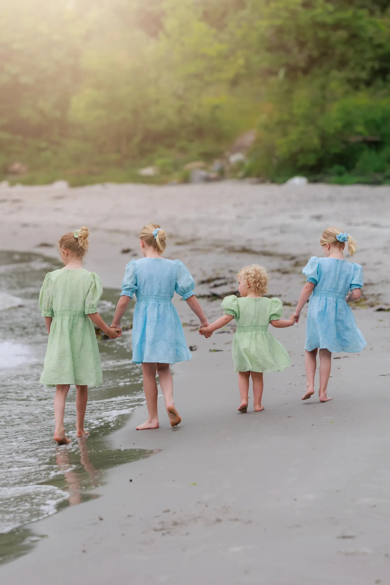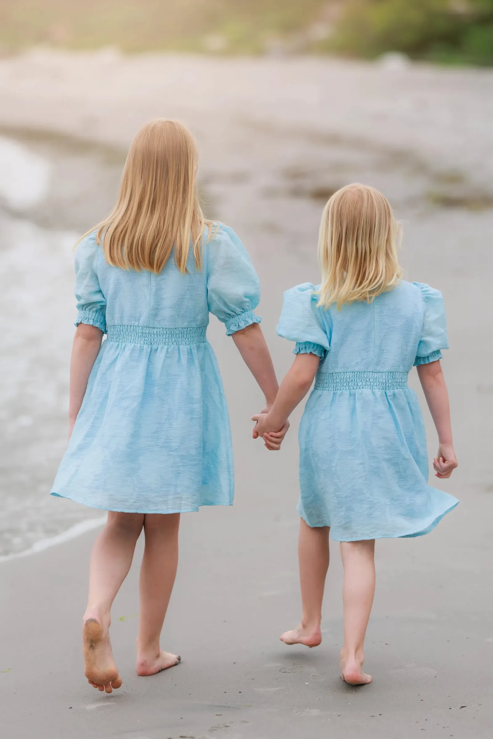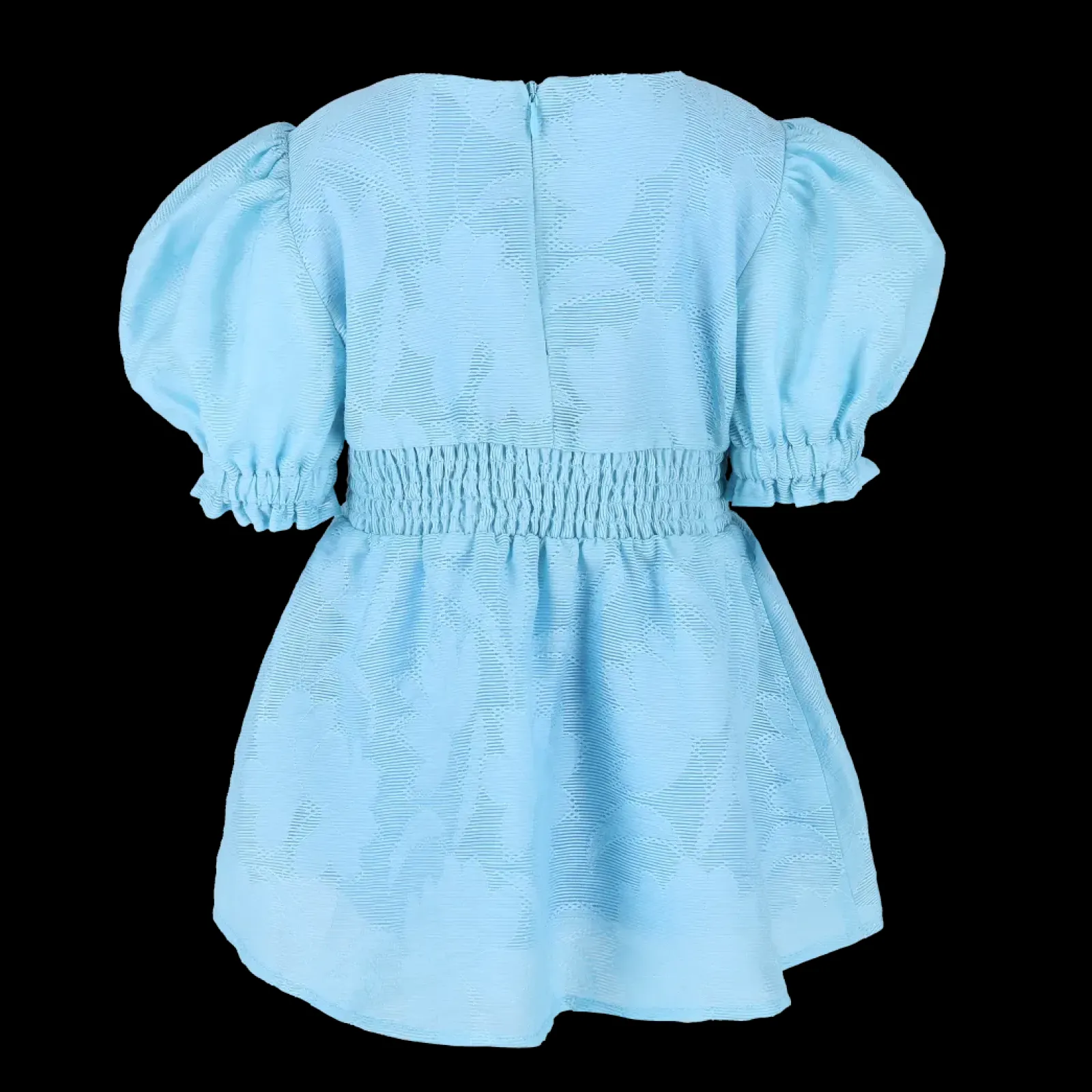 Belle Flower barnekjole i lyseblå er en nydelig, kort sommerkjole. Stoffet har tekstur av blomster og oppleves luftig. Den har korte armer med puff og strikk. I midjen er det et behagelig strikk og på hver side av hoftene er det praktiske lommer. Passer like godt til hverdagen som til finere anledninger.