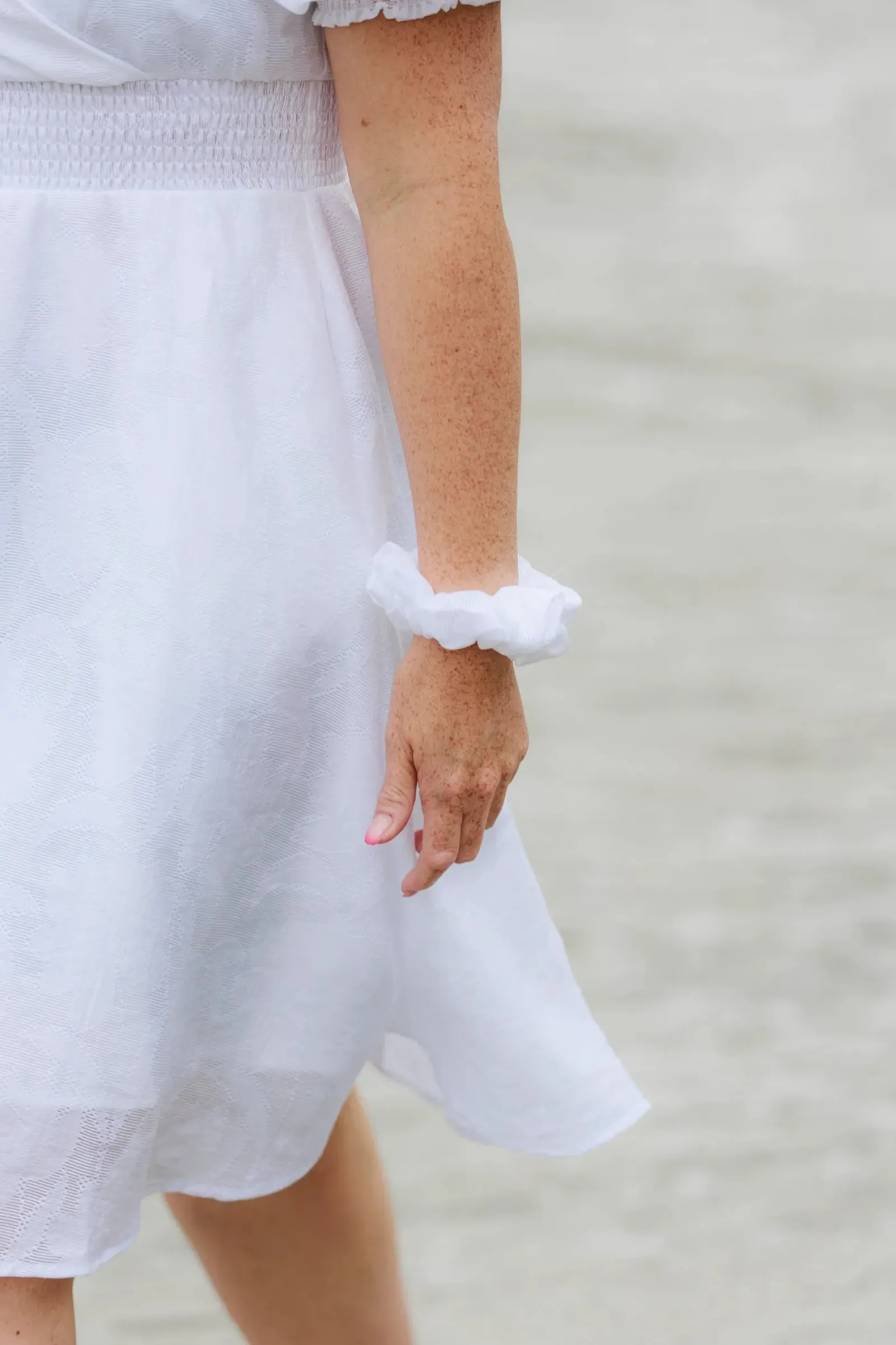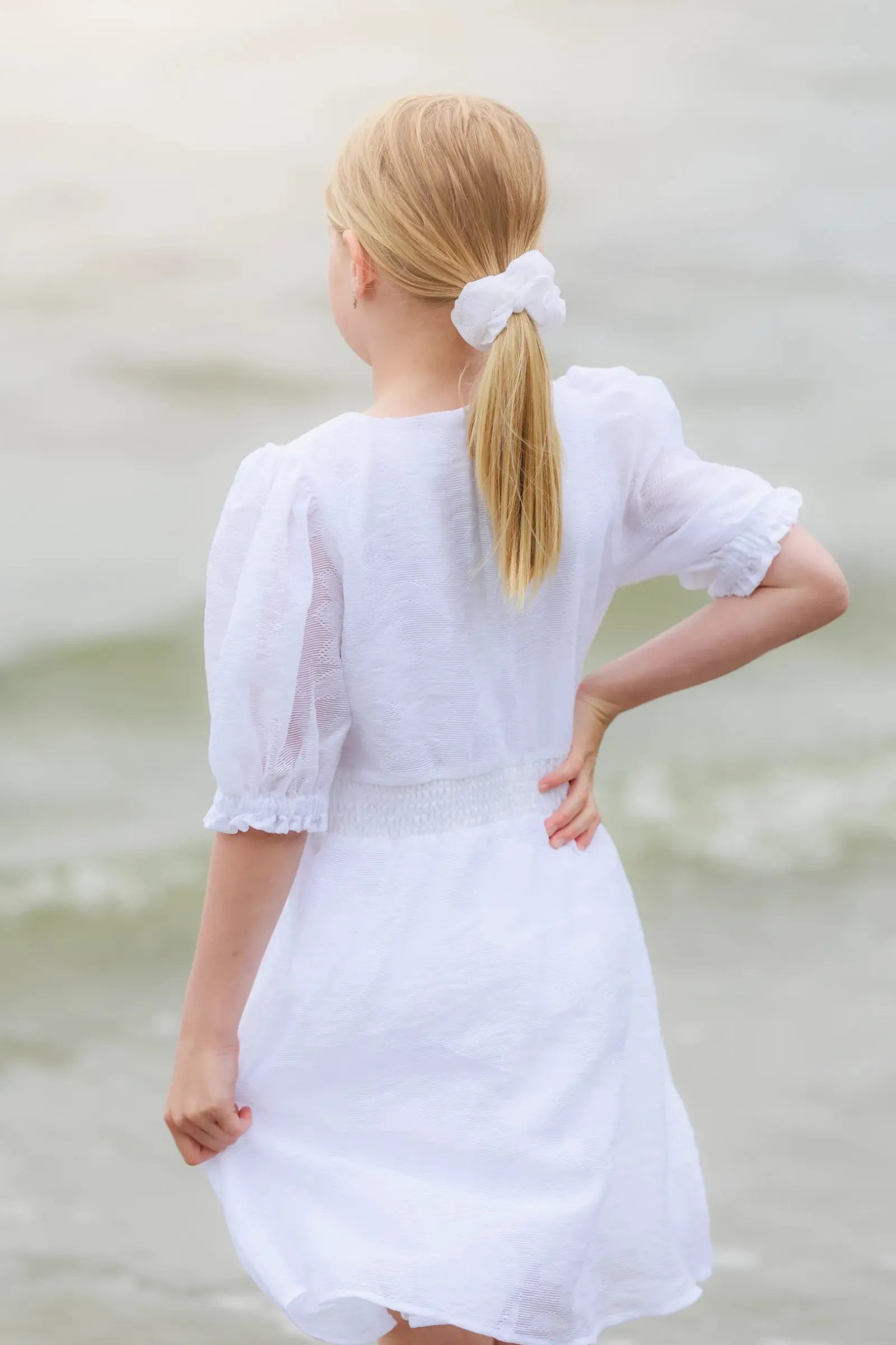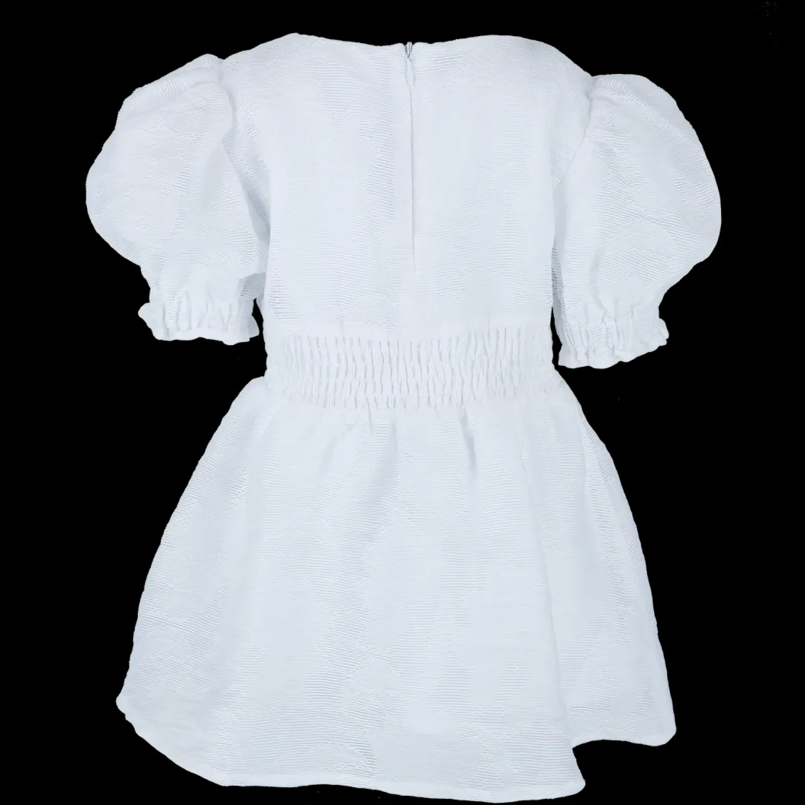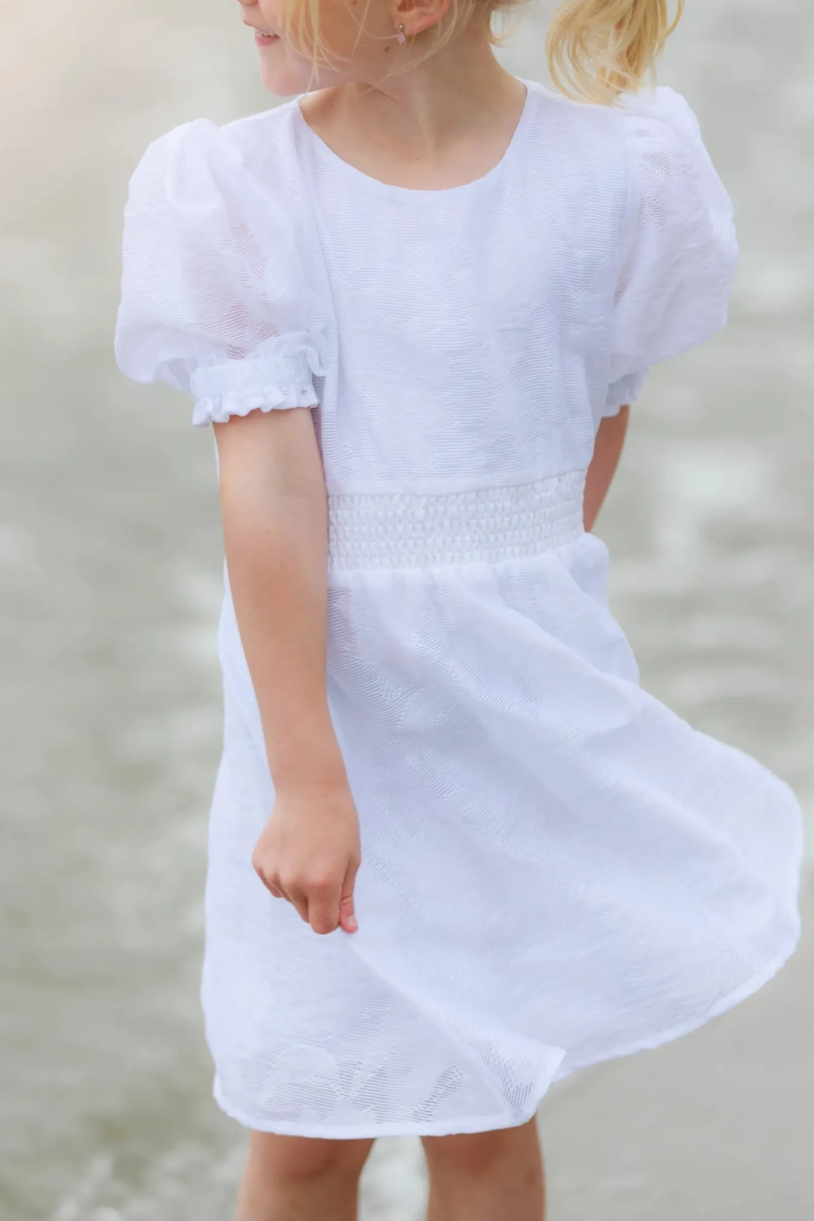 Belle Flower barnekjole i hvit er en nydelig, kort sommerkjole. Stoffet har tekstur av blomster og oppleves luftig. Den har korte armer med puff og strikk. I midjen er det et behagelig strikk og på hver side av hoftene er det praktiske lommer. Passer like godt til hverdagen som til finere anledninger.