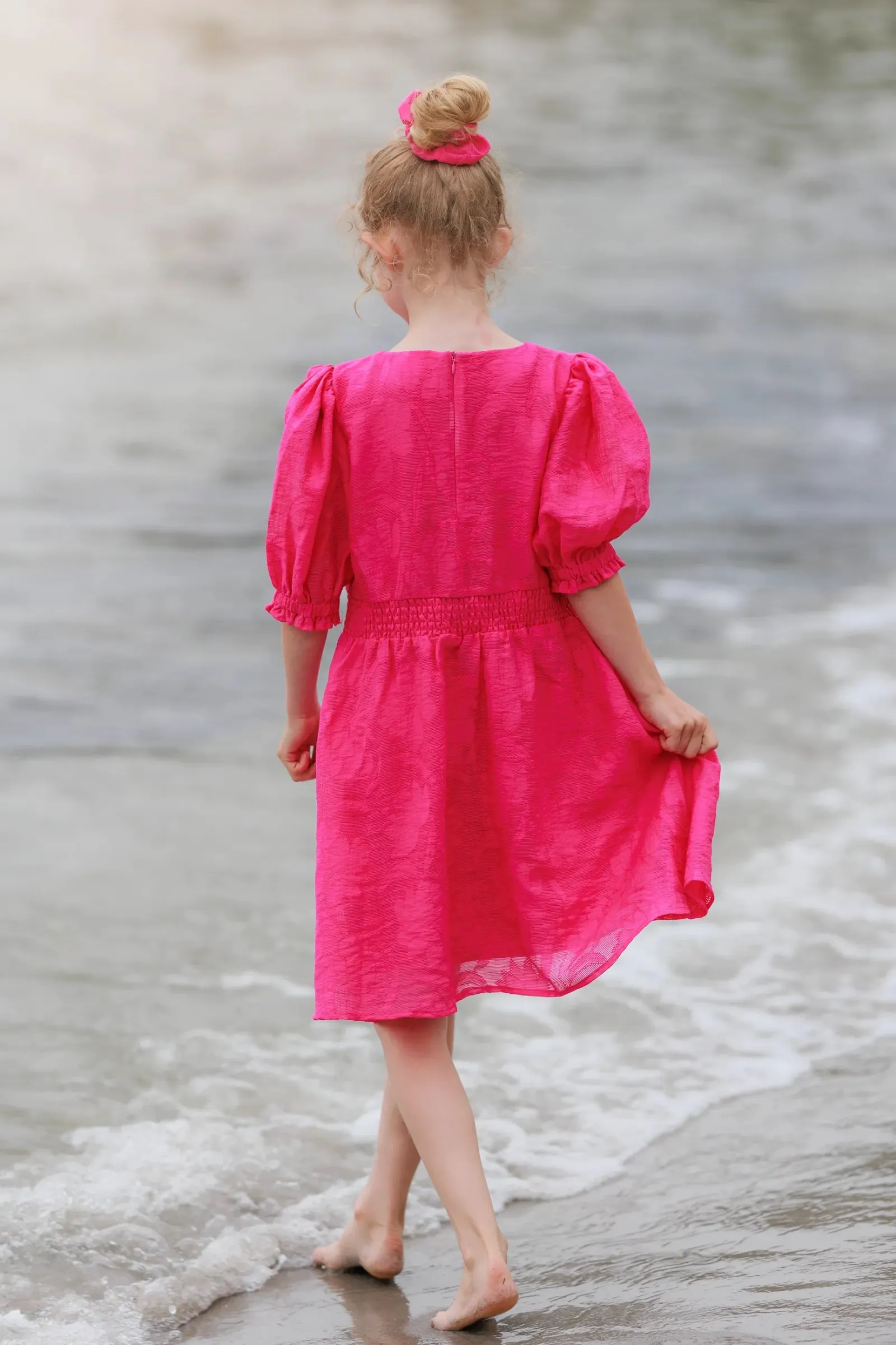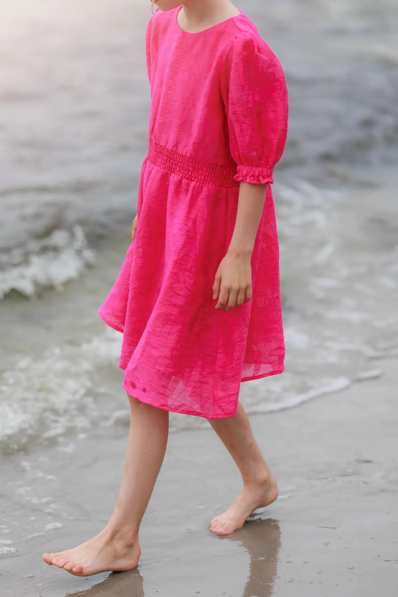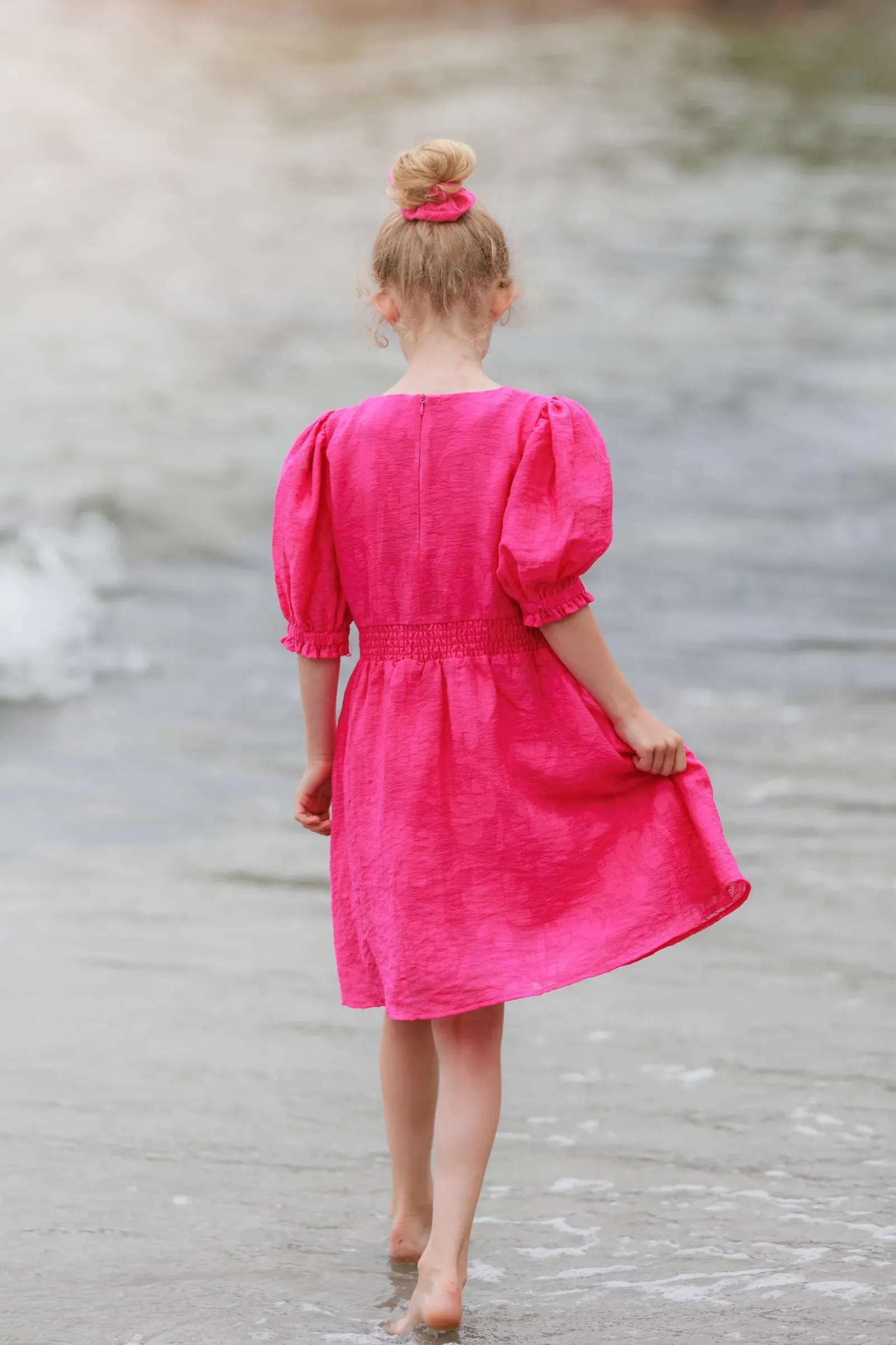 Belle Flower barnekjole i rosa er en nydelig, kort sommerkjole. Stoffet har tekstur av blomster og oppleves luftig. Den har korte armer med puff og strikk. I midjen er det et behagelig strikk og på hver side av hoftene er det praktiske lommer. Passer like godt til hverdagen som til finere anledninger.