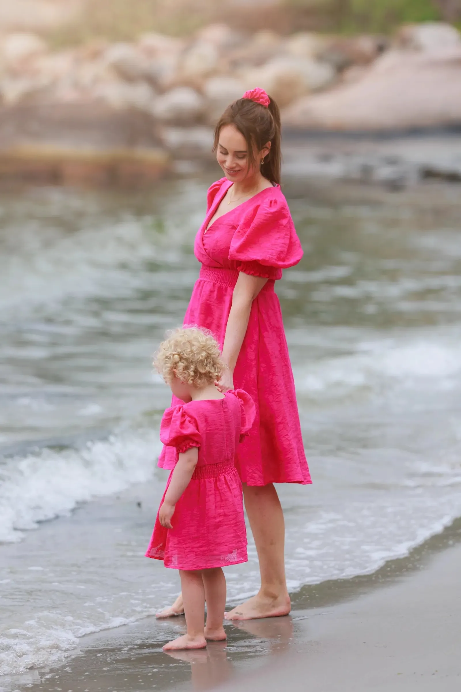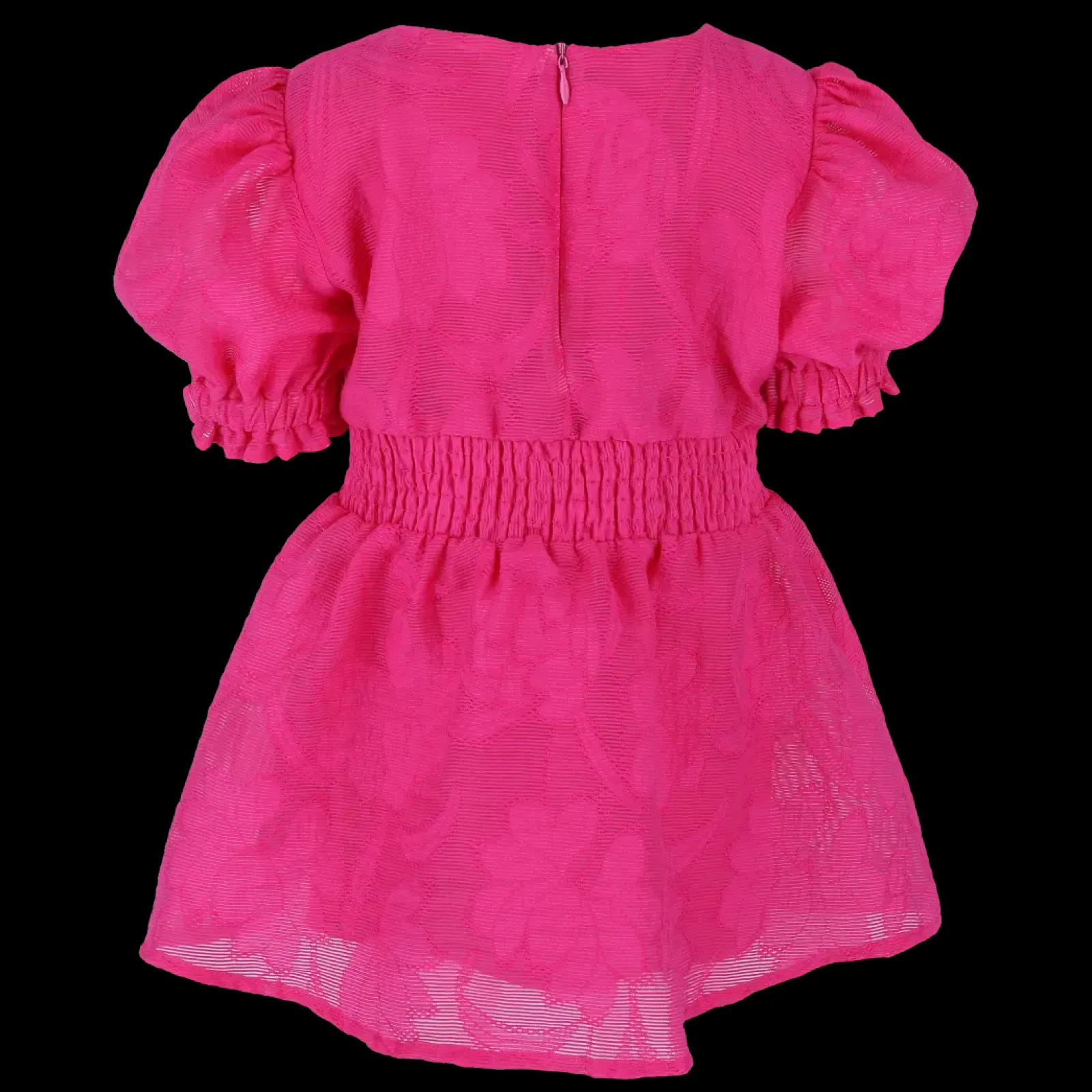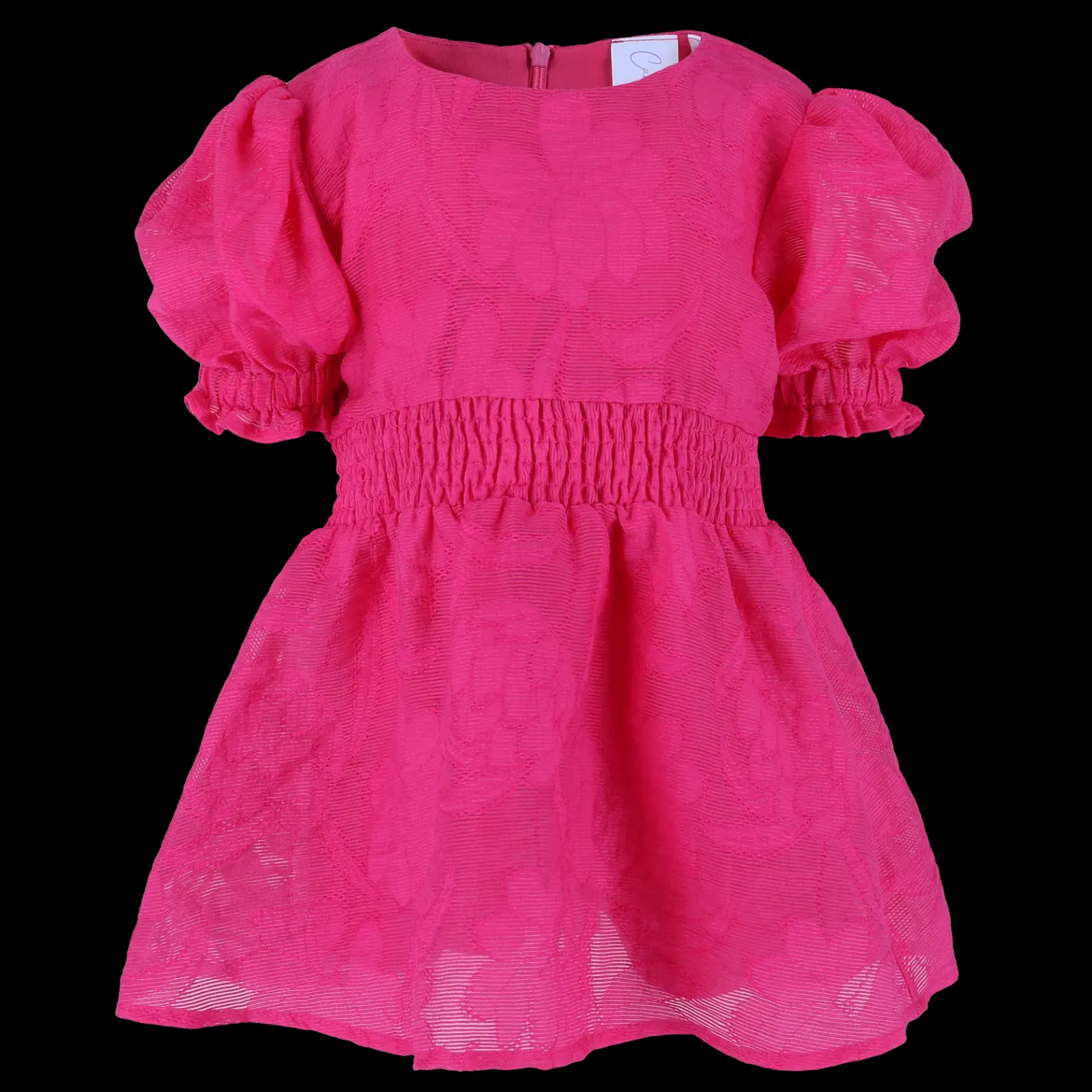 Belle Flower barnekjole i rosa er en nydelig, kort sommerkjole. Stoffet har tekstur av blomster og oppleves luftig. Den har korte armer med puff og strikk. I midjen er det et behagelig strikk og på hver side av hoftene er det praktiske lommer. Passer like godt til hverdagen som til finere anledninger.