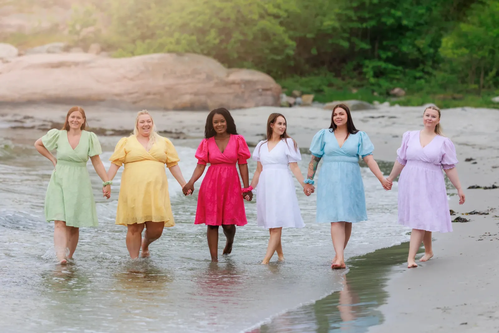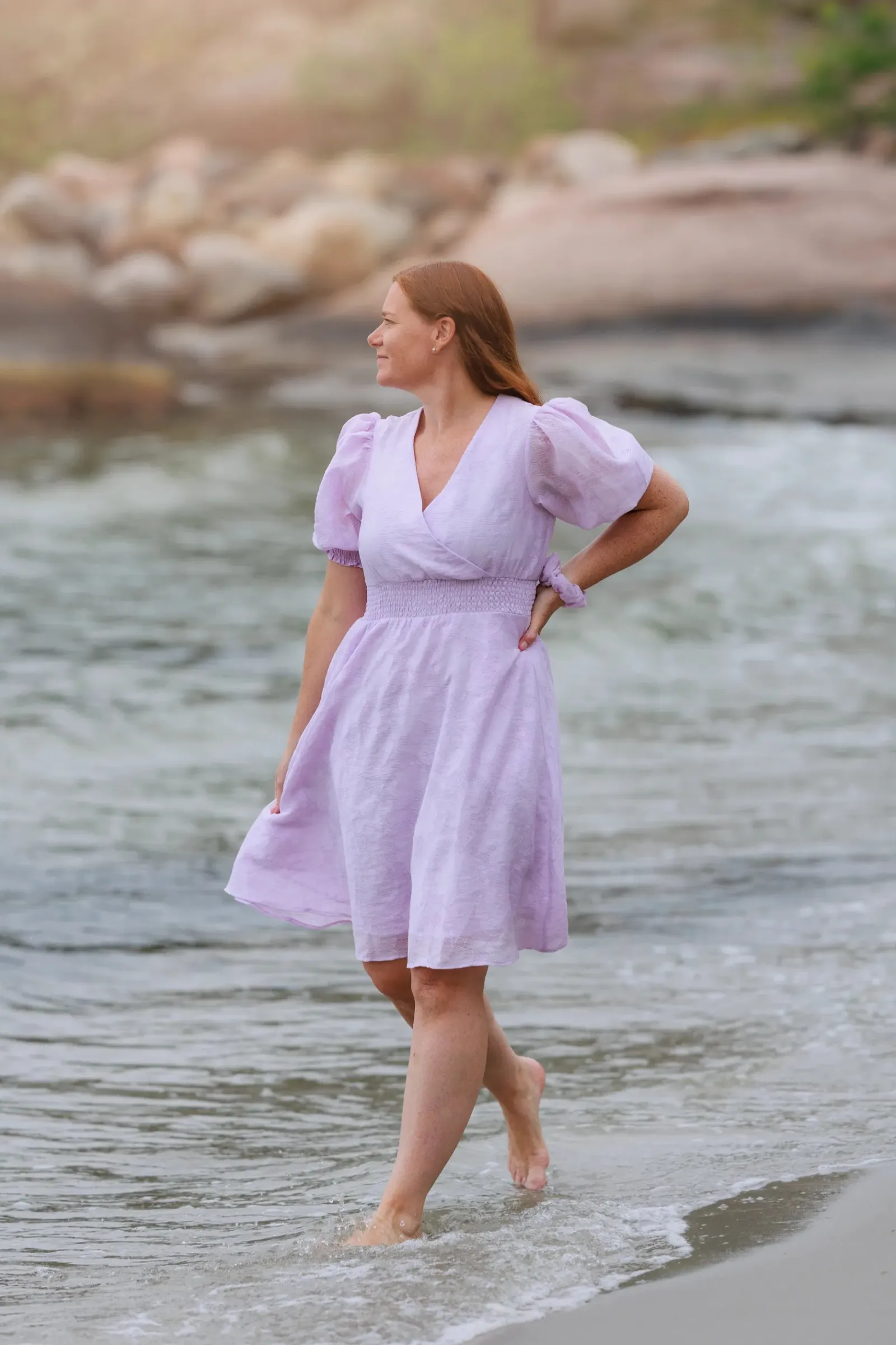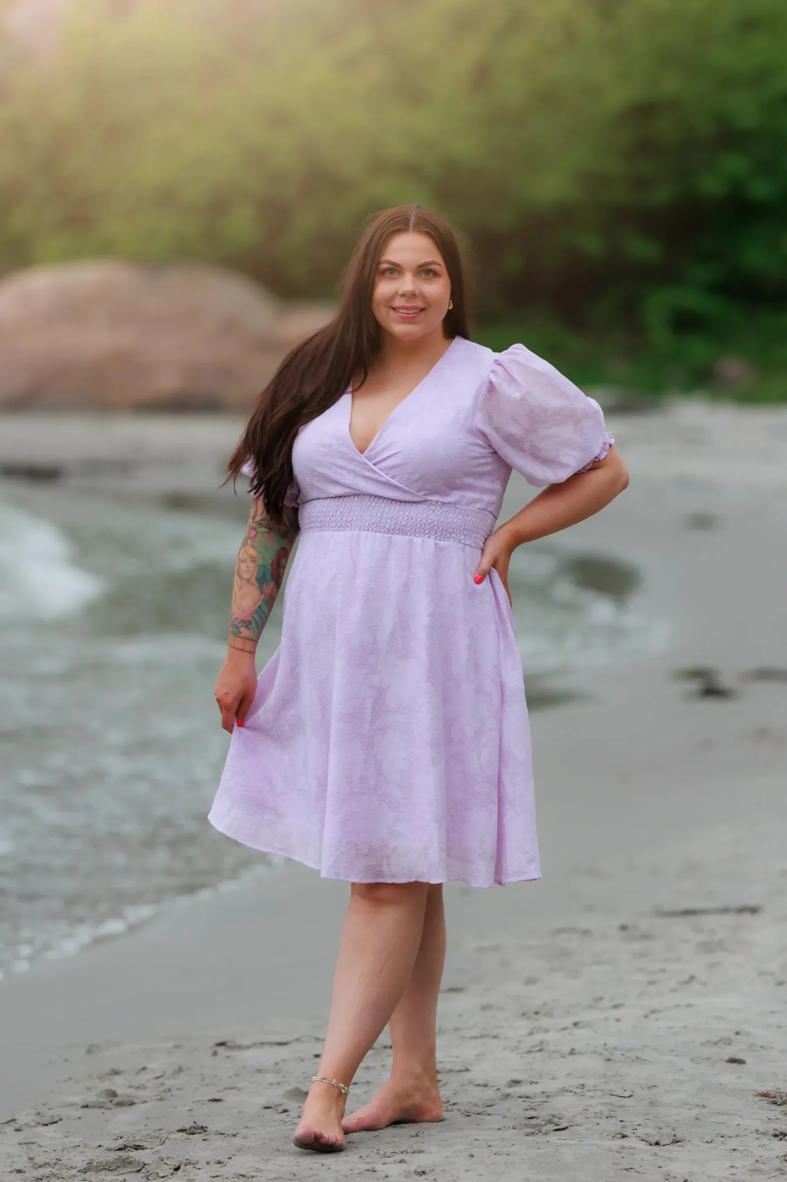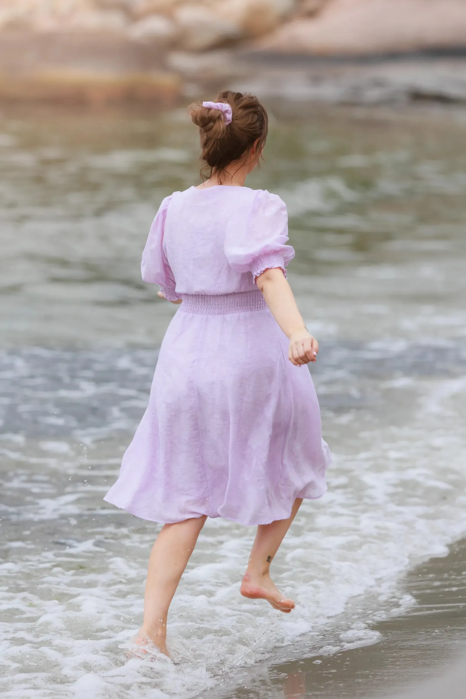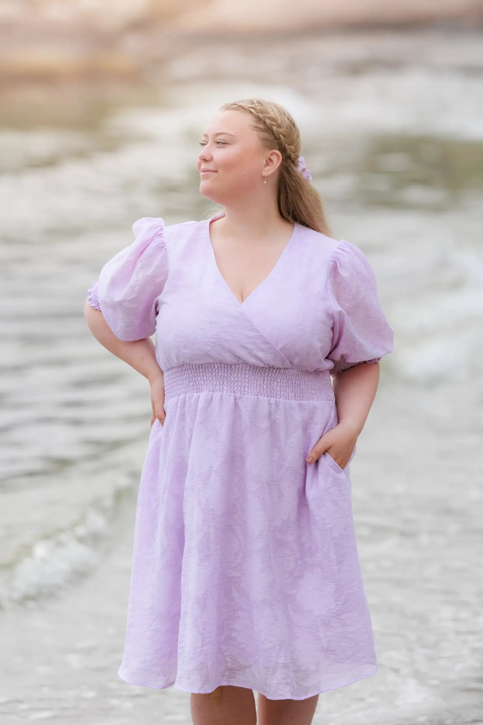 Belle Flower kjole i lilla er en nydelig, kort sommerkjole. Stoffet har tekstur av blomster og oppleves luftig. Den har korte armer med puff og strikk. I midjen er det et behagelig strikk som gir en flatterende passform. På hver side av hoftene er det praktiske lommer. Passer like godt til hverdagen som til finere anledninger.